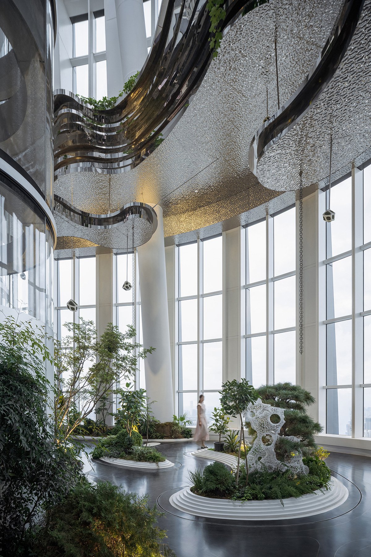 Duality is Dynamics: On the 55th floor, a 120-sqm outdoor space, 25 meters high. Inspired by the idea of duality, we paired the “iceberg” with a “green heart”—a green garden. Duality also put me off recreating a classical Chinese garden like the one we planned for Shanghai Center. Instead, we deconstructed one, drawing inspiration from Yu Garden, and reassembled it as a suspended garden in a vertical way.
