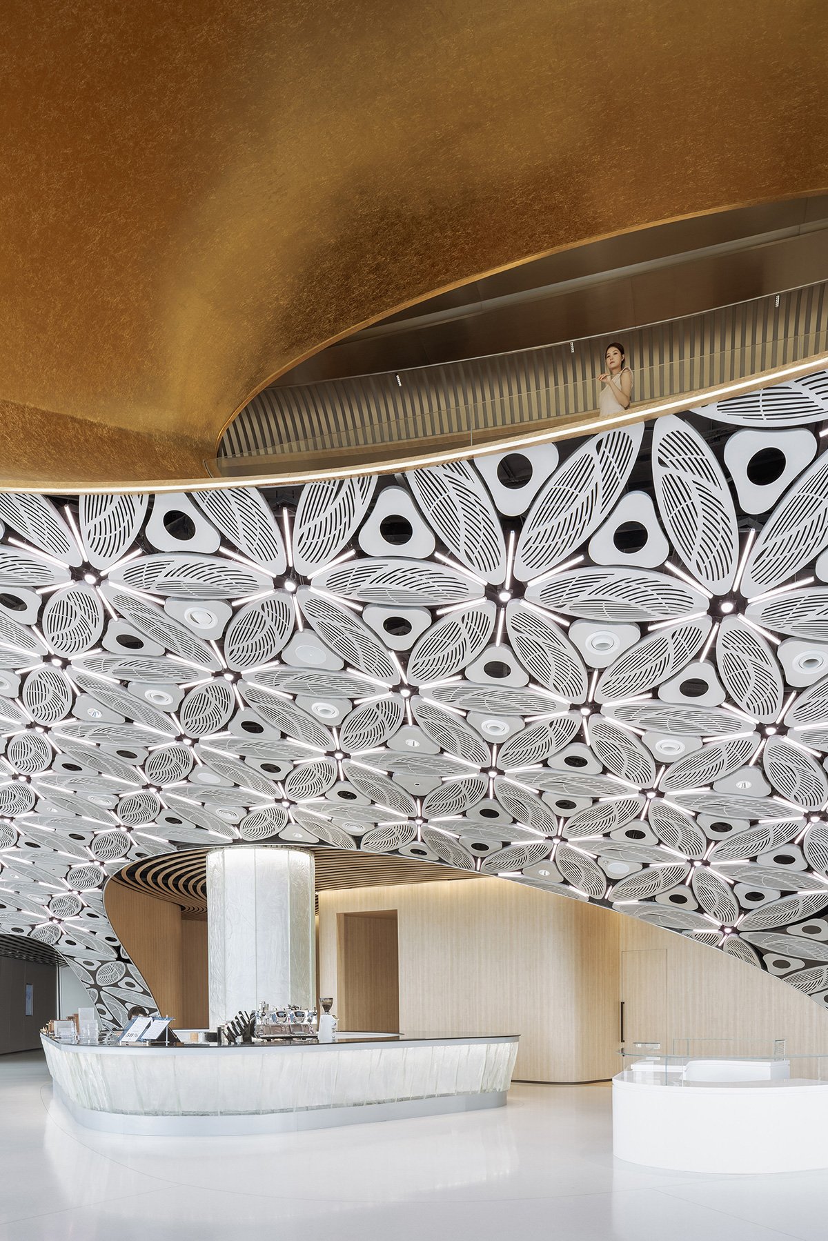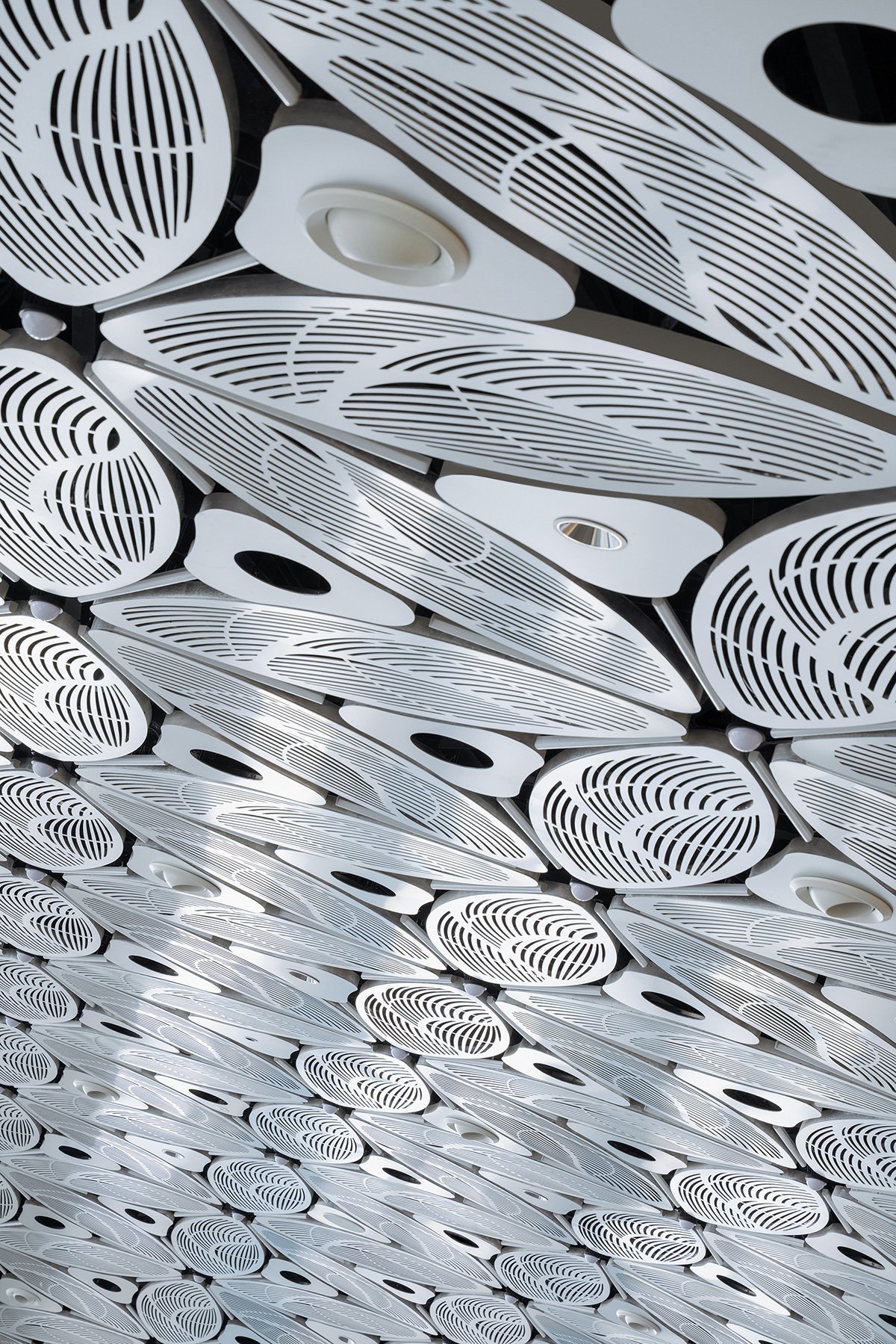 Suddenly, a bold idea struck me: why not turn all of it into a pattern, using computational technology to integrate these various openings and devices? Inspired by the link between ice and snow, we developed a six-petal snowflake motif, translated into 1,100 grass leaf shaped perforated anodized aluminum panels. Together, they form a continuous, expansive ceiling pattern that incorporates all technical elements.