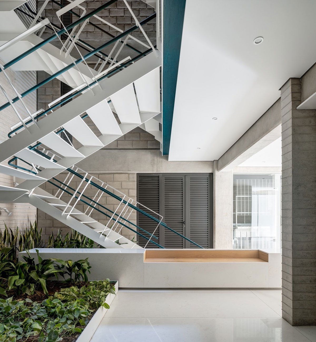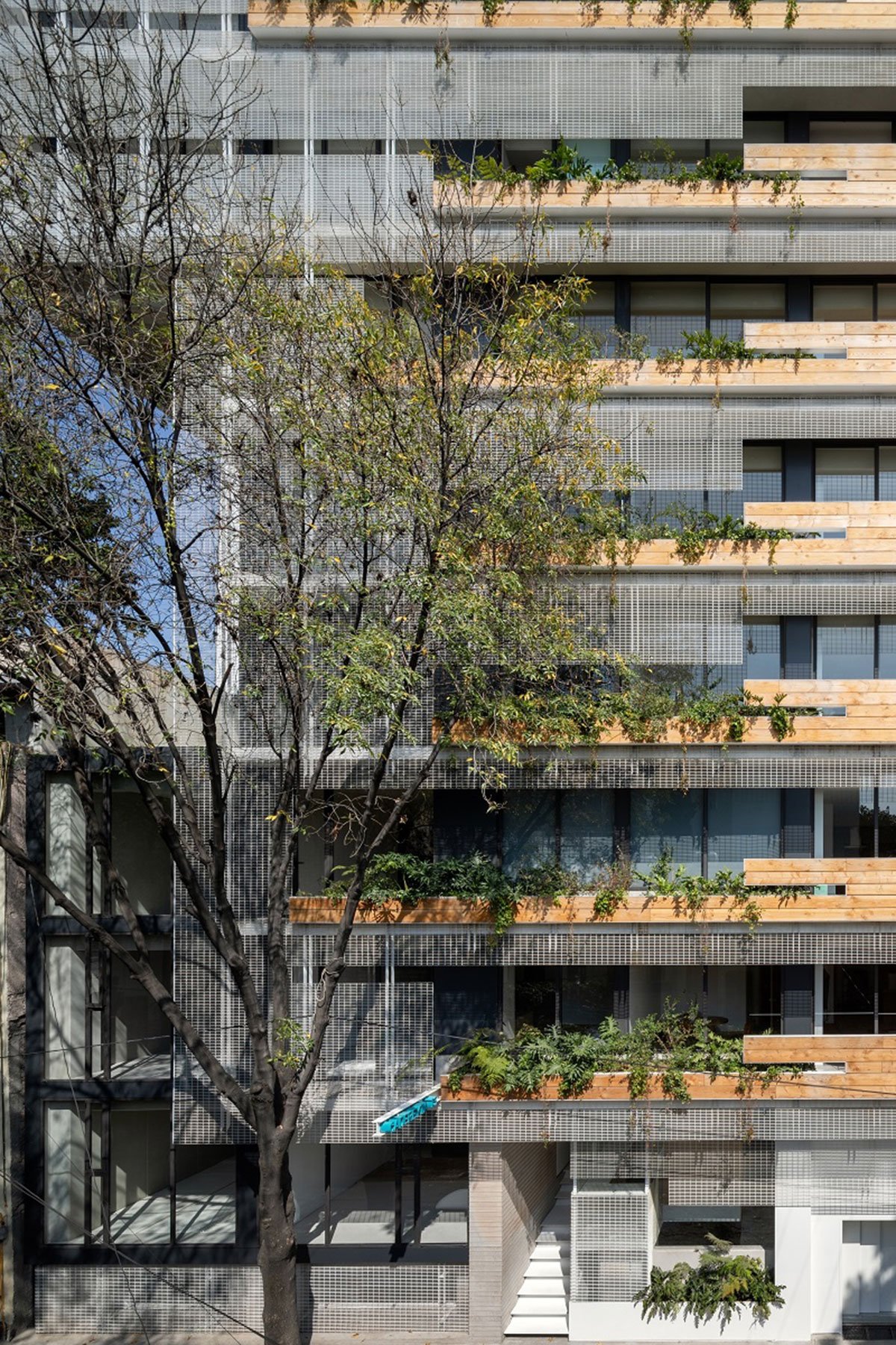 The façade is composed by balconies and terraces with plants–in pots that are integrated to the structure, an Irving wrought iron screen, and sober framings. The facade coexists with its surroundings and the trees that face the street. The vegetation of the city intertwines with that sprouting from the building creating a harmonious experience with the outside, both for the user and the building.