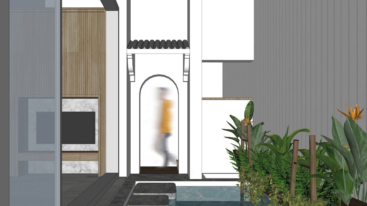 We design this house with 3 floors for collective living spaces (public). The first floor is for guests, the mezzanine is for kitchen and dining room, 4th floor is the floor with many functions (altar room, study room, bedroom for guests). The 4th floor is designed with a small tropical garden, that is connected to the study room and the altar room with the transition space is the eaves, which is also a place for homeowners to drink tea and meditate in the early morning and evening or for the special guests.