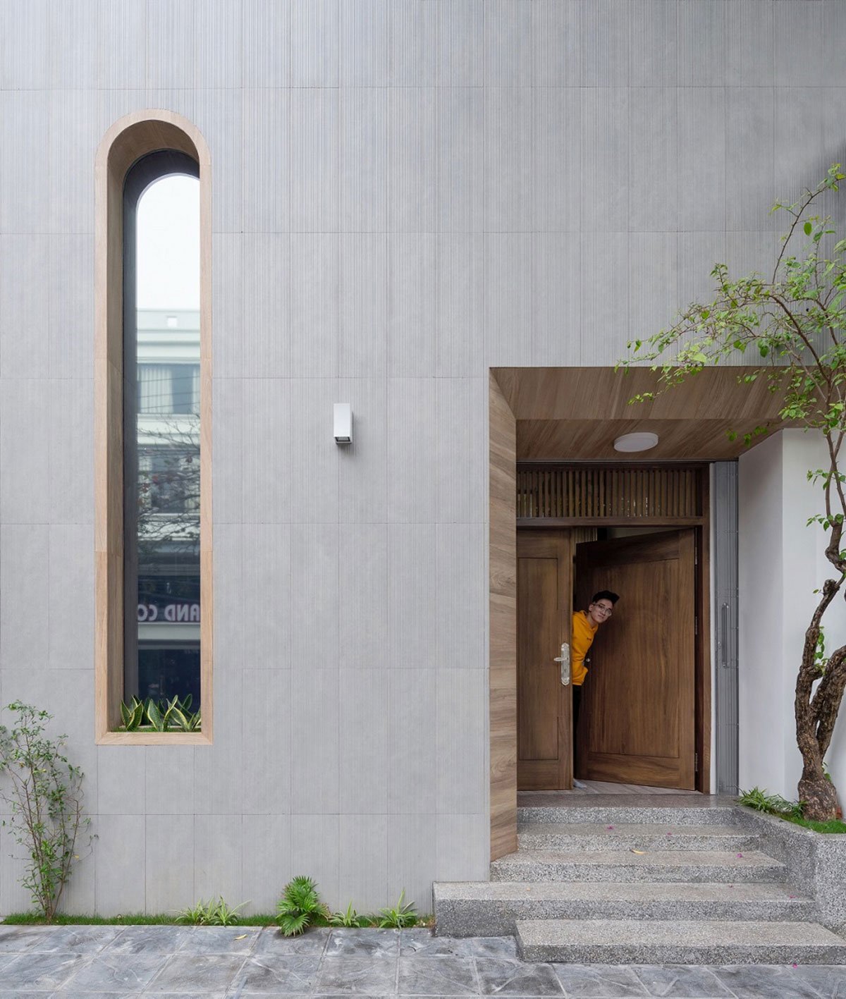 [Text as submitted by the Architect] This house is built on a land plot of 9m wide x 11m deep, near the intersection (traffic light) of the large street where many of vehicles. We design by creating a box block with a minimalist front and started cutting (sculpting) the windows and logia positions to get the light for the rooms inside. “Drop” inside this minimalist and modern box is the Traditional block space with many roofs, small gates. Like “curling” a street into a vertical direction.