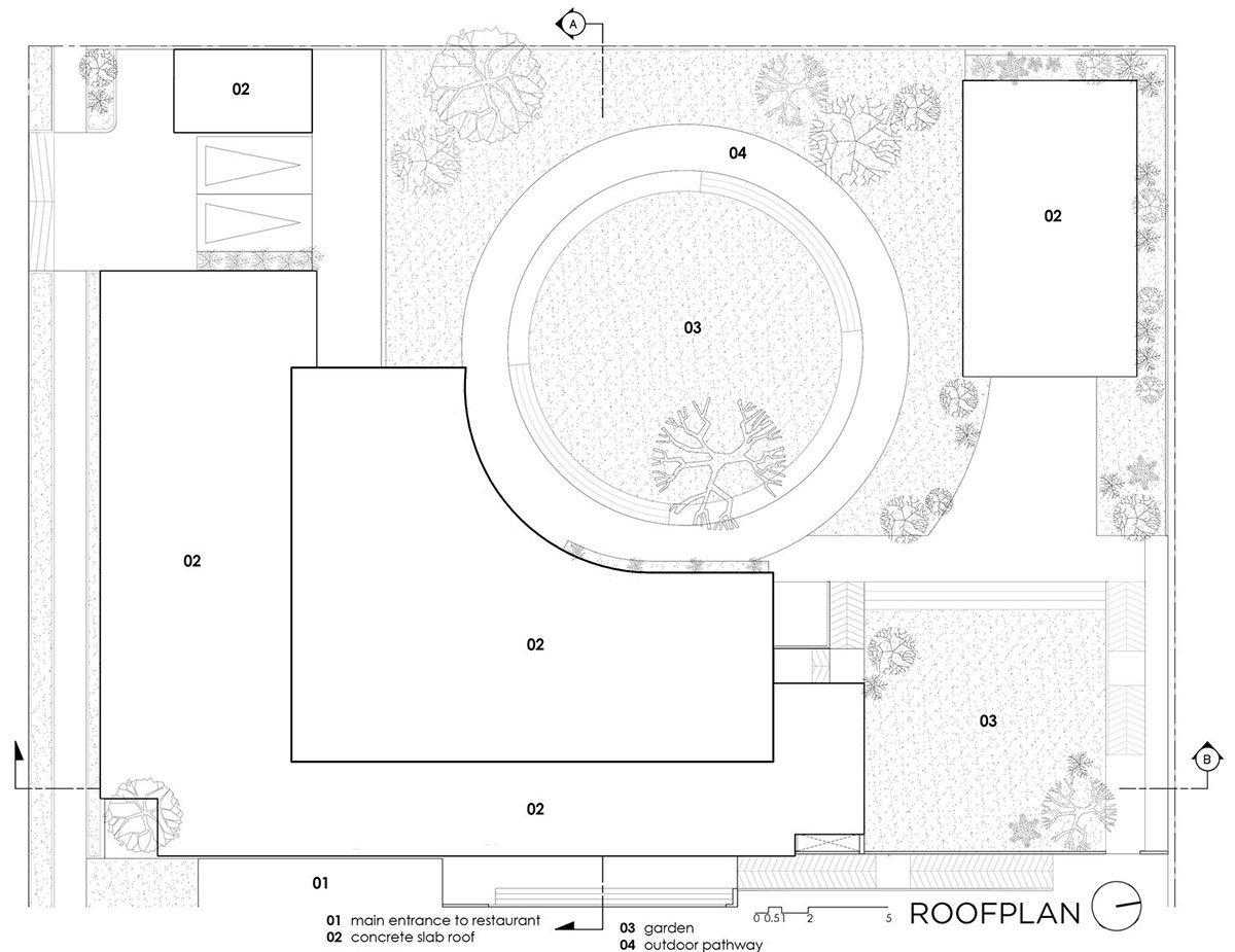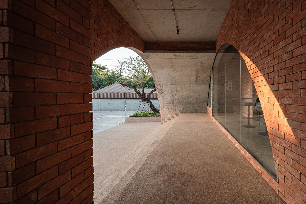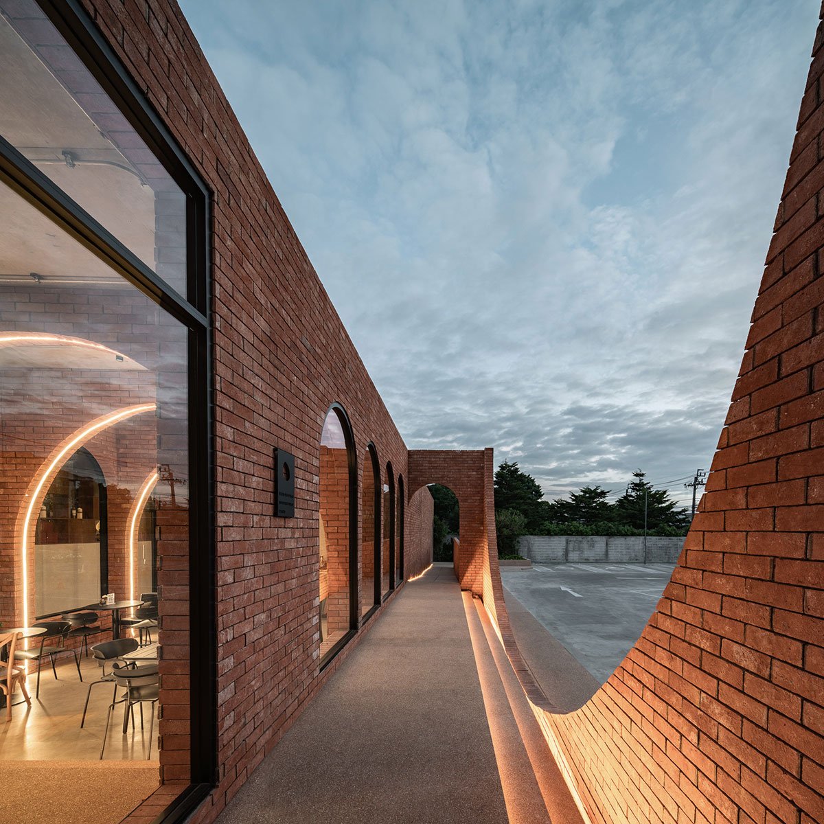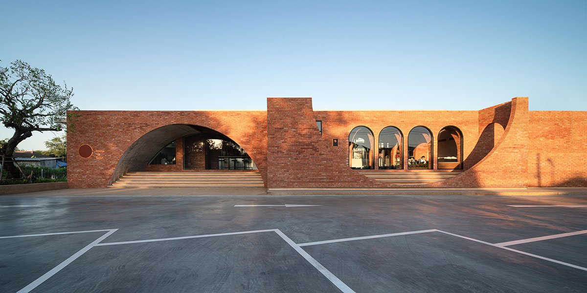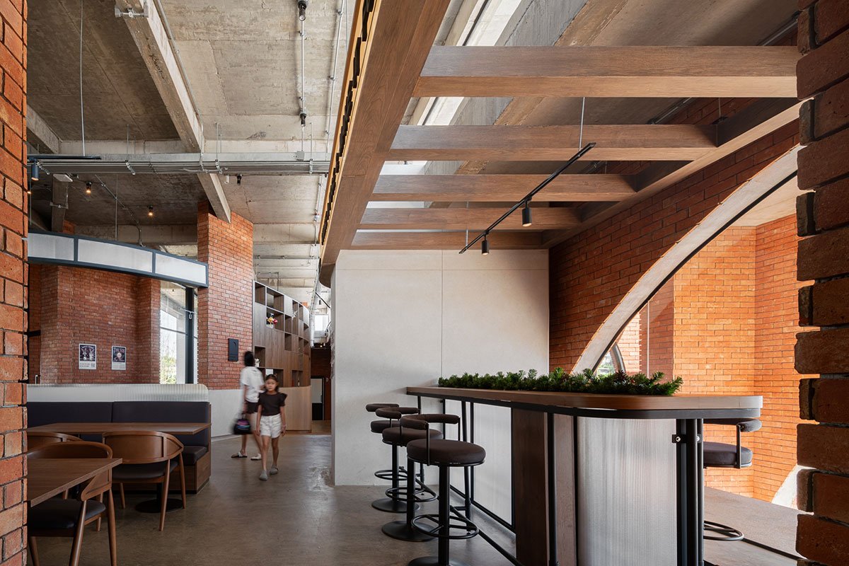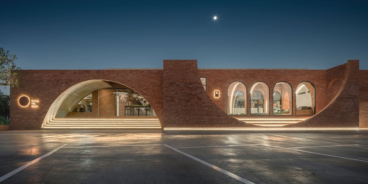 Aged brick serves as the primary material for the exterior wall, as its durability and its color exceptionally complement the orange-hued sky during sunrise and sunset, conveying the ambiance of a cross-cultural restaurant with a touch of elegance. The pattern of an exterior brick is continuously applied to the interior space, mixing with other good vibes materials and decorations to create a mood suitable for various types of food, offering cross-cultural comfort. Each indoor space provides a view of the New Moon outdoor area through a semi-circle arch shape, symbolizing the sun.