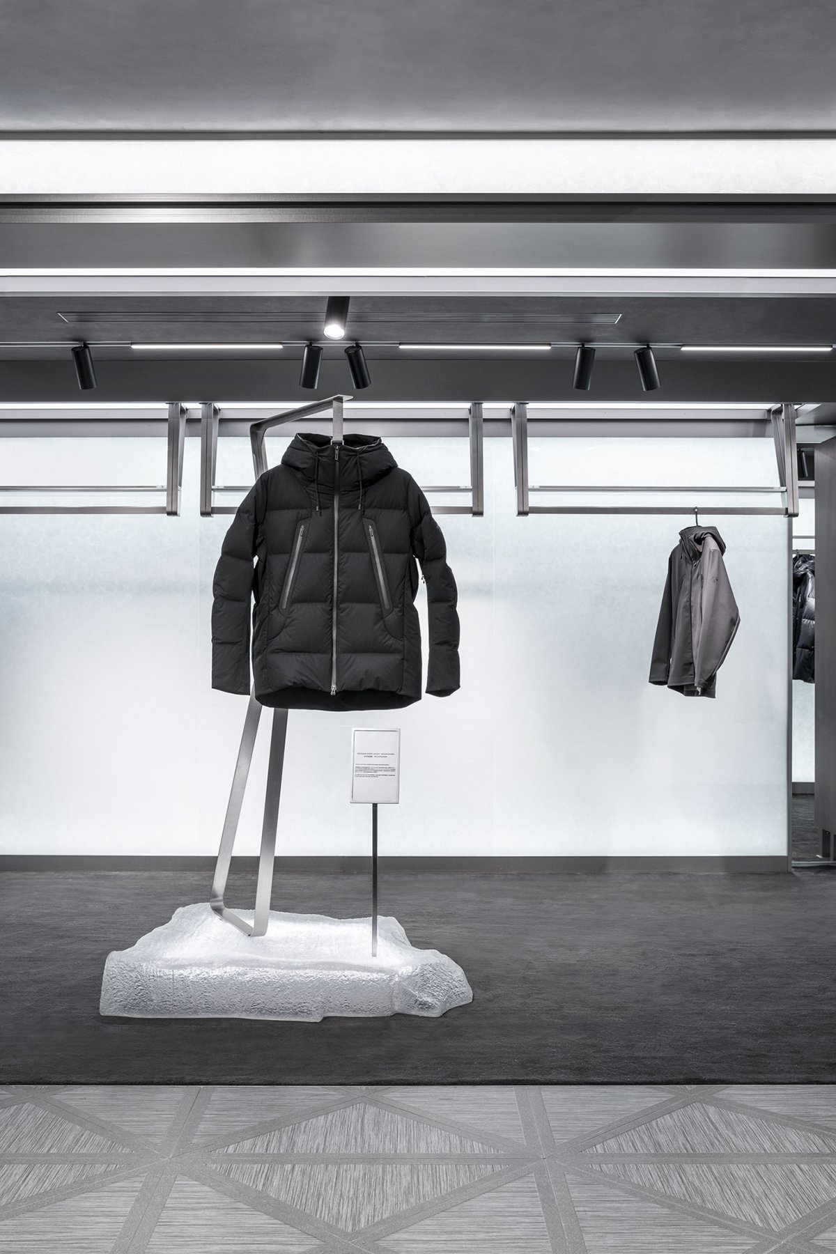 DESCENTE’s winter sportswear rests serenely on cantilevered racks against a glacial backdrop, creating an immersive sense of tranquility and evoking the reassuring power of snow and ice.