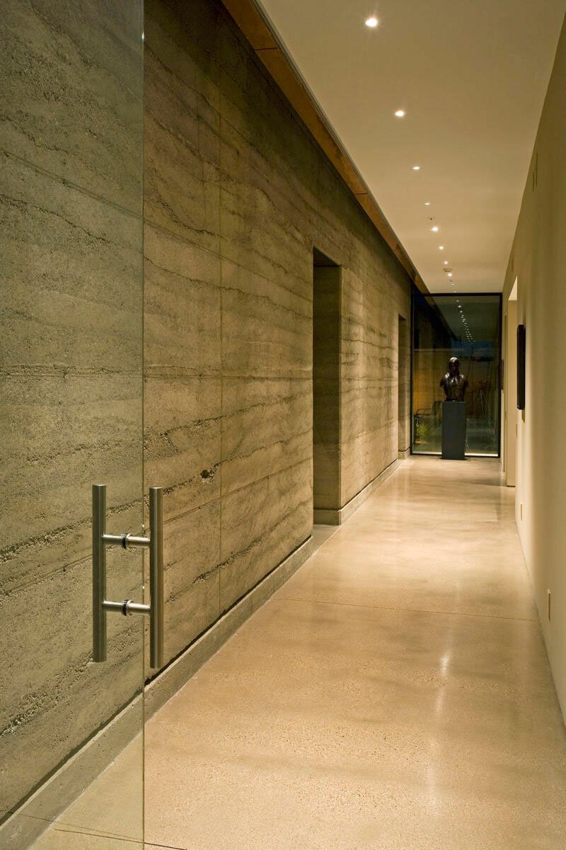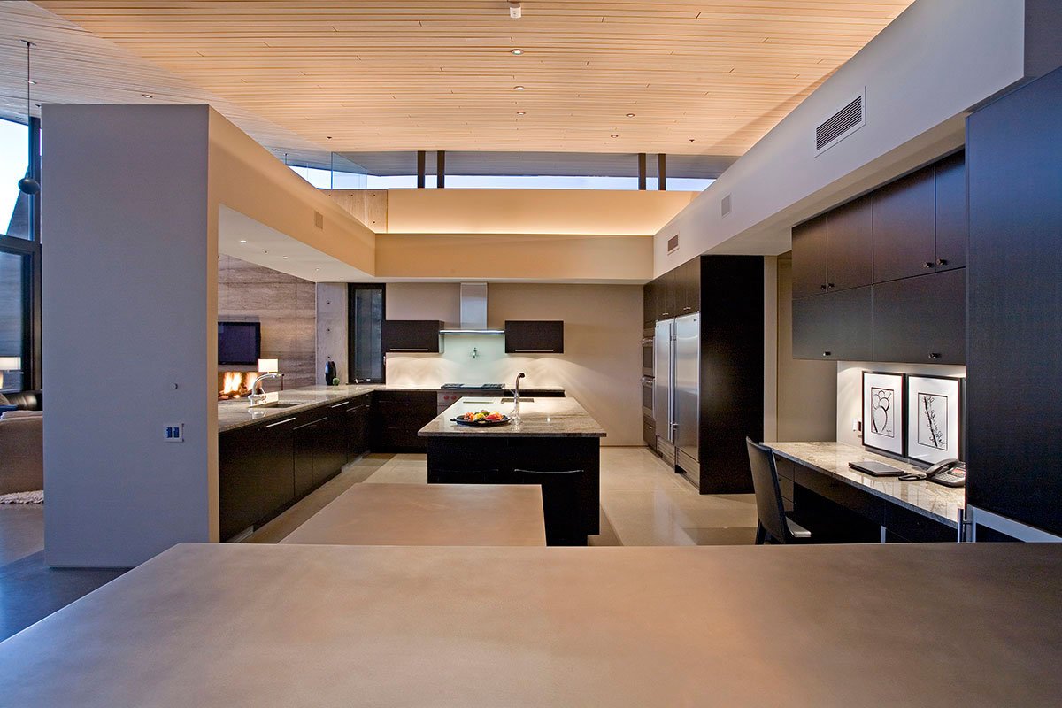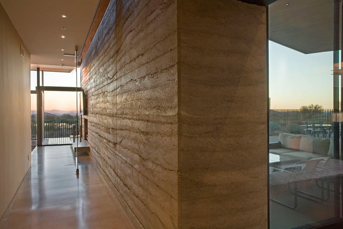 While much of the surrounding homes echo themes from distant European cultures of centuries past this home speaks to its specific place in the Sonoran Desert. Forms derived not by the constraints of style but by programmatic and climatic forces shape this home. Solid walls of earth and concrete block out the harsh desert sun as well as views of surrounding structures. An almost invisible line of glass, shaded by deep overhangs, breaks down the boundaries between indoor and outdoor living, focusing on near and distant views of nature as well as the wonder of city lights in the distant valley. Planar roof forms are folded to catch rain water and disperse it to surrounding vegetation.