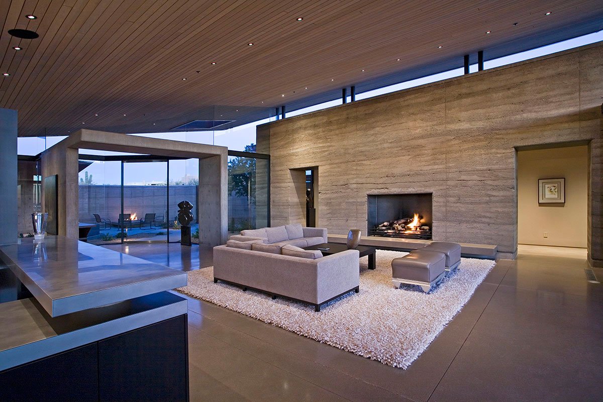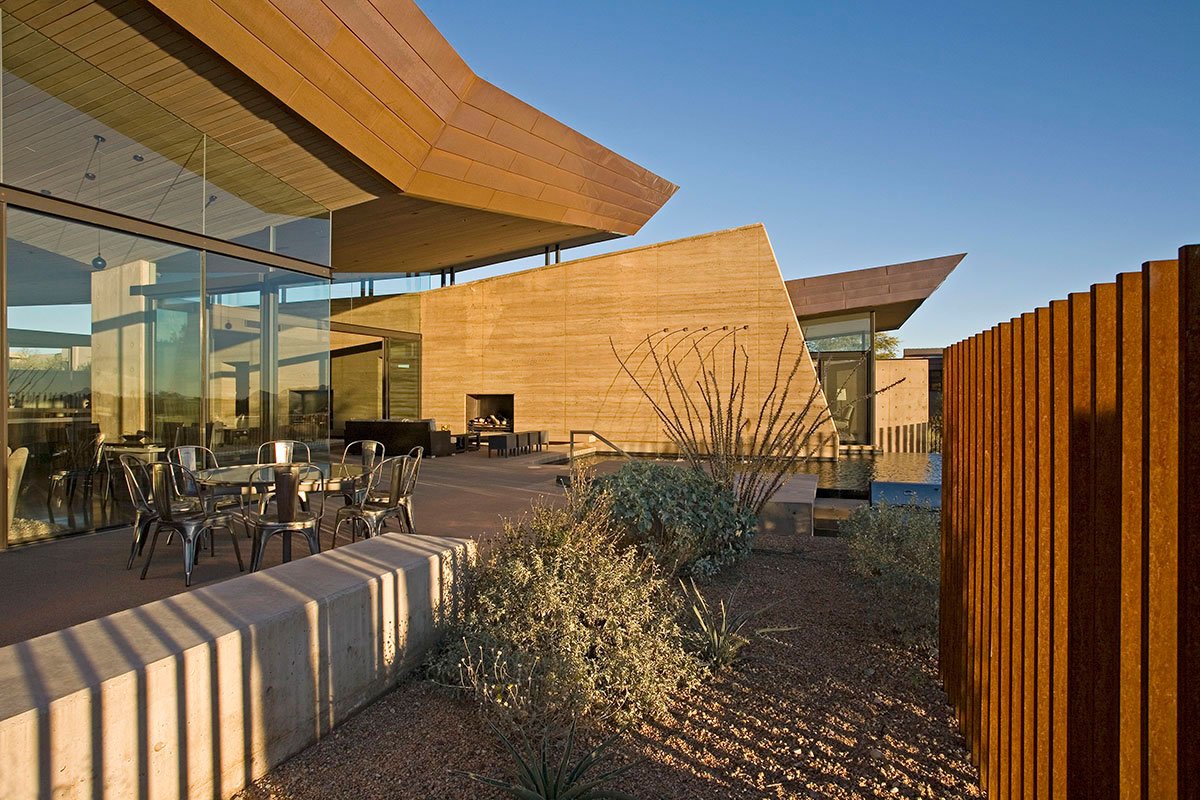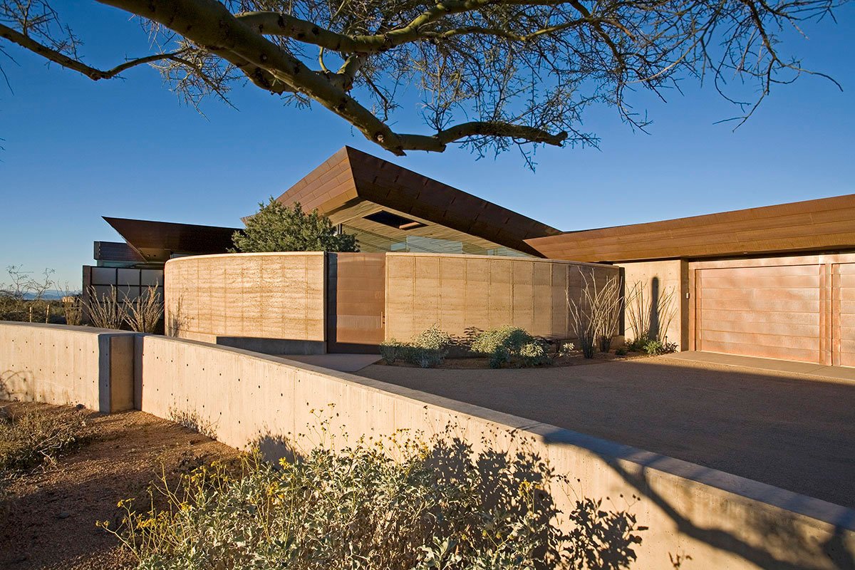 Materials are chosen not just for their inherent beauty and low maintenance but for their indigenous qualities as well. Copper, mined in the Arizona desert, clad bold roof forms which appear to float above indoor and outdoor living spaces. Rammed Earth walls made of soil excavated from the site rise up from the desert floor echoing the forms of the surrounding mountain range. The result is a home that is truly in harmony with it’s site and is expressive of it’s unique place in the world.