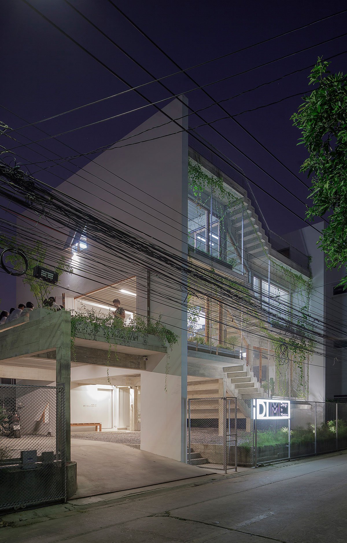 [Text as submitted by architect] The new ‘Design in Motion office’ has been constructed on the land where is planned to add one more building in the future, therefore this new office building had to be built merely on the half of the land for supporting that plan. Because of that, this office was set in the vertical direction as a three-storey building within the boundary of 10 by 10 metres. The building is also placed adjacent to one edge of the land on one side, and the other side are prepared to connect to the future building with a large balcony on the upper floor.