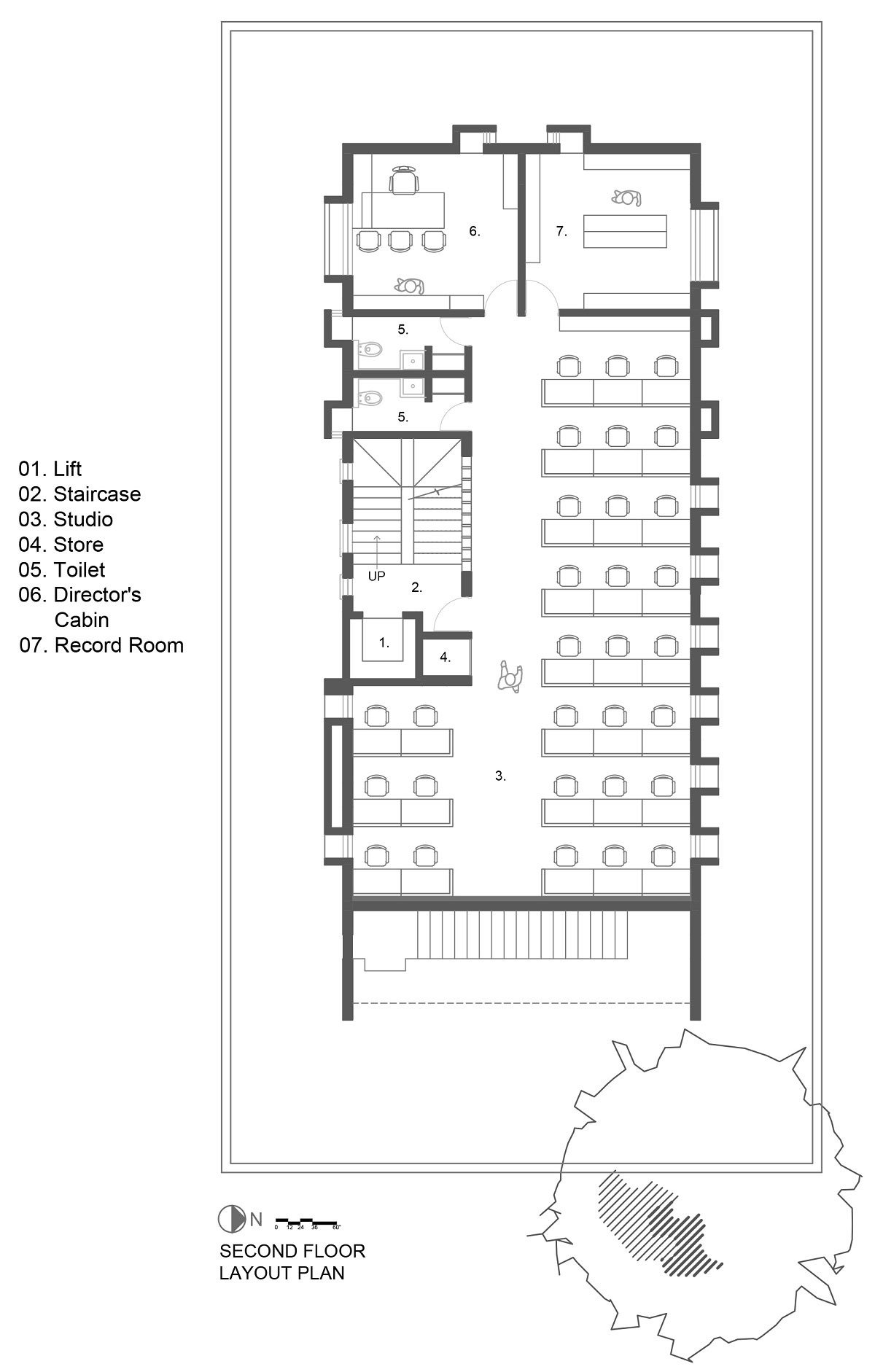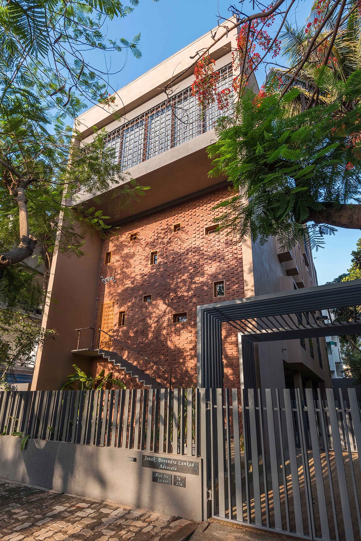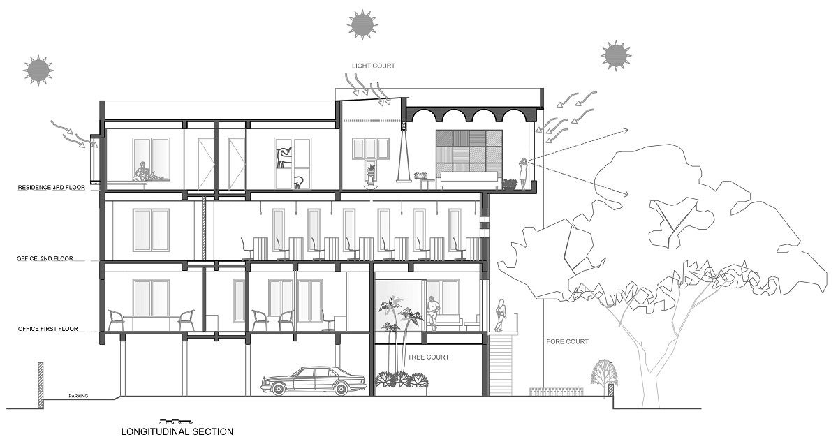 [Text as submitted by architect] We have known this client for quite some time and have worked on a number of projects for them. So we were involved in this project right from site selection till the final handover. After seeing a number of sites, we zeroed in on this 4200 sq.ft. plot set amidst a residential neighborhood. It was surrounded by low rise buildings on 3 sides and abutted a narrow street on one side. The large gulmohar tree just outside the plot was a striking feature which kept on drawing our attention. The client’s brief was to have a P+3 mixed use building, with his office on two floors and his residence on one floor. With a floor plate of 1700 sq.ft, we were ultimately designing an apartment for them and that is where the challenge lied. The parents have stayed in ground floor houses all their life and now this was going to be their first experience of staying in an apartment like setup. Moreover, for a family of four, their space requirements were sorted and their brief revolved around having a house that will not give them a feeling of staying in a compact 3BHK apartment.