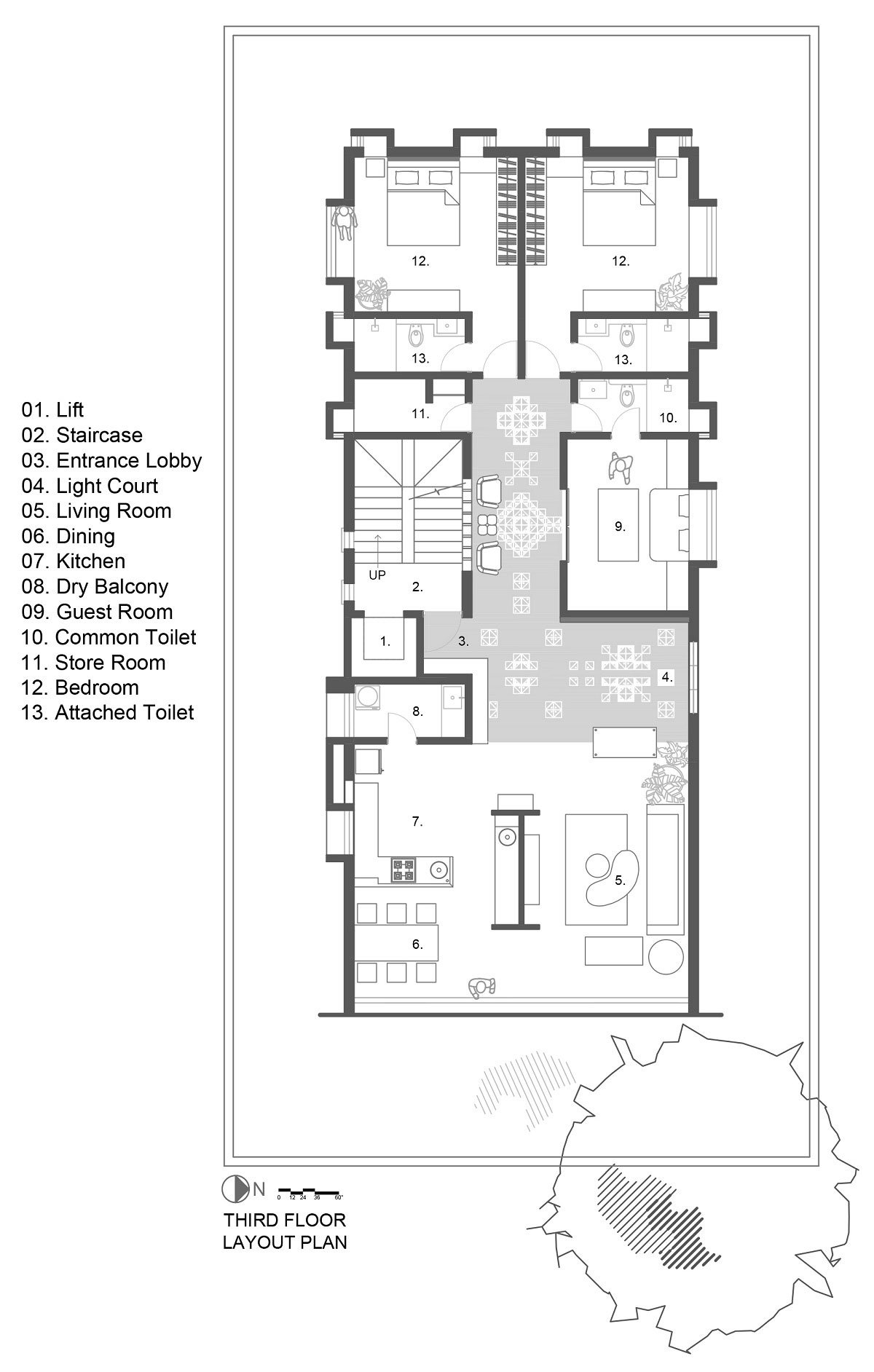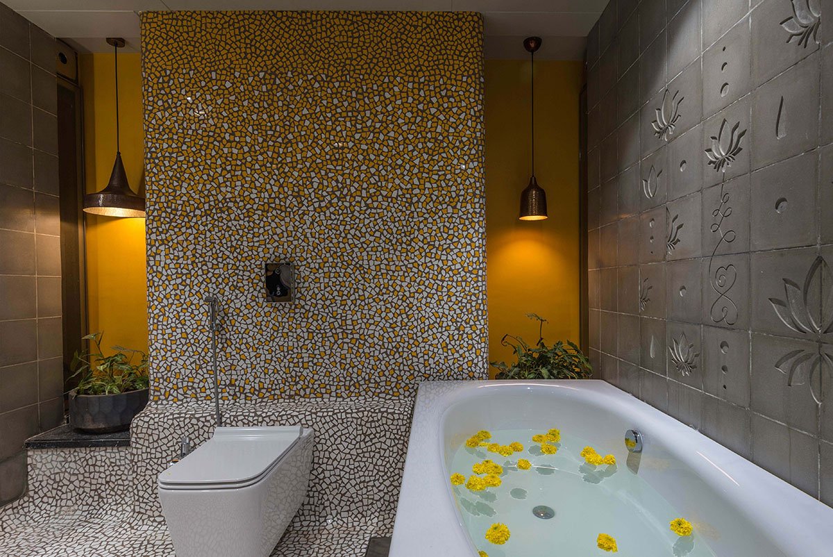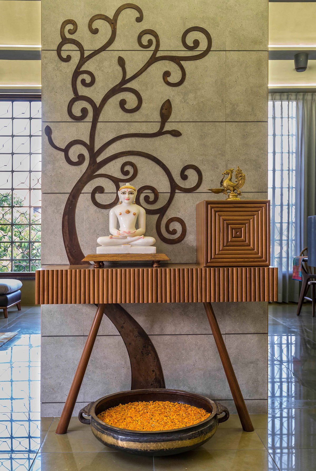Considering the space at our disposal and understanding the client’s outlook, our initial ideas revolved around creating a space that will break away from the typical framework of an urban apartment. We started by segregating the private and common areas of the house. The room placements were governed by the services grid of the entire building. Keeping in mind the client’s lifestyle, we decided to optimize the bedroom spaces and increase the common areas. A light court was introduced to help us move away from the constraints of tight space. The patterned flooring and a traditional tulsi vrindavan was intended to make this space appear and function more like a courtyard. The drama played by shadows cast by the pergola keeps changing the space dynamics throughout the day.