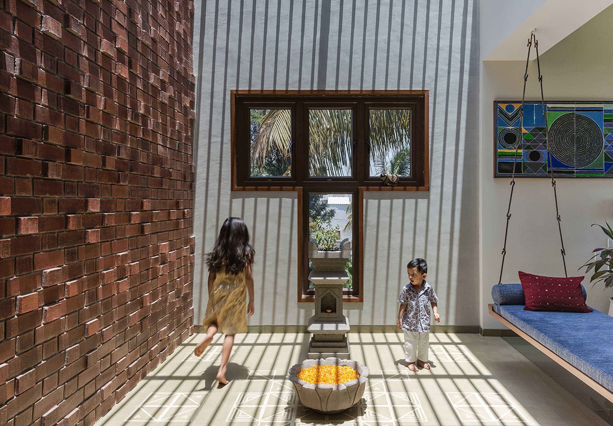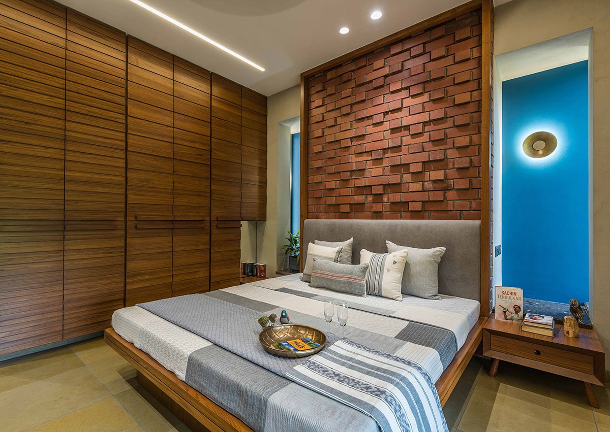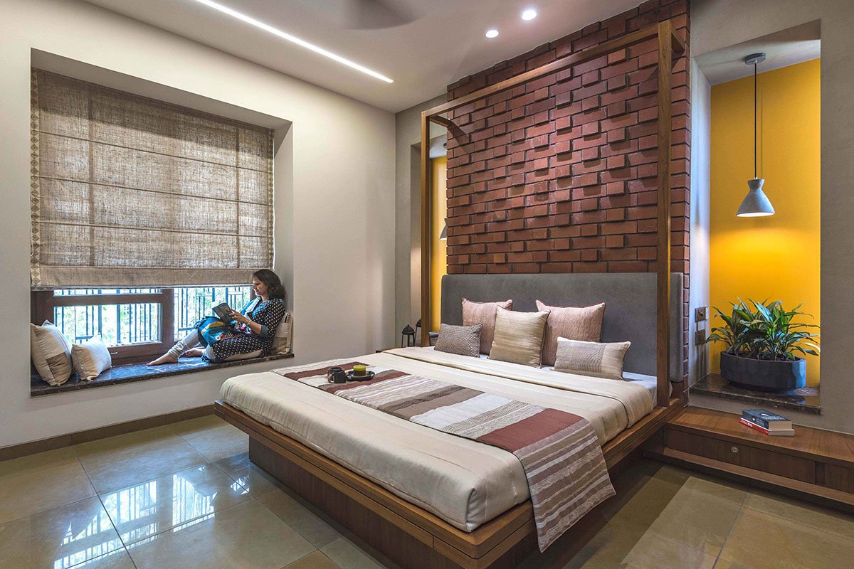 With an intention to enhance the sensorial experience of the users, our design deliberations focused around conceiving spaces highlighted with subtle textures. Exposed brickwork, Kota floor, Cement tiles, Kavdi work, wooden furniture and concrete finish walls together defined an earthy palette. Restrained use of colours and splashes of greenery formed the basis of the overall design vocabulary. The overall design language and material palette had to be justified with proper detailing. Lot of efforts were put into designing functional and aesthetic elements. Patterns in exposed brickwork, flooring, screens and customized furniture involved immense amount of detailing, which in turn helped us define a strong sense of aesthetics weaving the entire house together.