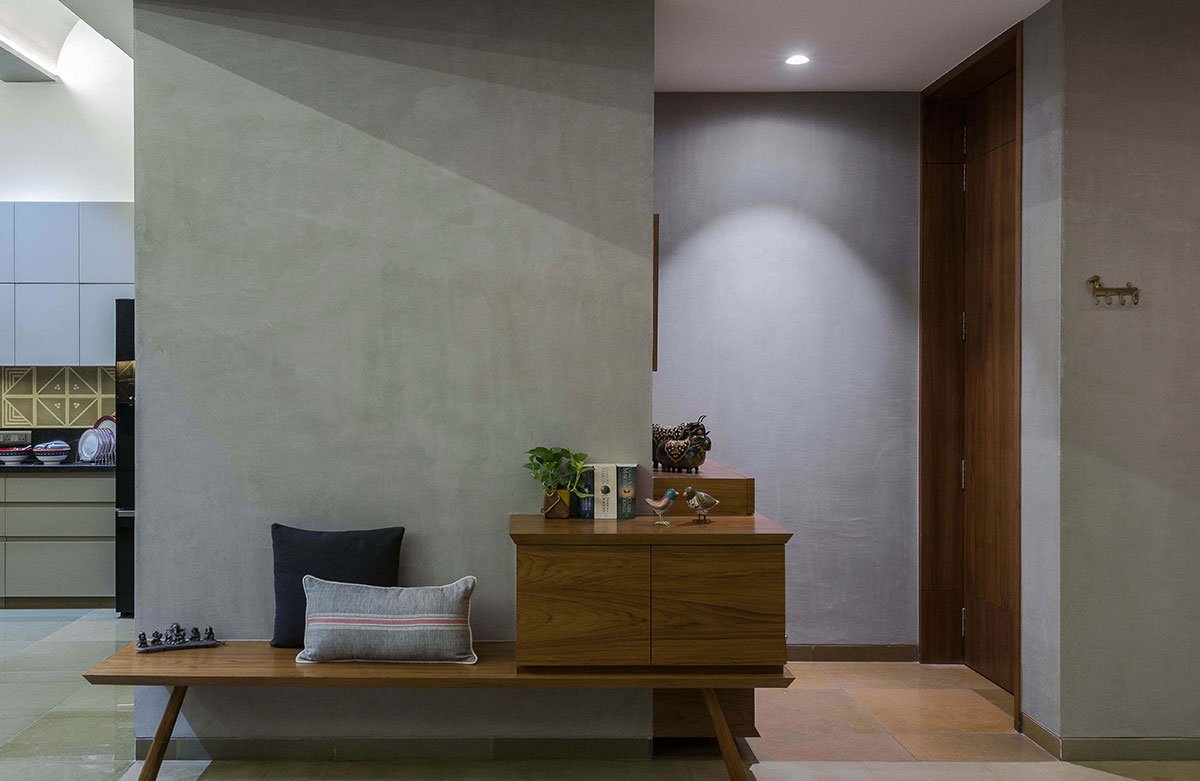 Excerpt: Devnanda, designed by Studio Infinity, breaks away from the typical framework of an urban apartment that will not give them a feeling of staying in a compact apartment. The room placements were governed by the services grid of the entire building. A light court was introduced to help us move away from tight space constraints. The patterned flooring and a traditional tulsi vrindavan was intended to make this space appear and function more like a courtyard. The drama played by shadows cast by the pergola keeps changing the space dynamics throughout the day.