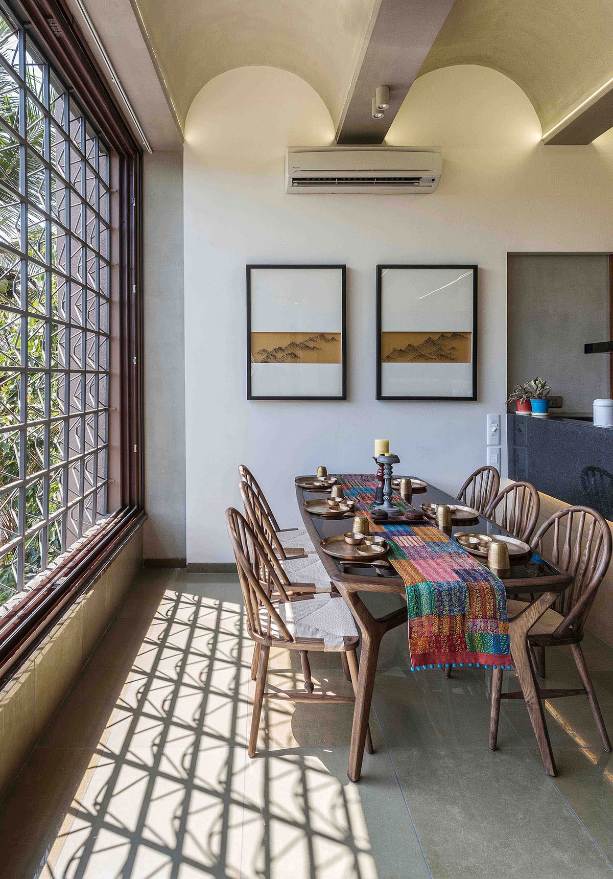 As we were also designing the entire building, we had an opportunity to modify volumes at this level. So making the most of this advantage, we made certain volumetric transformations in the living-kitchen space. A series of Ferro-cement vaults with an increased room height, now defined the spatial experience. To retain the visual continuity of this vaulted room, the divider between living and kitchen was kept low with the intention of having a free flowing connection, both visual and spatial. With buildings just 20’ away on 3 sides, only the eastern façade gave us a chance to open out. The entire 27’ width of this apartment was opened up to a wonderful view of a large gulmohar tree just outside the plot.