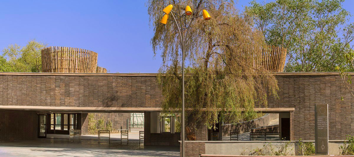 The design solution therefore, is a conversation between the past and the present, acknowledgement of the traditional and it’s adaptation in contemporary times, in concept and in construction. The site was a large six-acre northwest facing contiguous piece that turns southeast towards the end. The plot is bound by the main bus terminus on one side, the Tihar jail (a national prison) greens on the other side and a large commercial road in the front. The complex is planned with two entrances; a primary face with vehicular and pedestrian zones and a secondary rear entry for pedestrians into the craft-only zone.