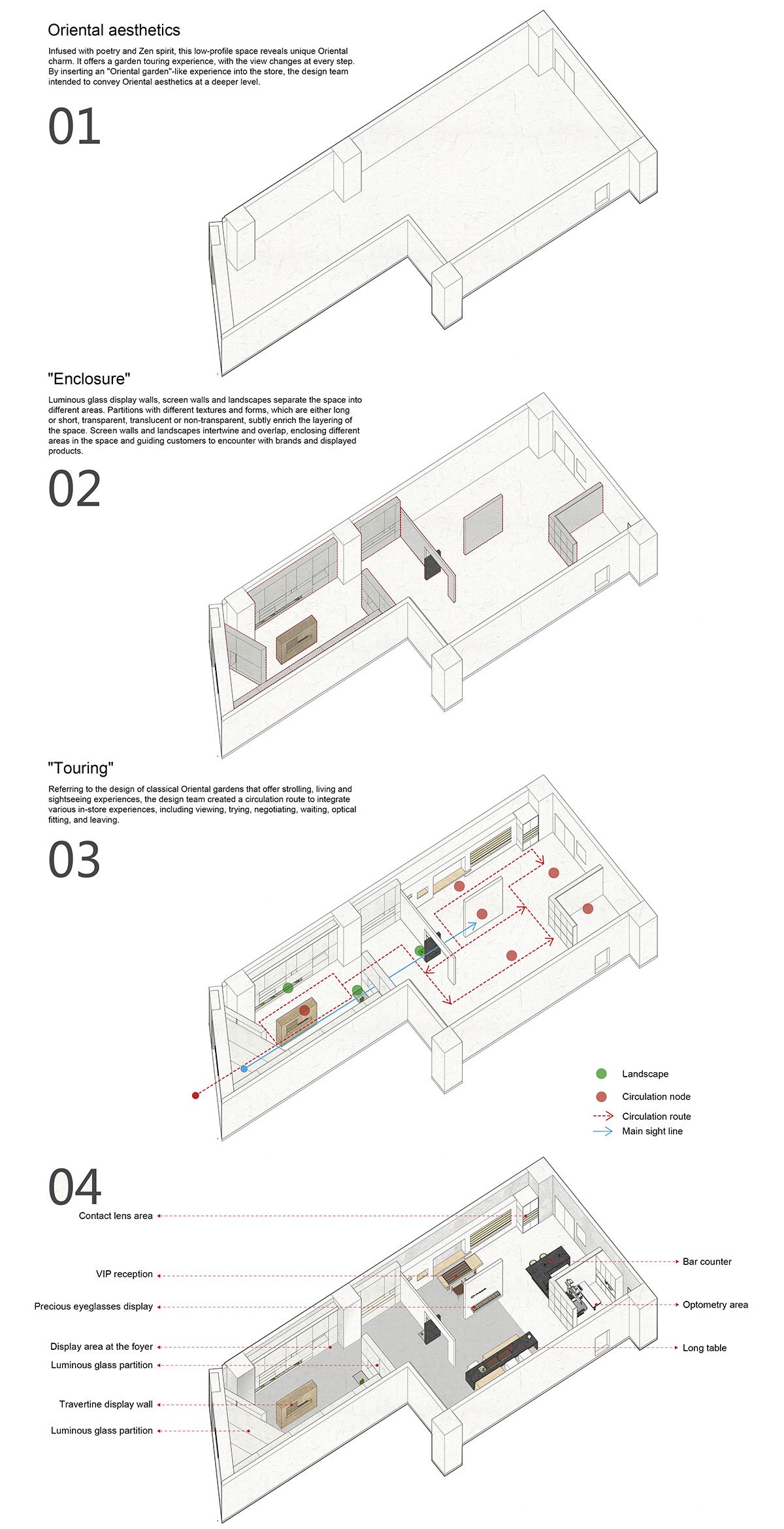 The twisting circulation route solves the restriction of the deep space. The open area at the rear of the room accommodates functions like socializing, business negotiation and optical fitting, shifting from a dynamic atmosphere to tranquility. The design team introduced the experience of touring a traditional Oriental garden into the space, to offer varying views as customers move into the space.