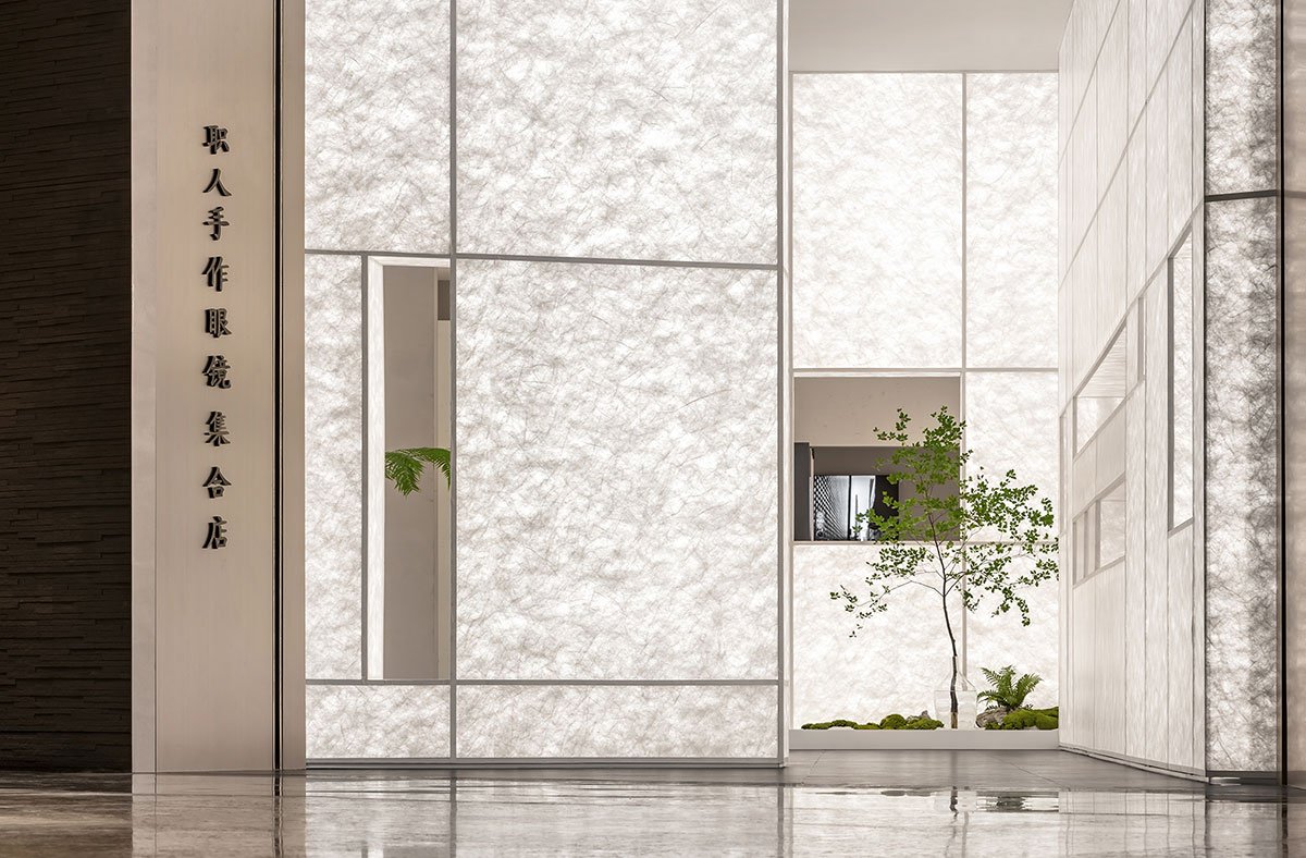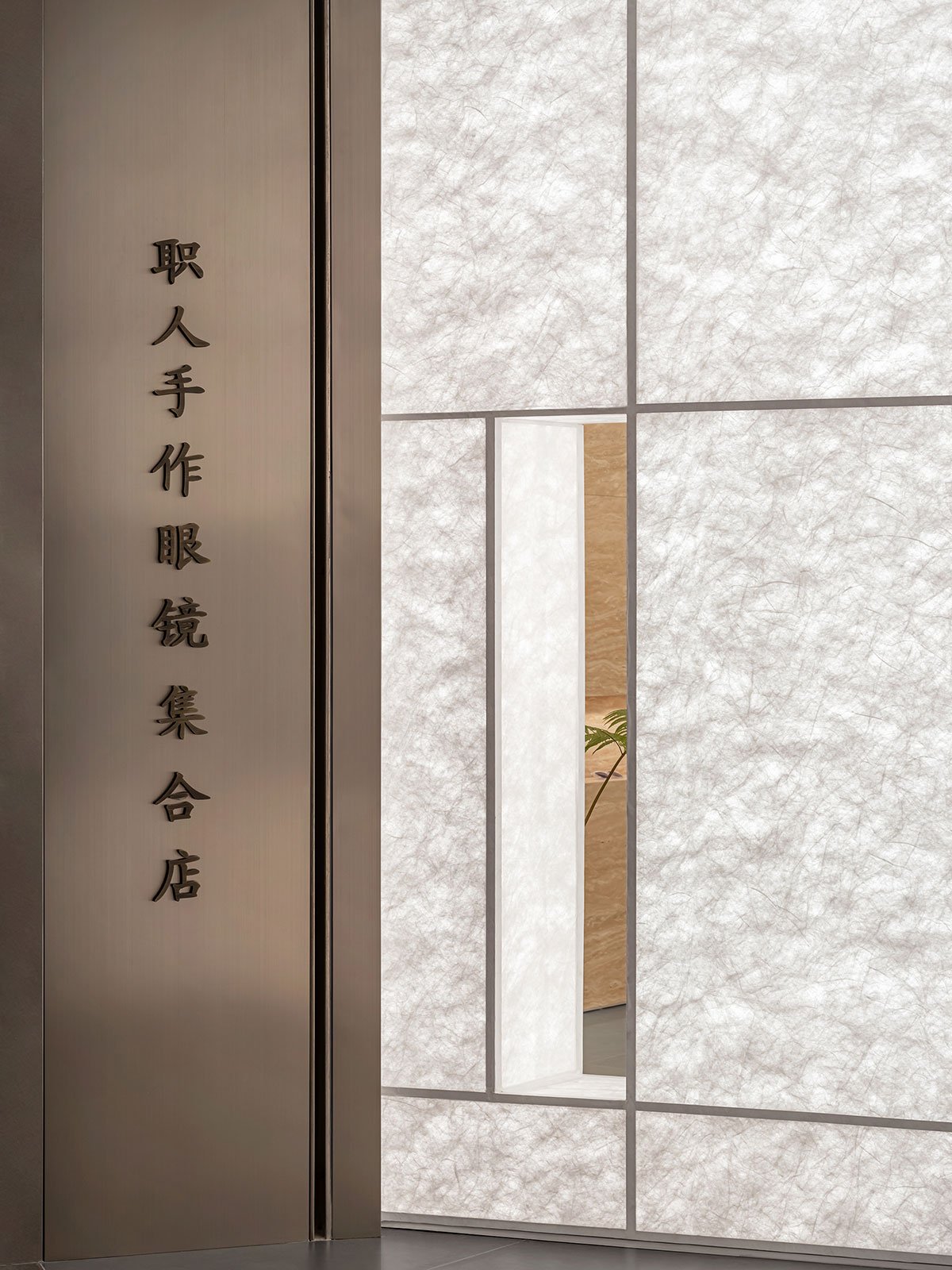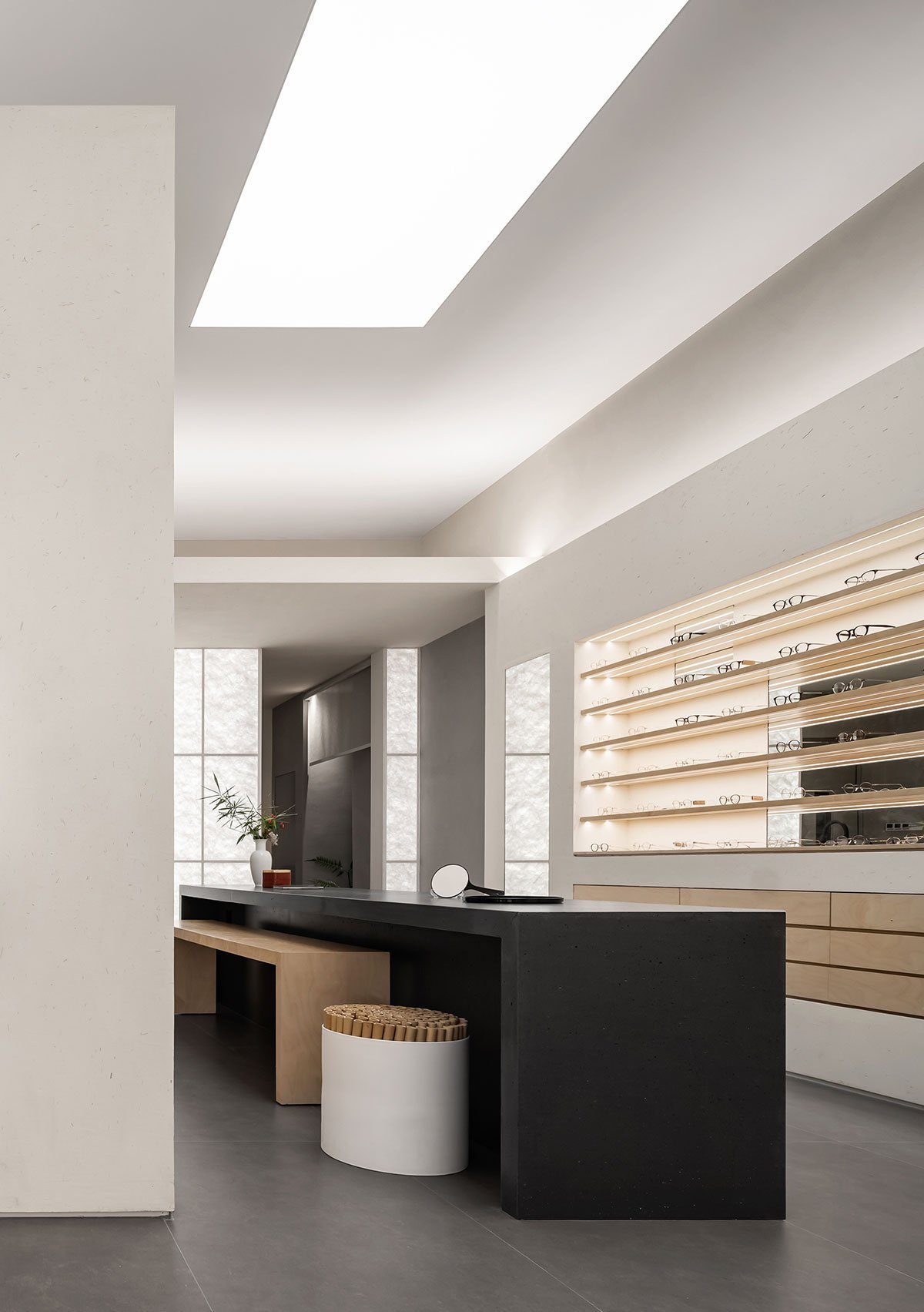 The front area of the store is enclosed by luminous screen walls, which form a pure, complete spatial realm. Standing out from the surroundings, this pure space symbolizes the spirit and pursuit of eyeglass craftsmen. The store is near a subway entrance. The pure interior space forms a contrast with the passers-by in a hurry, and attracts them to stop and look into it. The hazy, pure luminous foyer sets an elegant spatial tone, and showcases the design team’s interpretation of contemporary Oriental simplistic aesthetics. Tyvek paper combined with straw-featured coating expresses a restraining ambience in Oriental aesthetics.