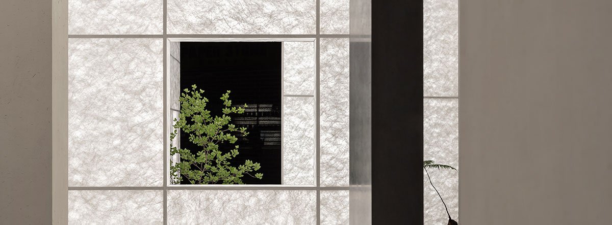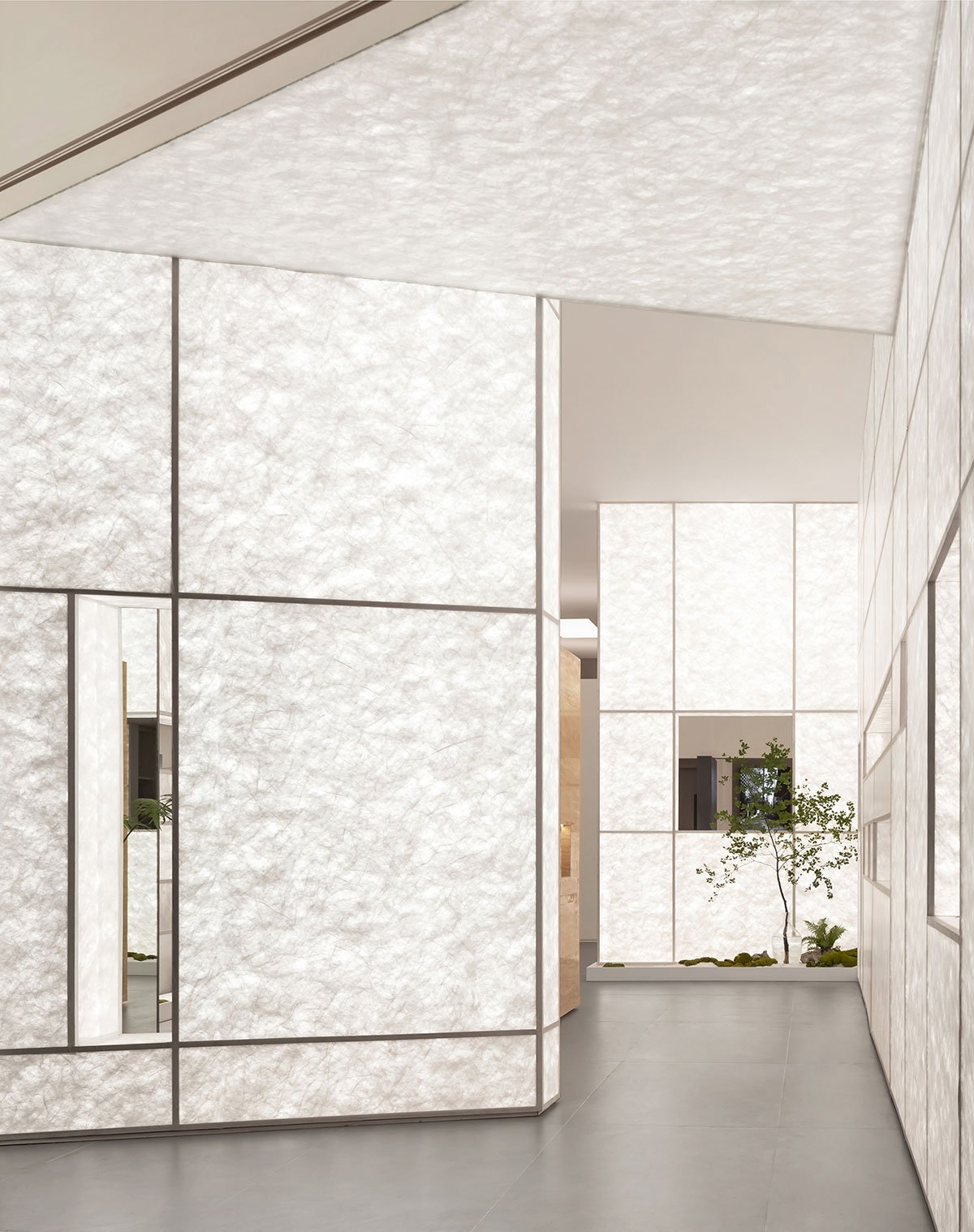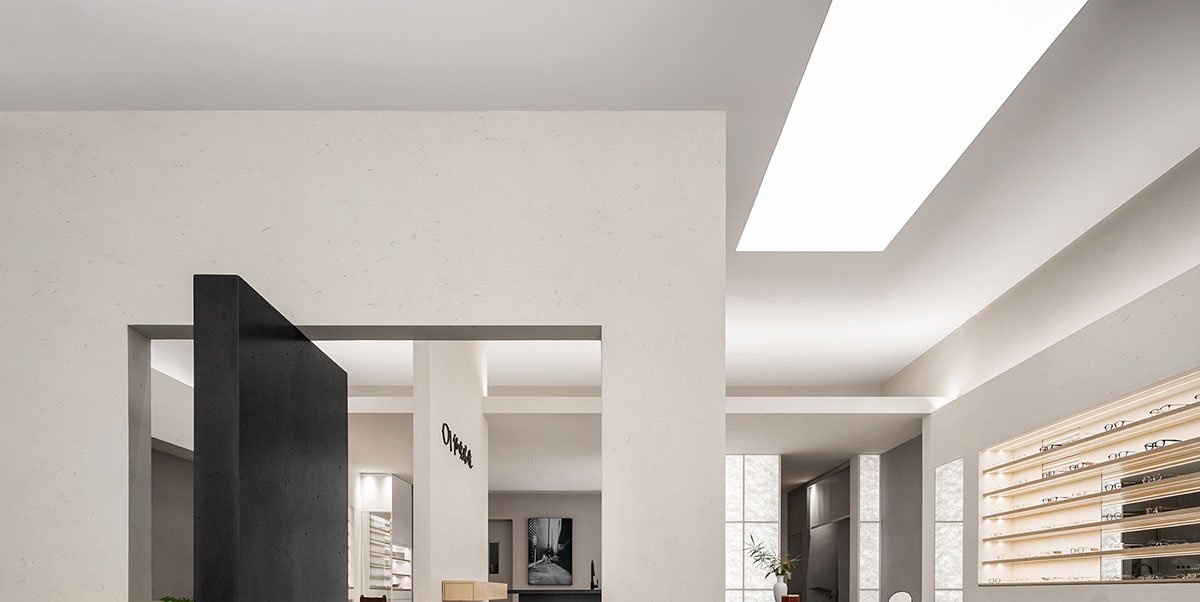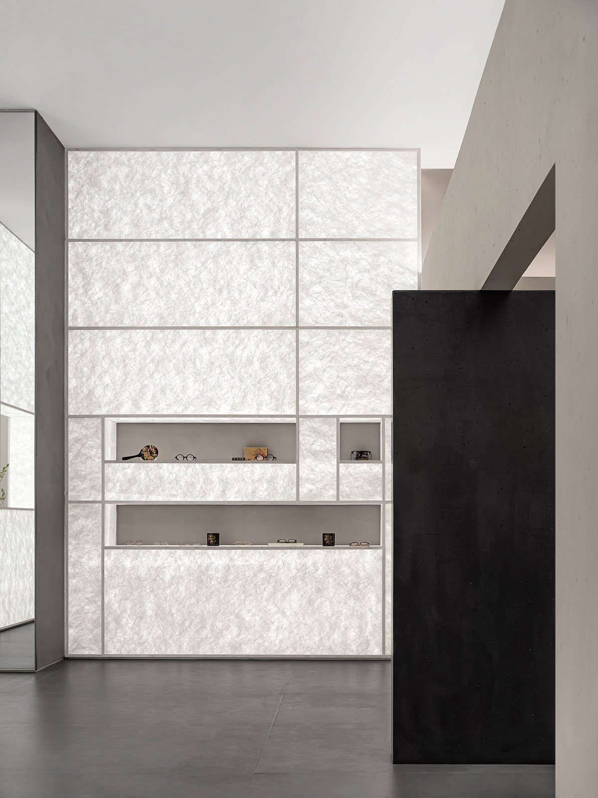 The front area of the store is enclosed by luminous screen walls, which form a pure, complete spatial realm. Standing out from the surroundings, this pure space symbolizes the spirit and pursuit of eyeglass craftsmen. The store is near a subway entrance. The pure interior space forms a contrast with the passers-by in a hurry, and attracts them to stop and look into it. The hazy, pure luminous foyer sets an elegant spatial tone, and showcases the design team’s interpretation of contemporary Oriental simplistic aesthetics. Tyvek paper combined with straw-featured coating expresses a restraining ambience in Oriental aesthetics.