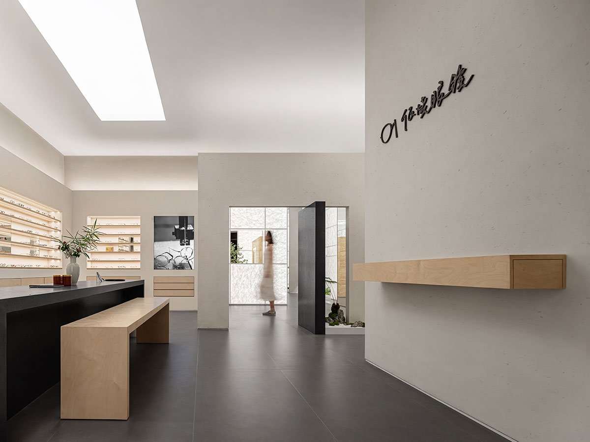 Handmade eyeglass display is inserted into interior surfaces. Screen walls in different textures and forms, which are either long or short, transparent, translucent or non-transparent, divide the space into several areas. Abundant gaps blur the boundaries in the space, and enhance the connection between different functional areas.