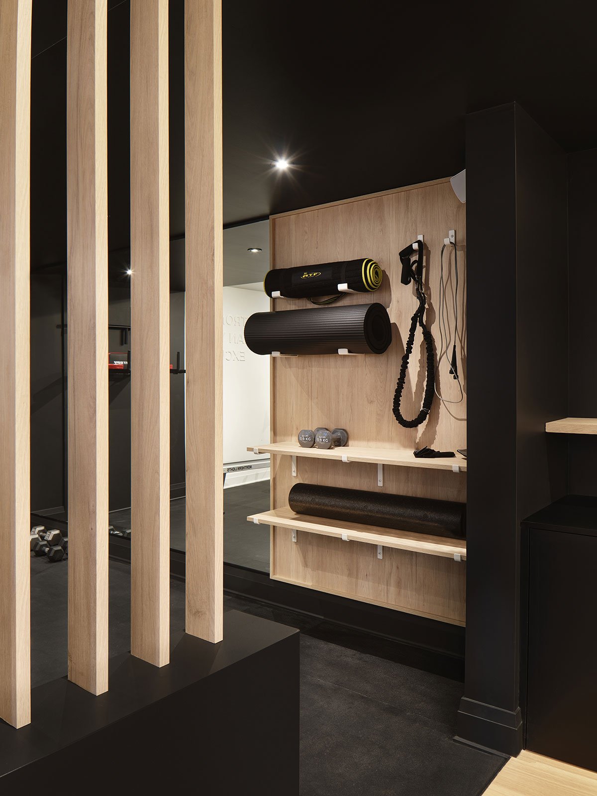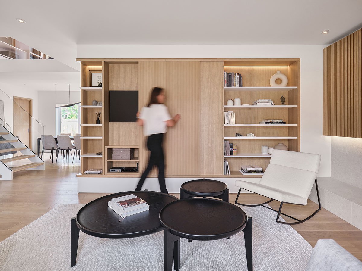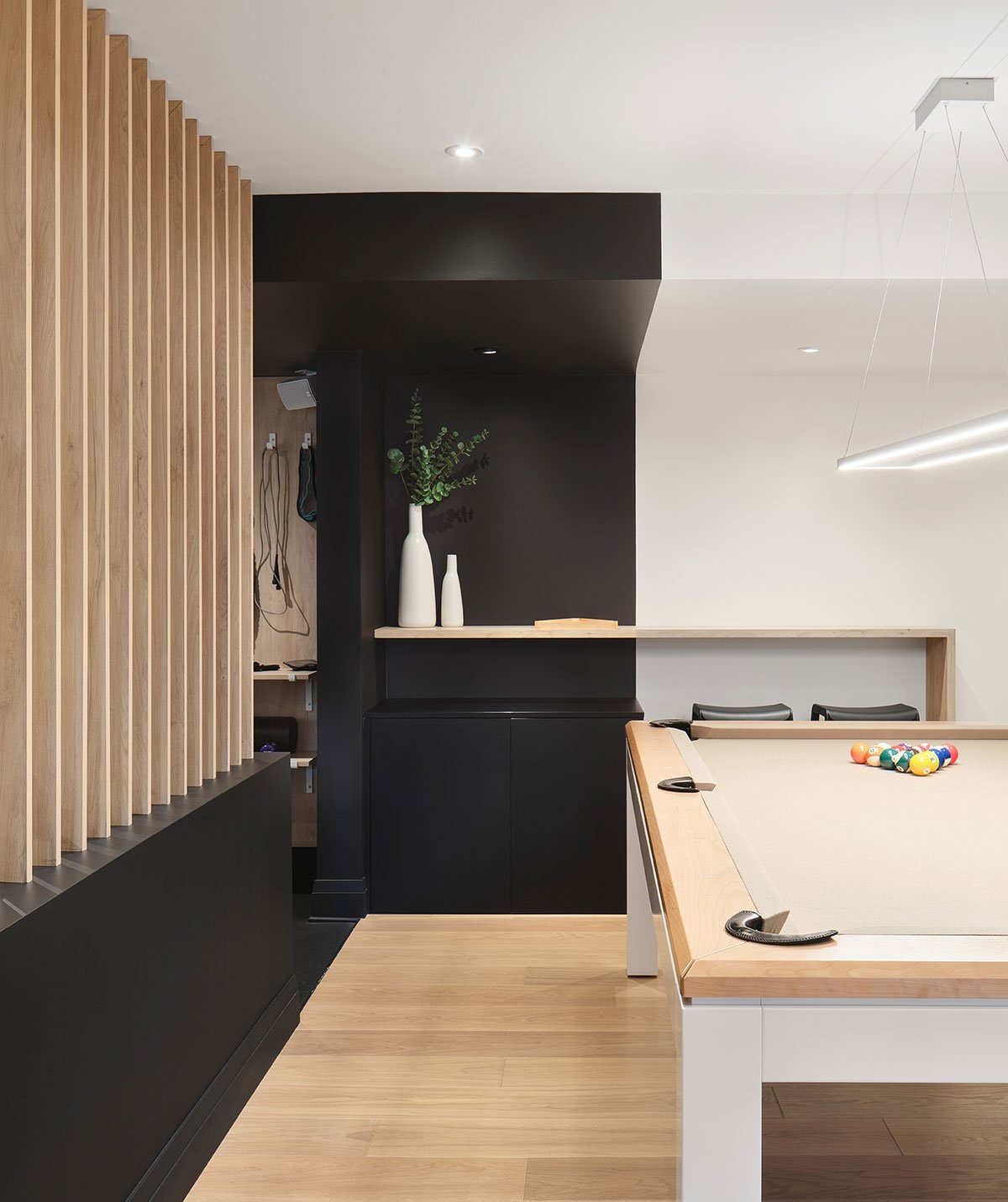 Four functions, one space: No detail in this project was overlooked, including the basement in which three functions coexist harmoniously without overlapping. This was made possible by the use of cabinetry modules that provide a visual delineation between the gym, the pool area, and the family room. In order to optimize the use of the space, the design of these custom-made pieces of furniture also enhances the functionality of each of the sub-spaces. The result is a lively and multifunctional basement used daily by the whole family.