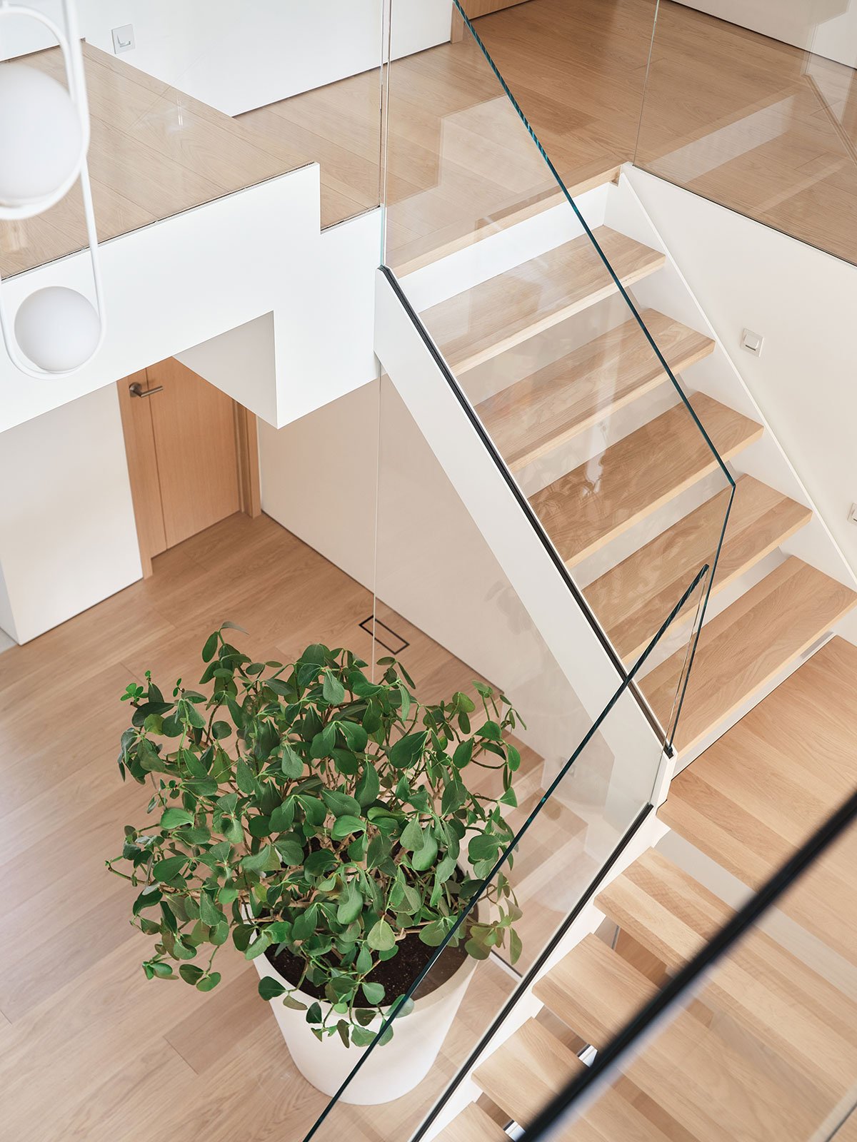 [Text as submitted by architect] Making light a central element of the house: To overcome the lack of natural light, the approach was to open up the existing house by decompartmentalizing many of the rooms, and by creating an impressive opening between the first and second floors. The completely open, white wooden staircase, with glass railings crossing all three floors of the residence, gives an impression of lightness as soon as one enters the space, allowing sunlight to pass through the entire house. In order to create a strong connection with the outside, wide openings were made on the rear facade, providing views of the garden from all the floors.