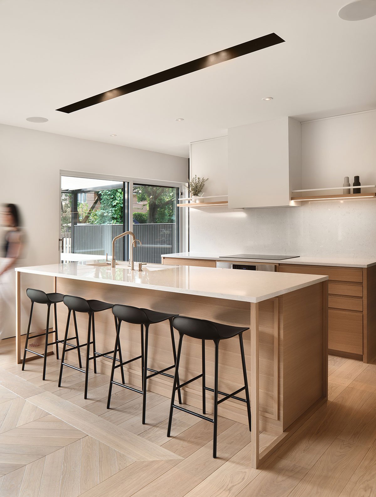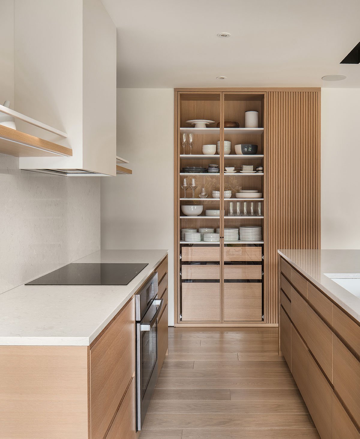 An unconventional approach was taken for the kitchen design. In fact, it is divided into two separate spaces. The front portion consists of three integrated furniture elements that were designed to give a sense of lightness and refinement. There are no wall cabinets, the china cabinet is reminiscent of the bookcases found in the living room, and the delicate legs of the island allows for a communal table area around which the family gathers each evening to prepare dinner.