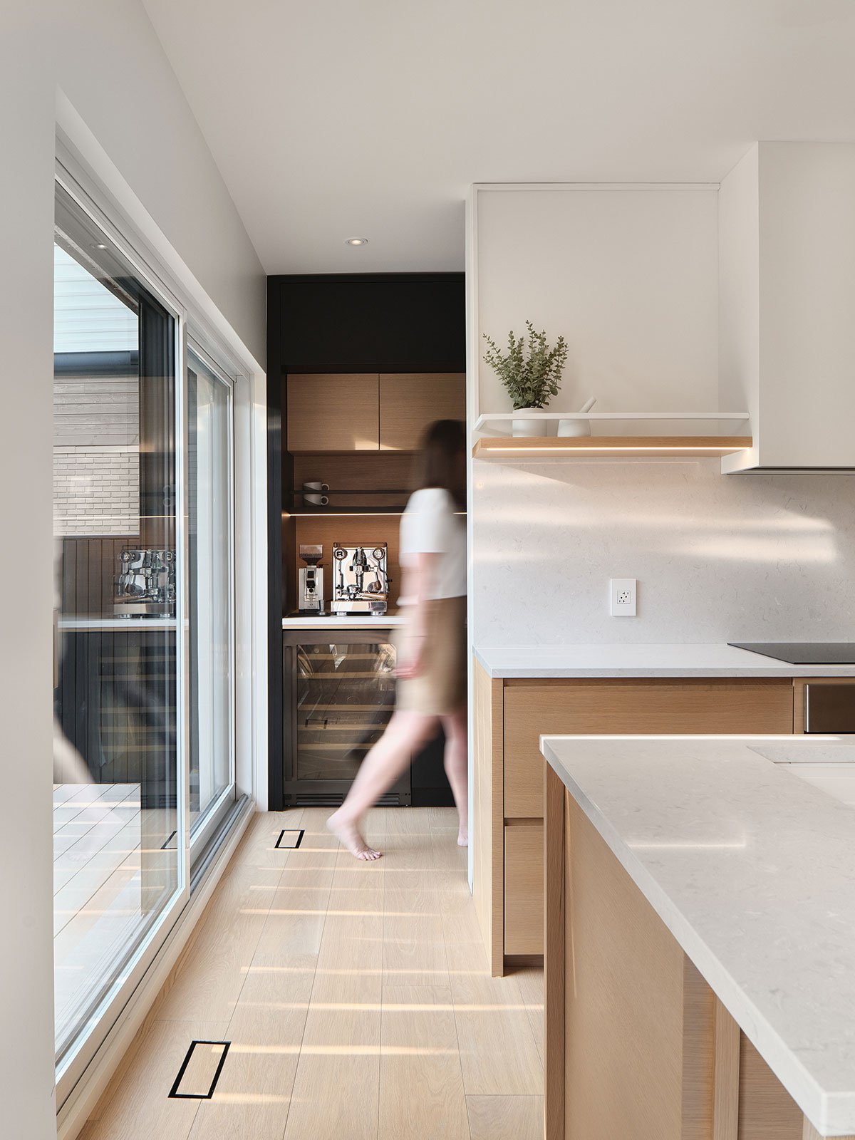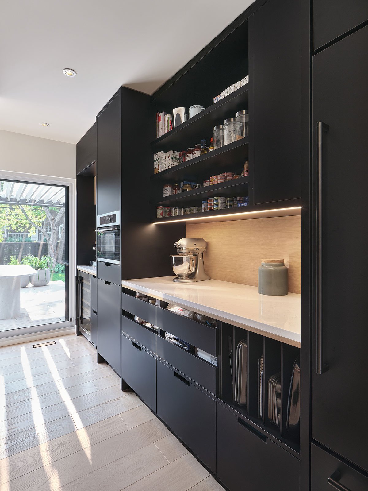 Behind the front portion, the all-black pantry stands out from the kitchen by its contrast, highlighting it. To facilitate access, it was deliberately planned that no door would close it off. A true extension of the kitchen, this space has been maximized in order to discreetly integrate the refrigerator, the coffee corner, as well as all the small daily appliances. These elements remain visually hidden, but within easy access. Humble and unifying, this space, deeply rooted in the family life, harmoniously combines aesthetics and functionality.