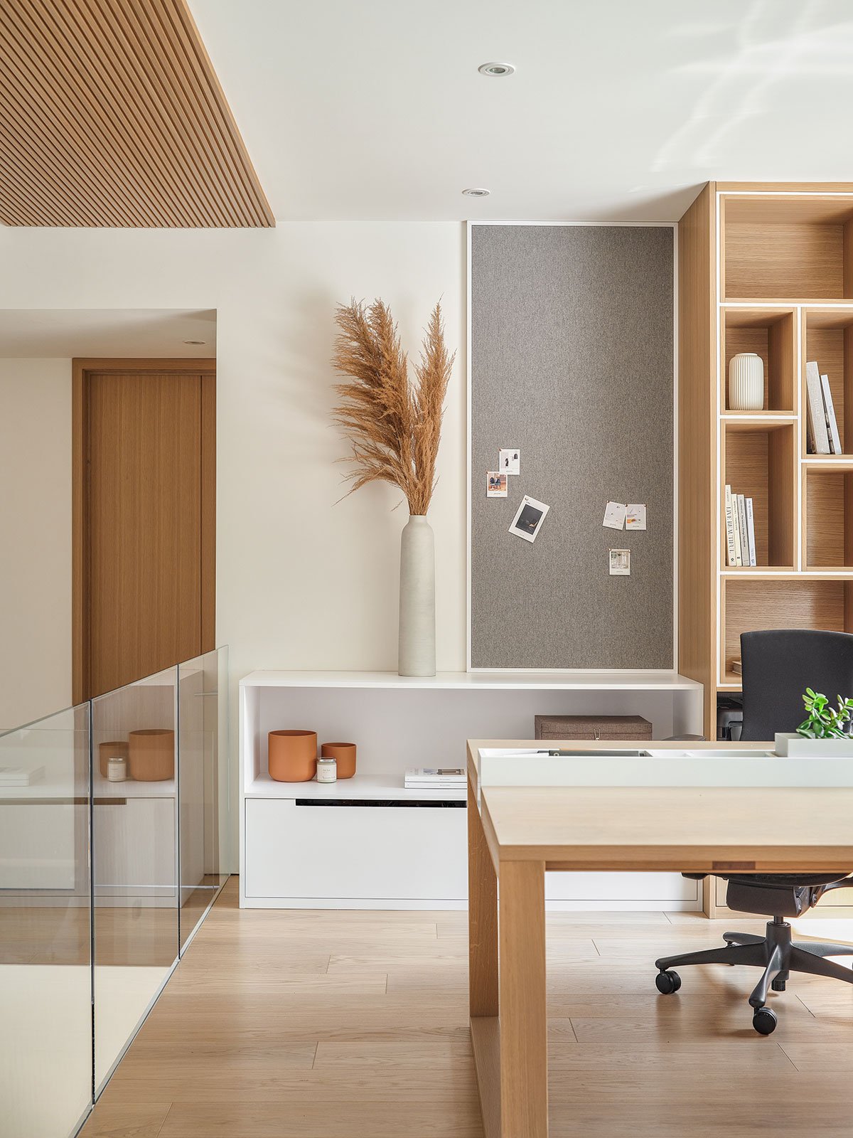 An integral part of the floor plan designs, the office has become a central piece in the owners’ daily lives. They wanted to be able to work from home occasionally with unobstructed views of the garden. Placed in the center of the space, the large work surfaces act as a central island around which all members of the family can gather to work, including the children during homework time.
