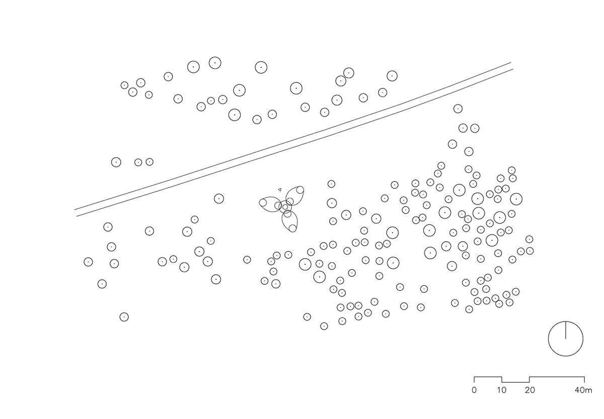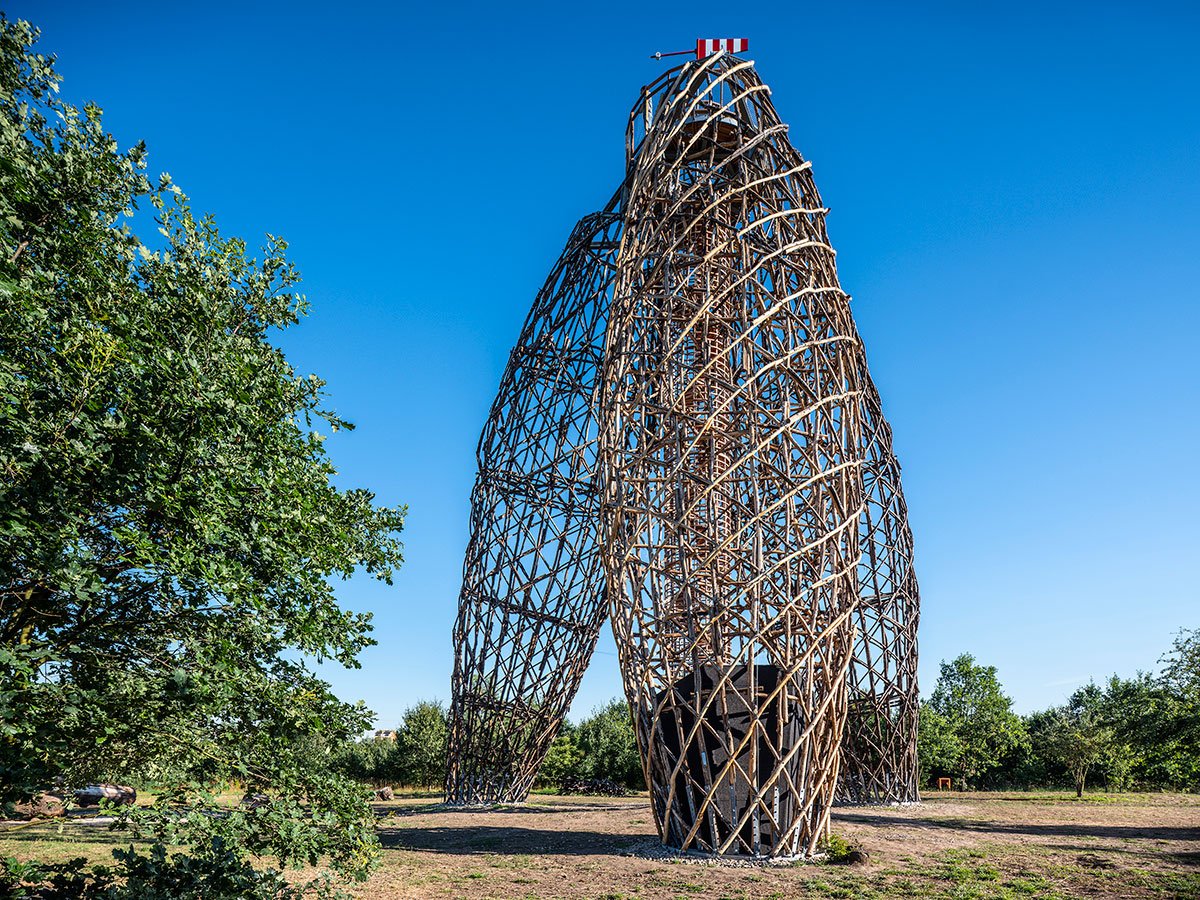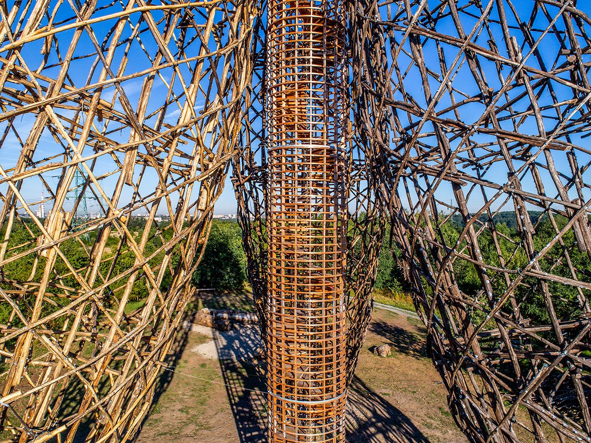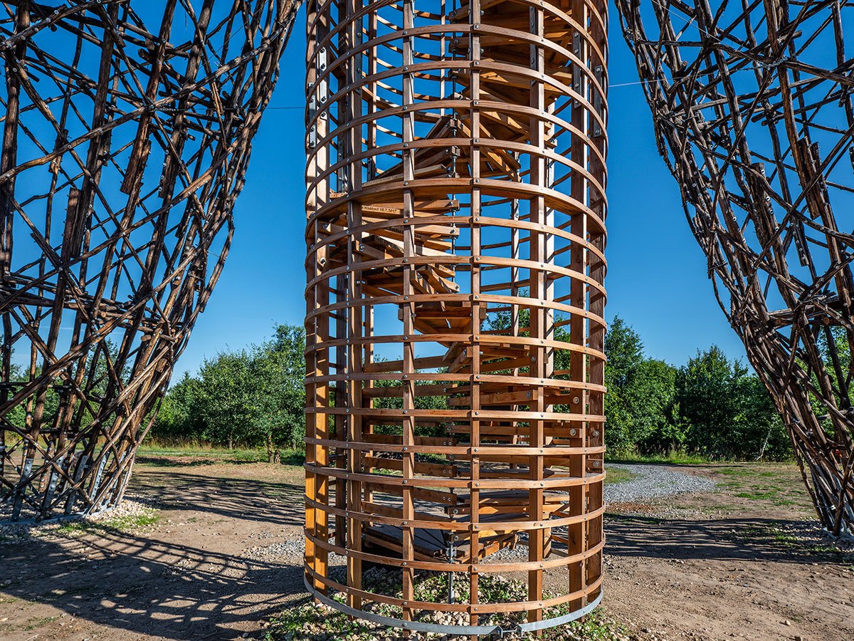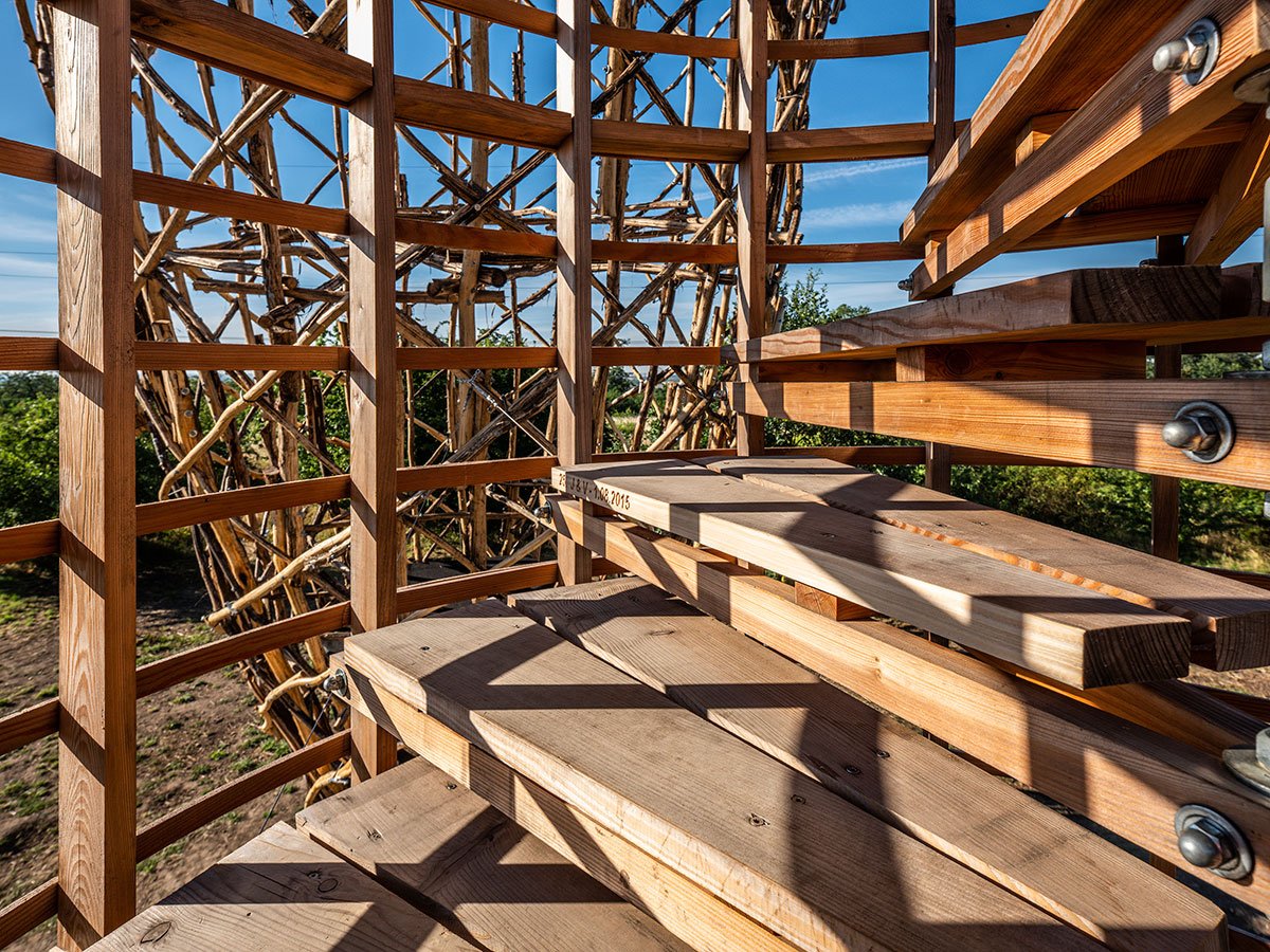 The lookout tower stands firmly on three legs. Easily renewable black locust timber predominates. Black locust is the best material in terms of durability, and it will require minimal maintenance. We used four kilometres of twigs, complemented by a spiral staircase made of larch and connecting elements from galvanised steel.