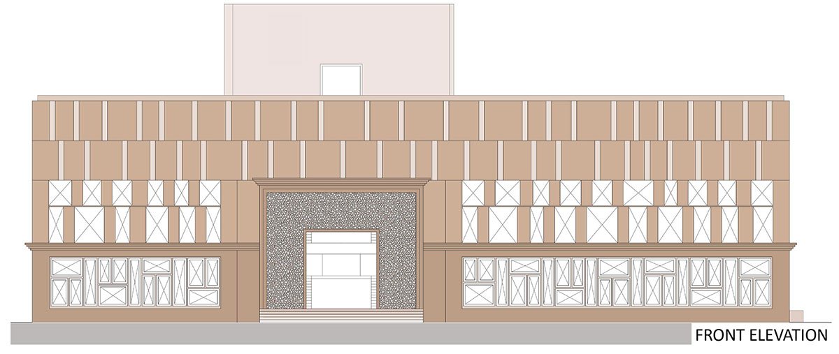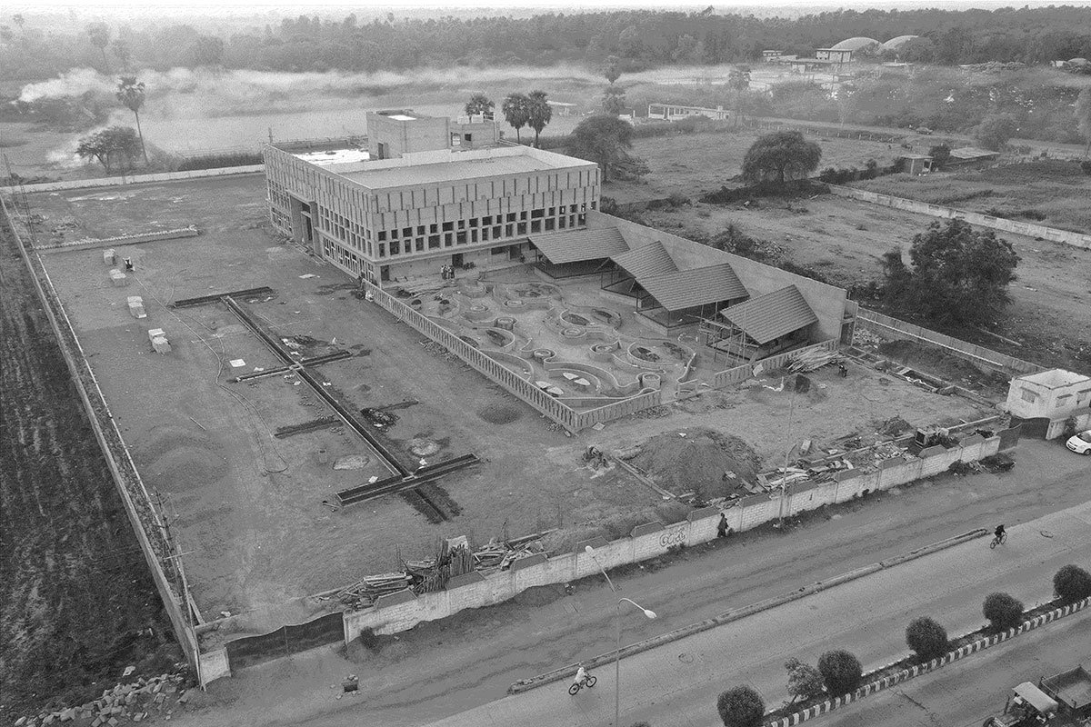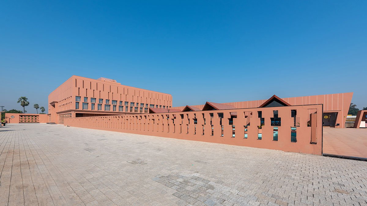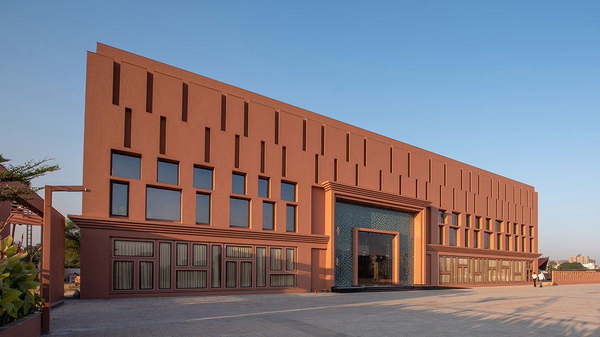 The main building too is divided into three primary grids, the west side houses admin, services, and guest rooms, the east side houses all banquets as well as the central kitchen while the central grid with atrium enables rational circulation between all the functions. This is expressed on the south facade of the building as a grand entrance breaking the symmetry of the organization. Here too, the progression of elements such as jaali on the ground floor holding randomly organized openings evokes the sensation of lightness in the volumes.