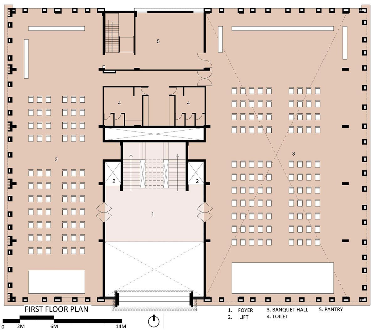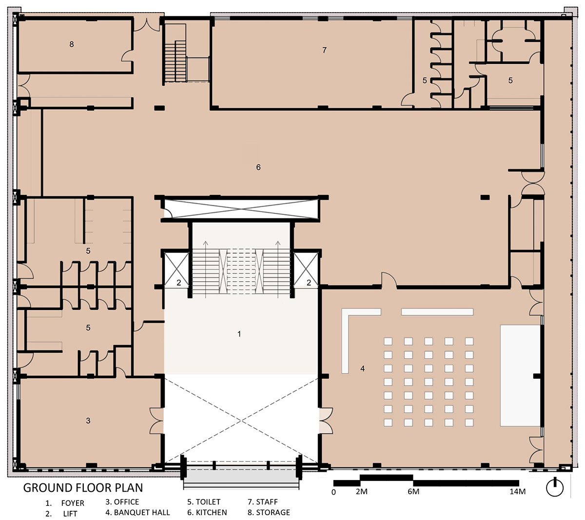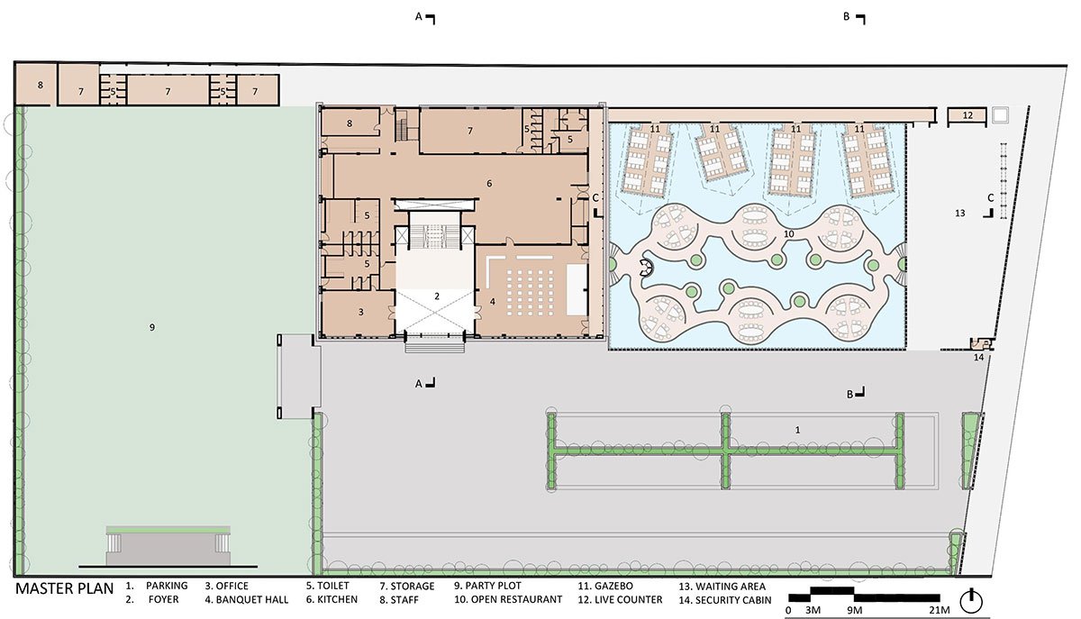 The hospitality industry depends upon the smooth operation of circulation and services to function well. Hence, the program is organized around a central yet discrete kitchen, related service facilities, and parking at the north-south edge respectively to effectively serve all banquets, party lawns as well as restaurants. This centralized placement of the main block containing all banquets, central kitchen, guest rooms, administration, and utilities; surrounded by parking, theme restaurants, and party lawns ensures circulation between all functions to be independent as well as collective from one another.