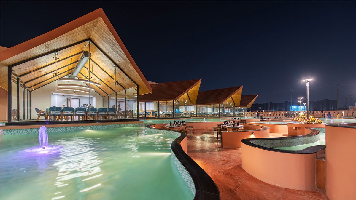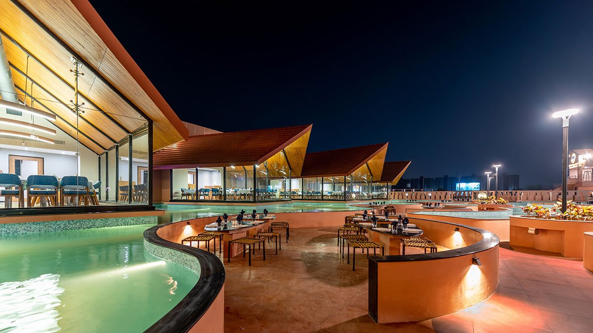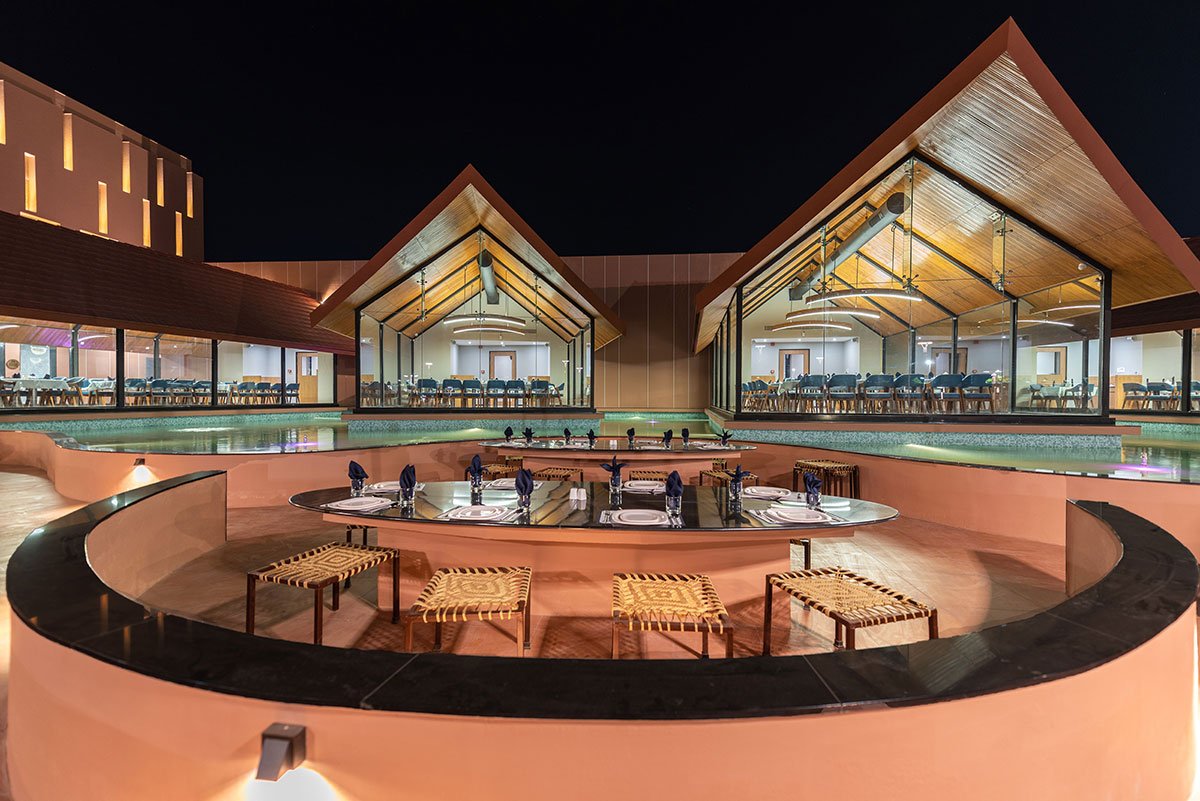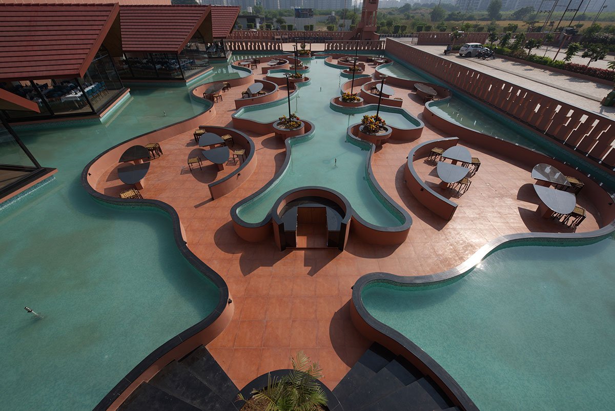 This results in a unique dining environment, generating connections and conversations between inside and outside through the waterbody. Here, the main building with its small random openings appears as a solid mass hovering above the waterbody, creating a solid backdrop for the theme restaurant sequence. The A/C restaurant too feels weightless as a glass wall resting on a floating plinth seems to hold the projecting roof above. The water level at the seating level of outdoor dining and almost at floor level of the A/C restaurant enhances the overall experience.