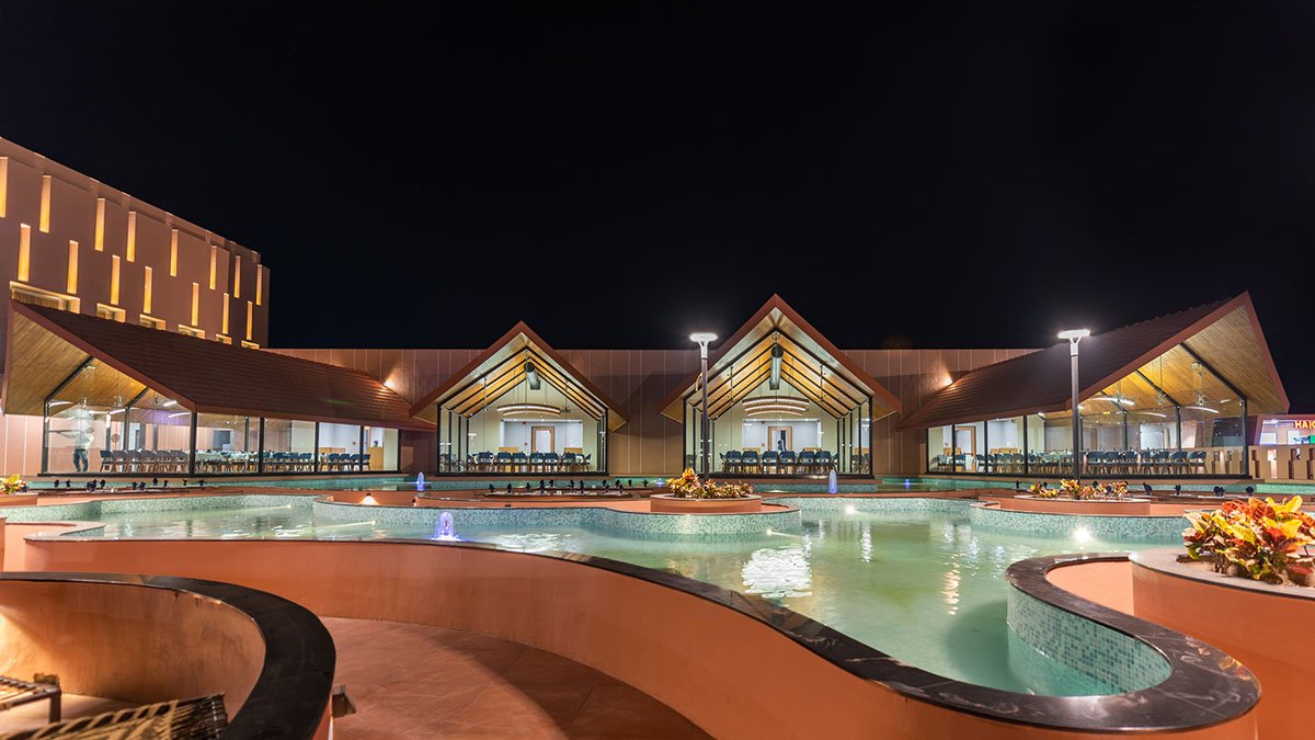 The progression of movements into the site is either by a gate into the parking area or by the waiting area into the theme restaurant. The formal organization of the theme restaurant borrows from Surat’s history as being a major trading port. The arrangement of the A/C restaurant is divided into separate volumes protruding from the service passage at the back and having various angles, banking on a water pool imitates boats anchored on the port. While the pool itself hosts outdoor dining areas clustered on small platforms surrounded by water.