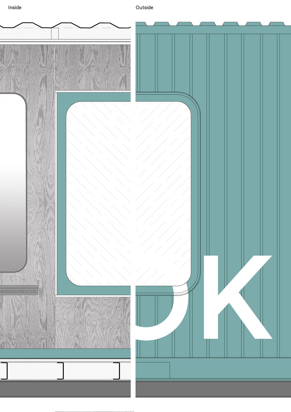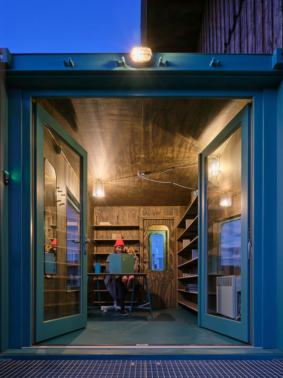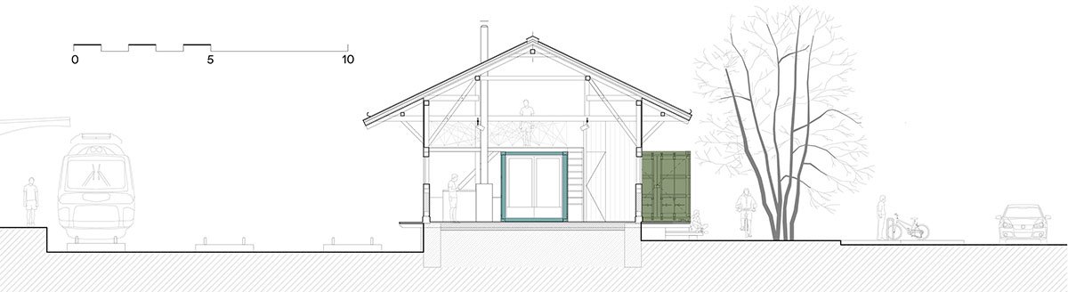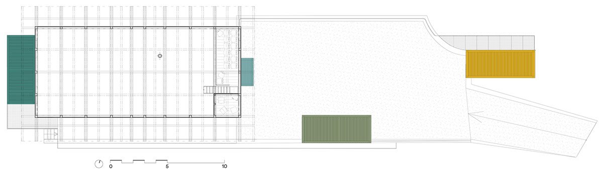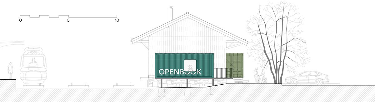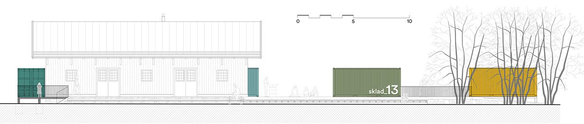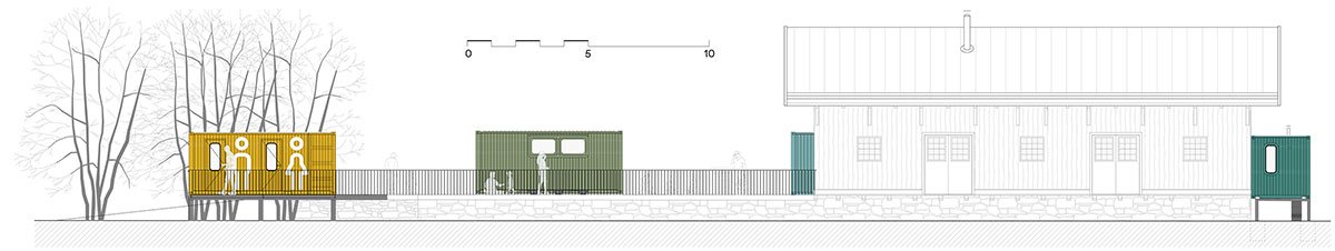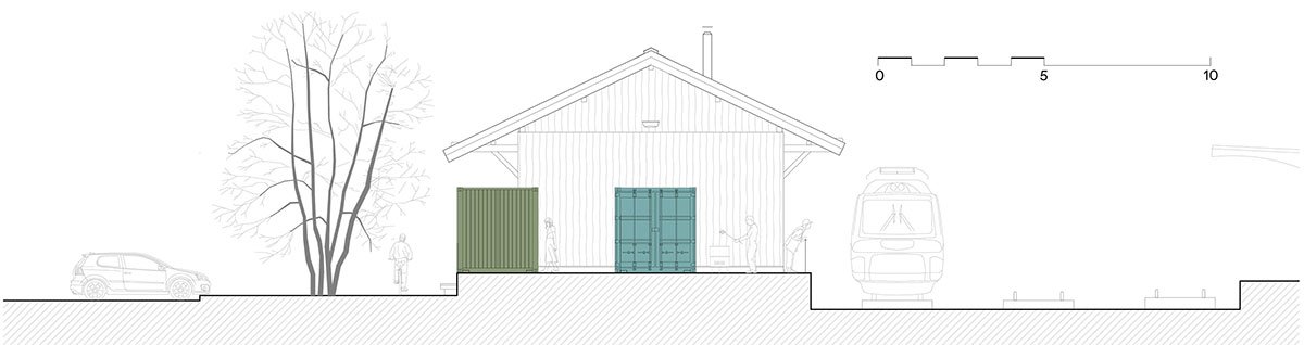 Shipping containers have been used three more times in the exterior for the accompanying facilities. The wavy sheet metal exterior of the containers is in stark contrast to the original wooden warehouse but materially corresponds with the cargo train cars that frequently pass by, and in this way clearly separates the original from the new.