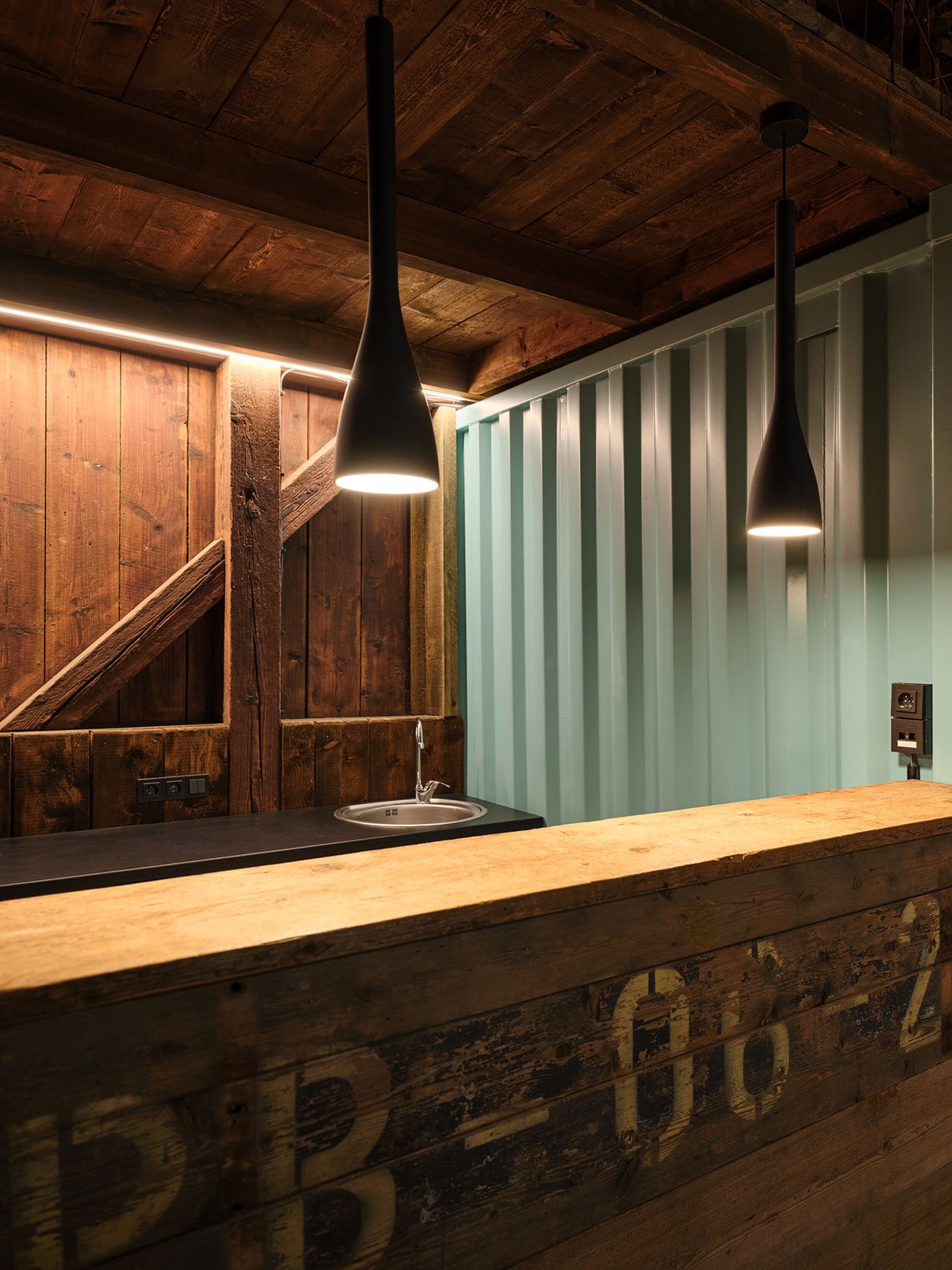 A few easily identifiable interventions have enriched the original architecture. By inserting a refurbished shipping container in the front a new entrance was created, adding a new dominant in the interior as well as allowing space for a small bar and a little gallery beneath the roof. Another prominent new element in the interior is a curved steel fireplace.