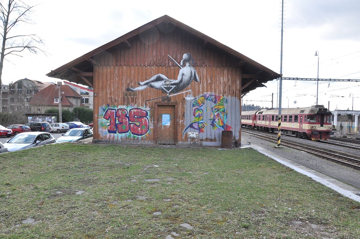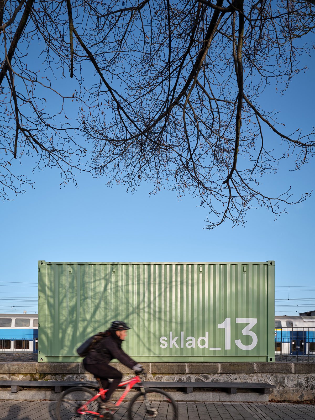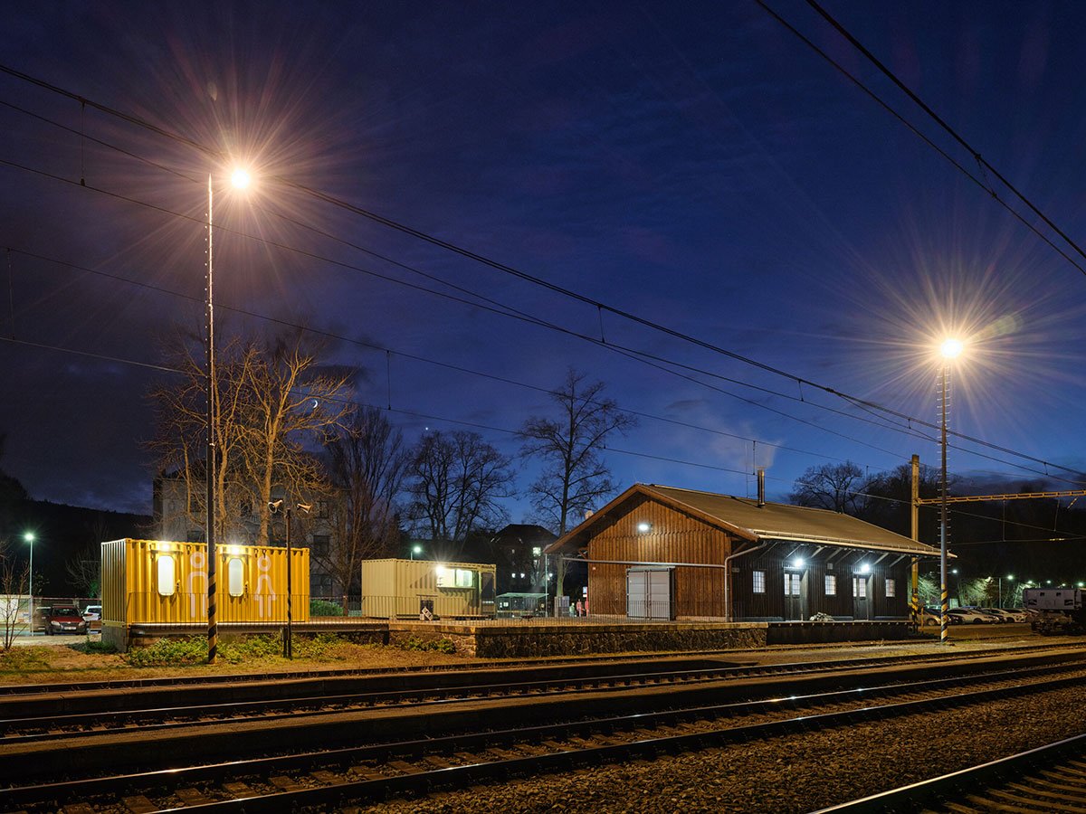 The containers have been insulated, and windows have been added to them, rounded at the edges, like on a train. Each container has its own expressive colour scheme. Both ramps running lengthways and at the front of the building have been enhanced by a continuous bench/step. The whole outdoor area of the Drevak has become a popular place for people to spend their time even aside from cultural events. The location of the building is very advantageous – next to the train station, opposite the transfer hub for regional buses, close to a car park and only a few minutes from the town center.