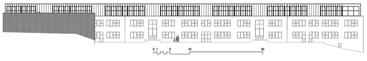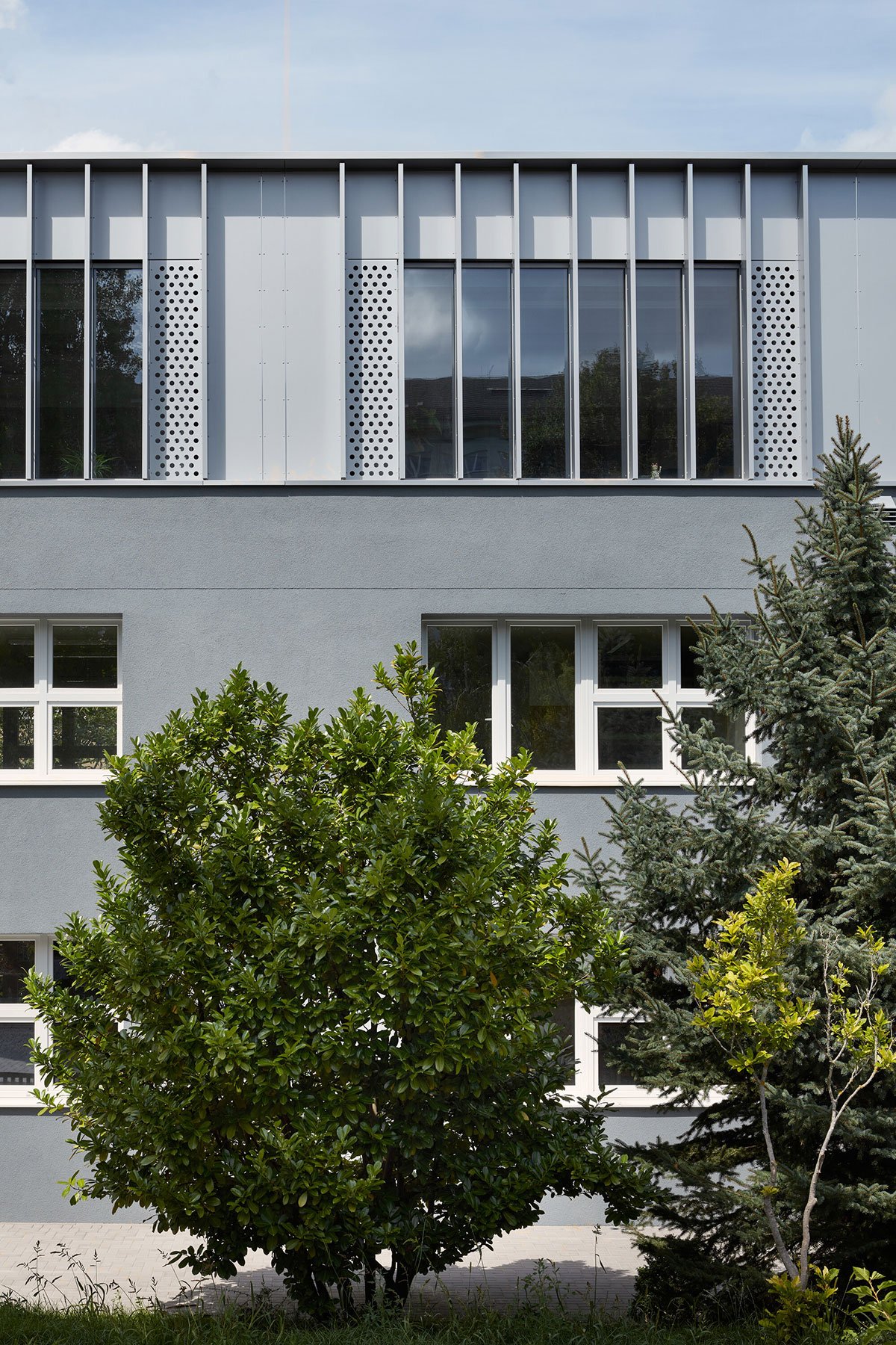 Both extensions’ facades are clad in durable metal sheeting. On the gymnasium, the metal panels resemble traditional wooden shingles, while on the classroom extension, they form vertical strips that transform into shading louvers around the windows, adding lightness and dynamic contrast to the robust contours of the original two-story building.