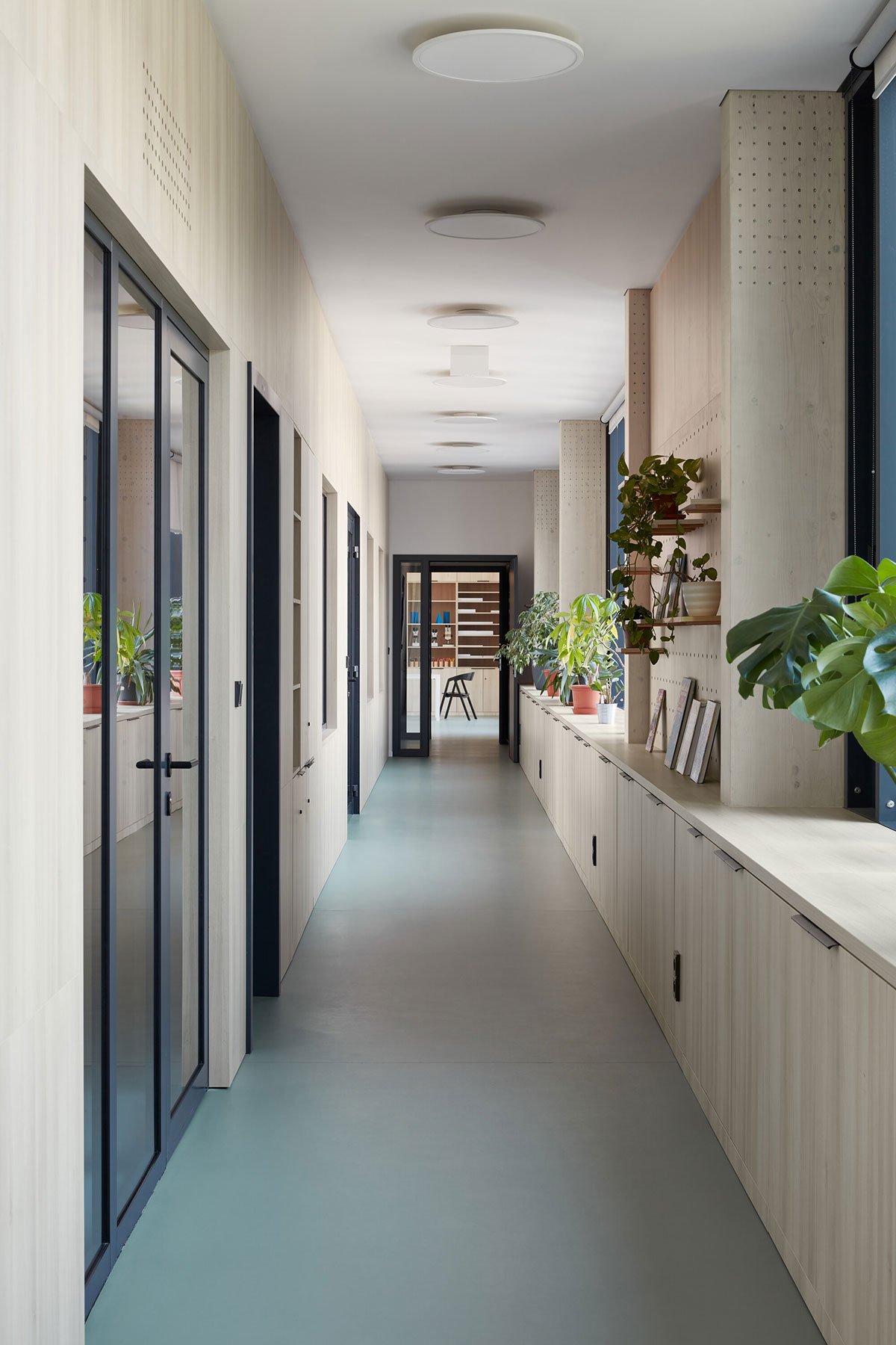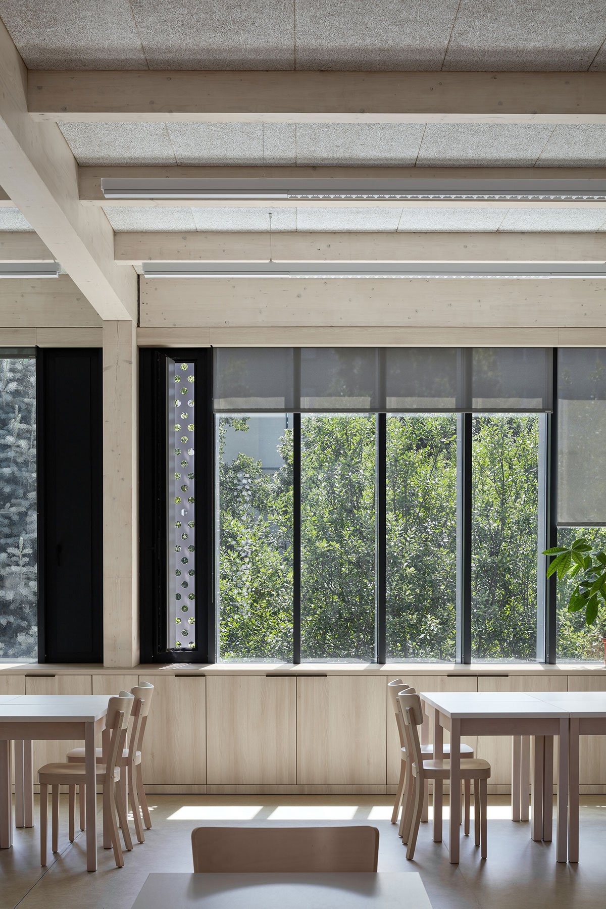 Wood, Metal, and Glass: Considering the load-bearing capacity of the original structure, the vertical extension was built using a wooden framework, which remains exposed in the interior. Wood is also featured in the built-in furniture and gymnasium cladding. In combination with glass, it plays a dominant role in the classrooms, contributing to ample daylight and excellent acoustics—creating optimal conditions for concentration and effective learning.