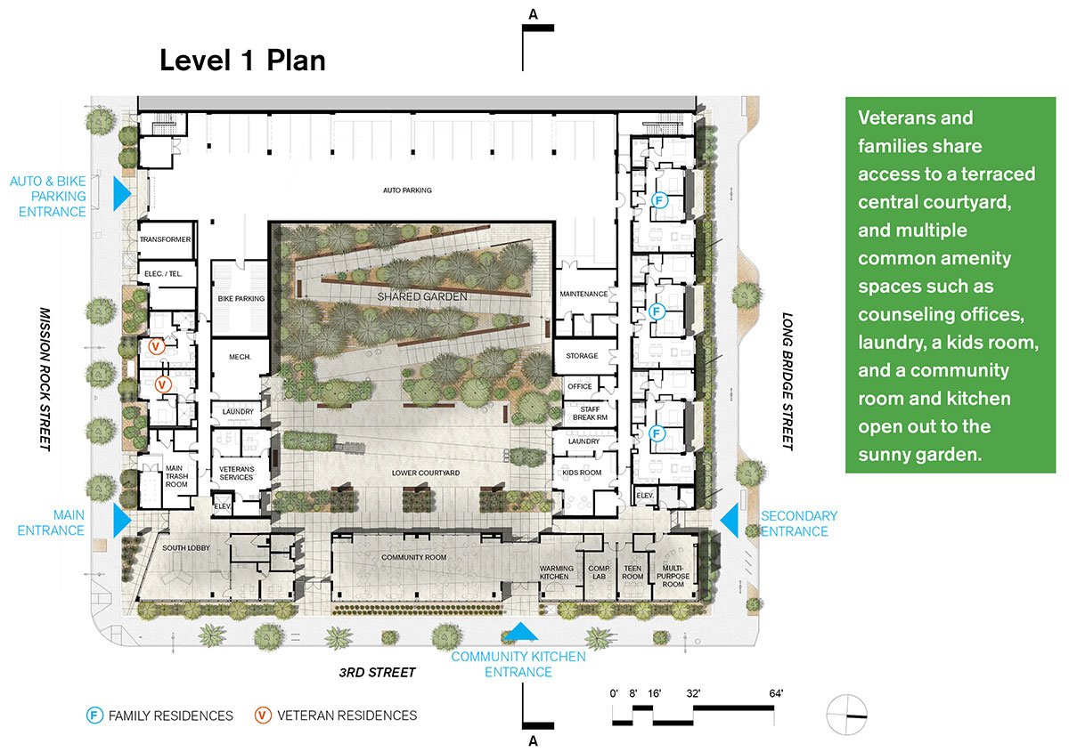This 124,000-square-foot affordable housing development provides 62 apartments for formerly homeless veterans and 57 apartments for low-income families, with ground-floor services for families, veterans, neighbors, and the greater community. Balancing civic scale with a feeling of home, the building enables sustainable lifestyles for its residents, prioritizing access to views and daylight, showcasing alternative energy generation, and connecting to nearby public transportation. The project frames a generous internal garden courtyard that balances a range of areas for reflection, interaction, and play.