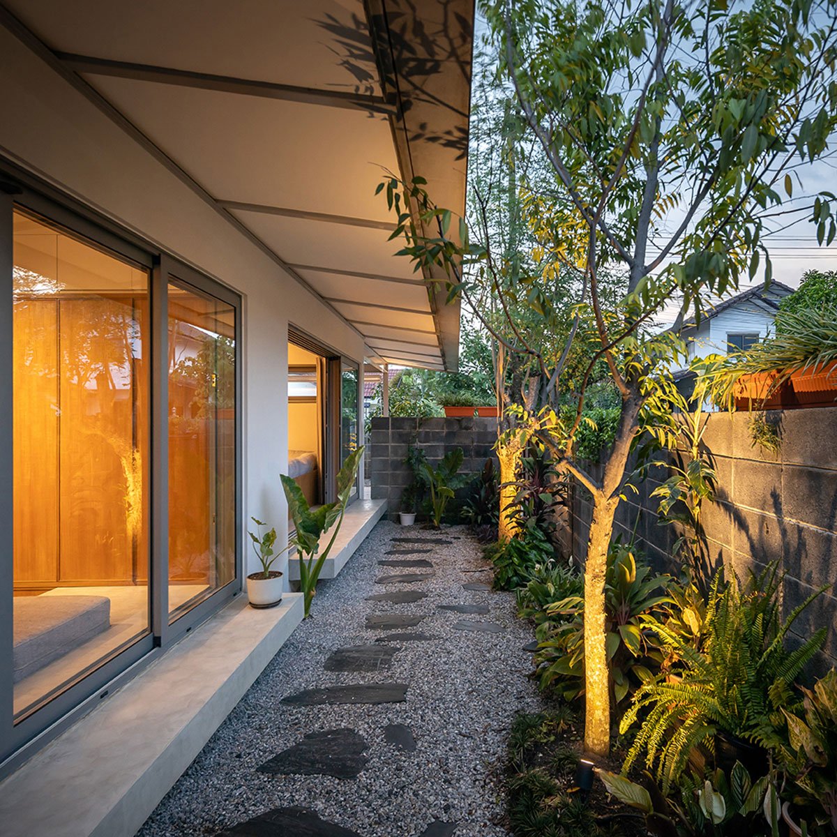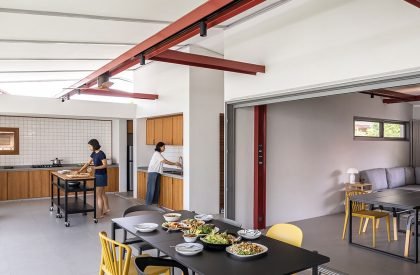 The project originated from the homeowner’s plan to retire from business and relocate from a shophouse to a single-story house with more space, greenery, and no staircases. Settling within a housing estate adjacent to her sister’s residence, the primary challenge lay in creating a house capable of facilitating various family activities, inclusive of the homeowner’s siblings and grandchildren, who frequently gather for cooking sessions and communal meals. However, there was an issue with a neglected space separating the two houses, which was an undeveloped road.