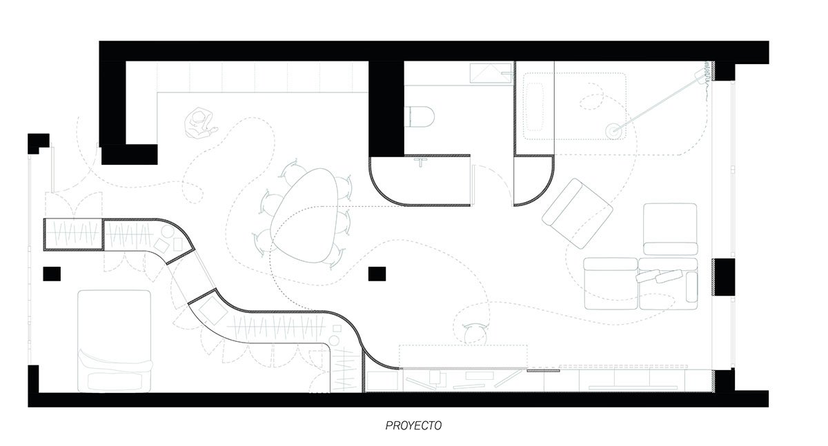 Excerpt:EMB is a residence designed by the architectural firm mome.estudio. An open space where all the elements that compose the living space were to be introduced, including the option of two bedrooms and a work area. The house’s entire program is resolved by using only two architectural elements. First, an equipped strip is inserted along the space, serving as storage and separating the bedroom from the living room on one side while turning it into a flexible work area at the end. It leads to a fluid common area where the kitchen – dining – living room follow naturally after the other.