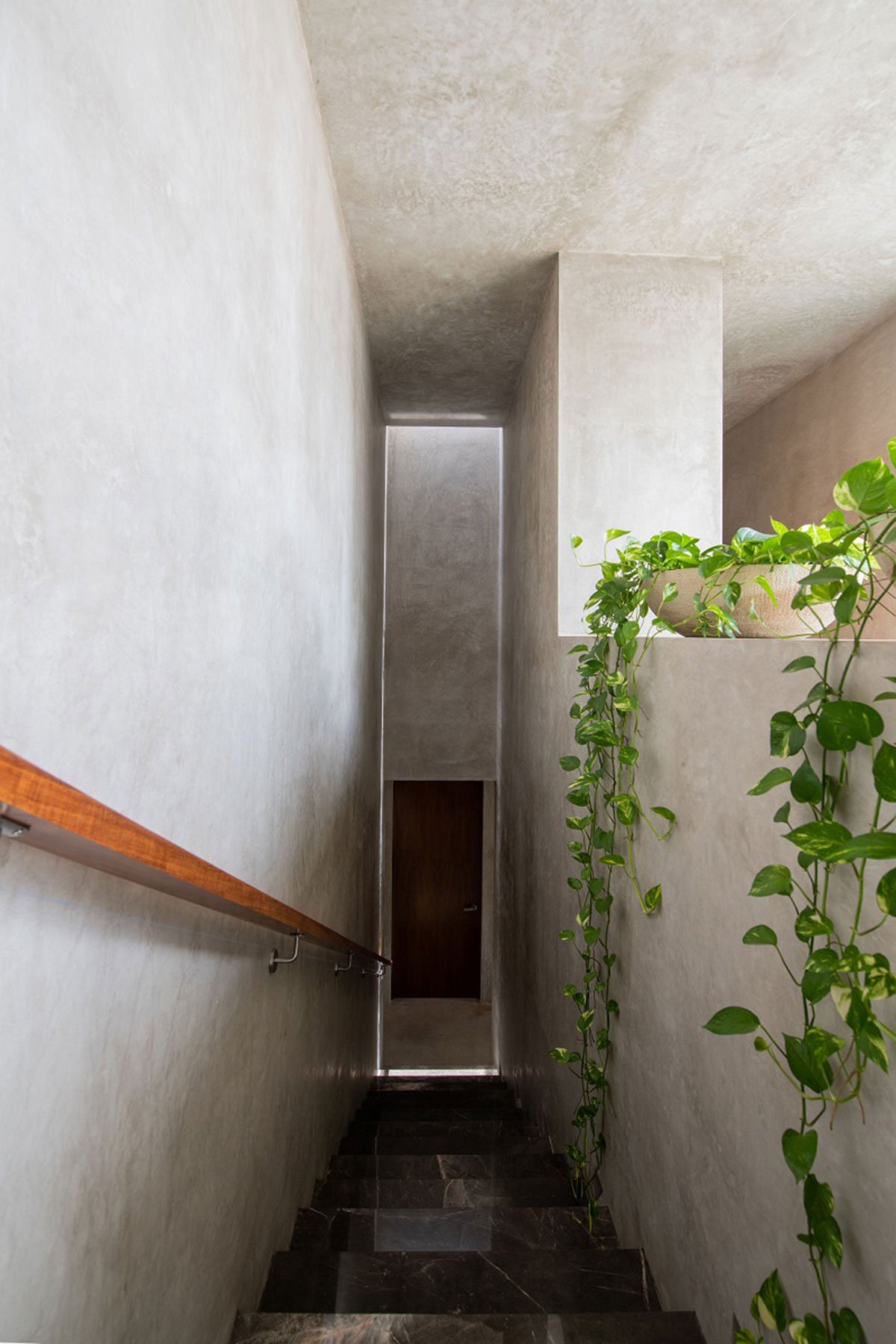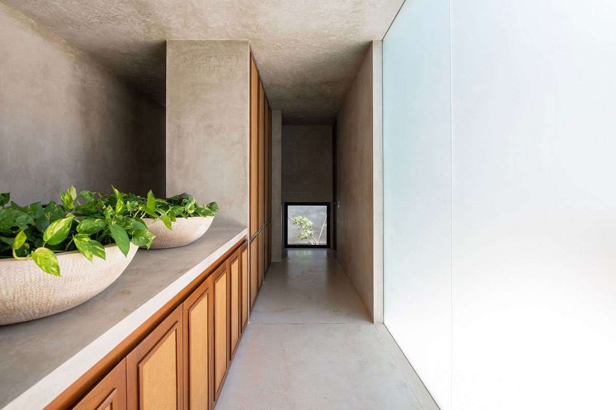 The materiality is focused on low maintenance, coziness and sobriety. Gray cement-based stucco was used on ceilings, interior and exterior walls; Tzalam wood and natural fibers for doors and fixed furniture, gray concrete floors, matte black ironwork and aluminum, clear and frosted glasses, marble and dark granite details, stainless steel faucets and door handles.