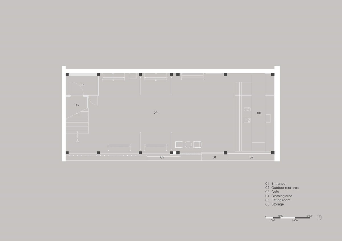 The prominent architecture is a two-floor building. The first floor is for coffee and clothing exhibition, and the second floor is a multi-functional exhibition space to cope with the demand of the brand to use the offline store. The facades correspond to each functional program with light transmittance.