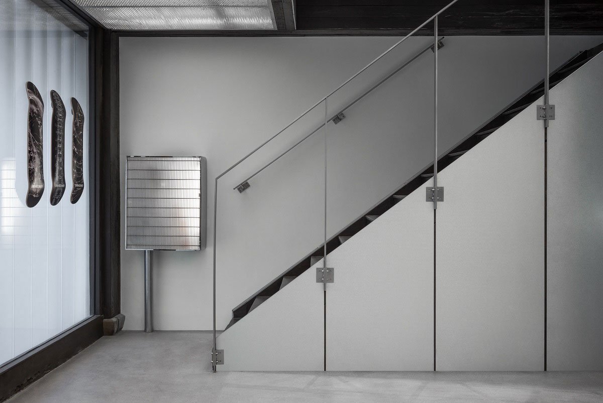 The wood stair leading towards the 2nd floor exhibition space. © Minjie Wang