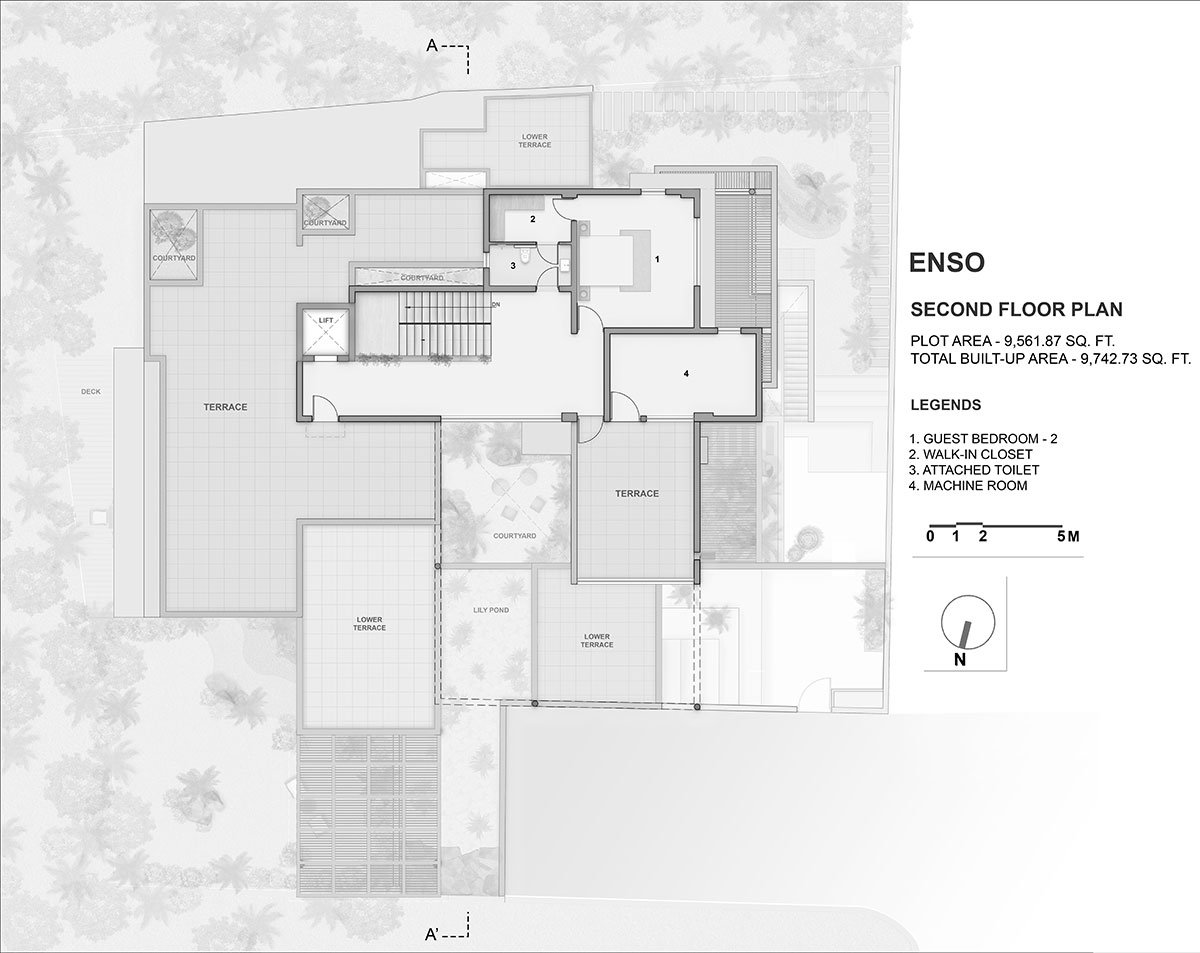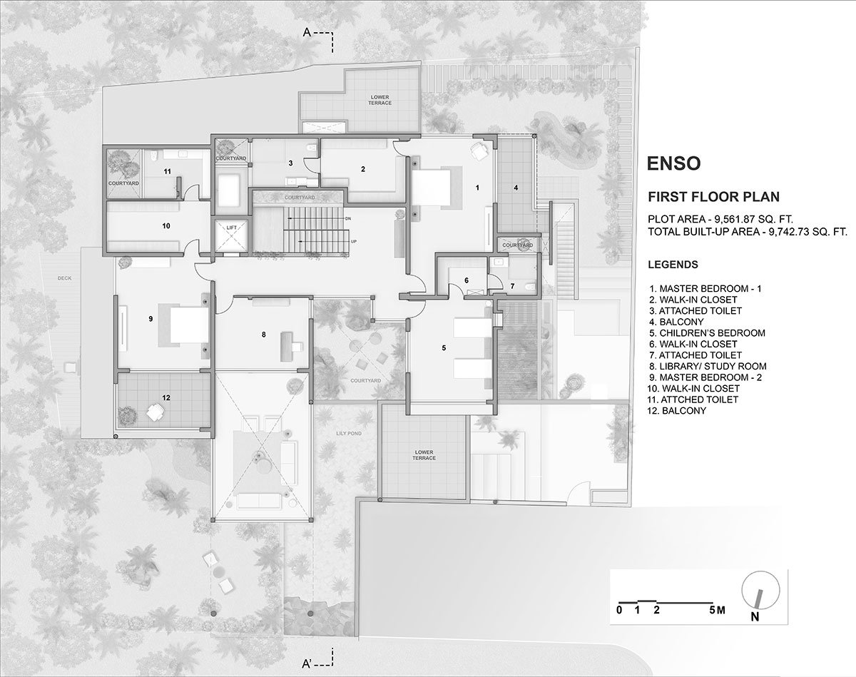 Architectural Planning–The Form: The plan centres around an Enso Garden, sit-out, and rockfall, with living spaces woven around, ensuring the home integrates seamlessly with the garden. This core element significantly influences the Architectural layout. Enso’s form emphasizes linear dynamics and precise spatial organization, featuring open courtyards and water elements, promoting a fluid transition between interior and exterior environments and enriching the connection with nature.
