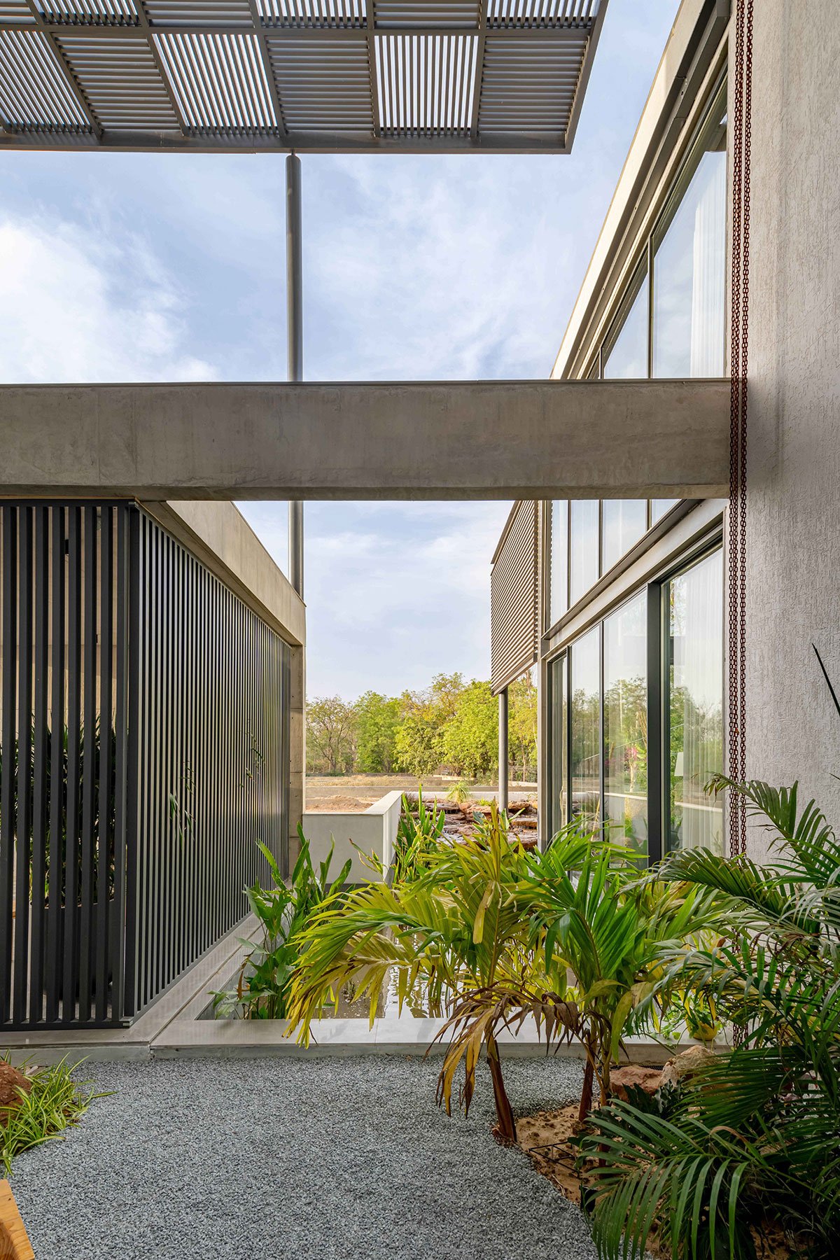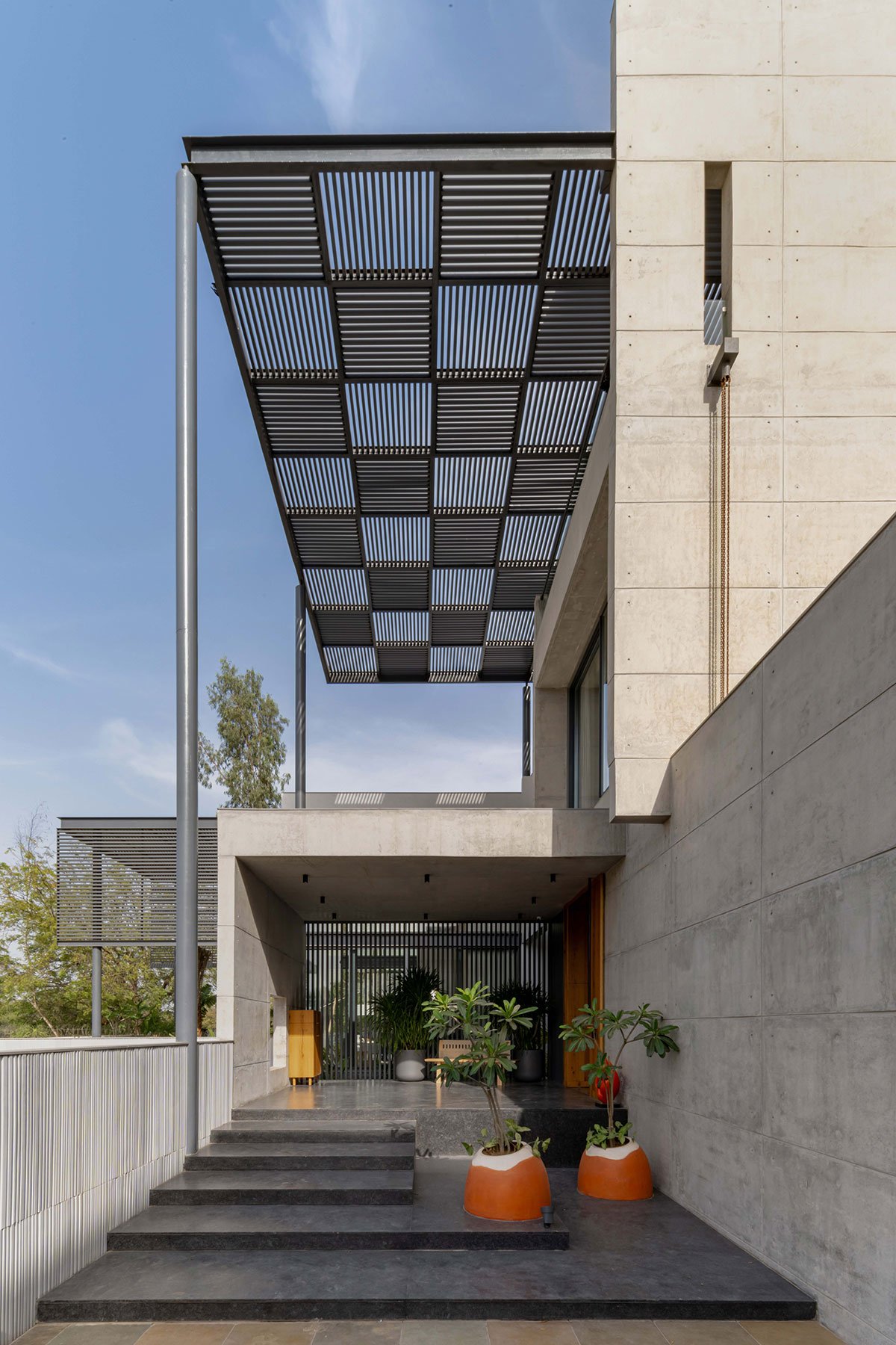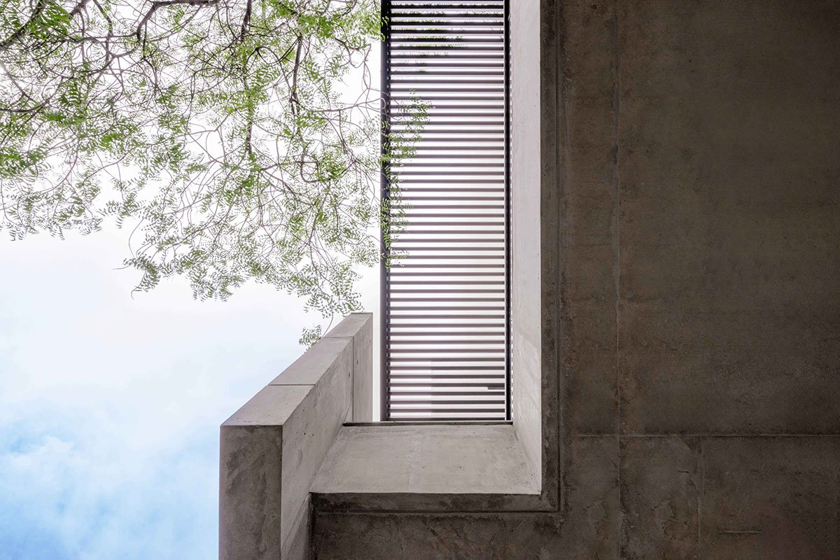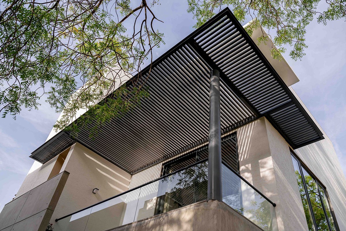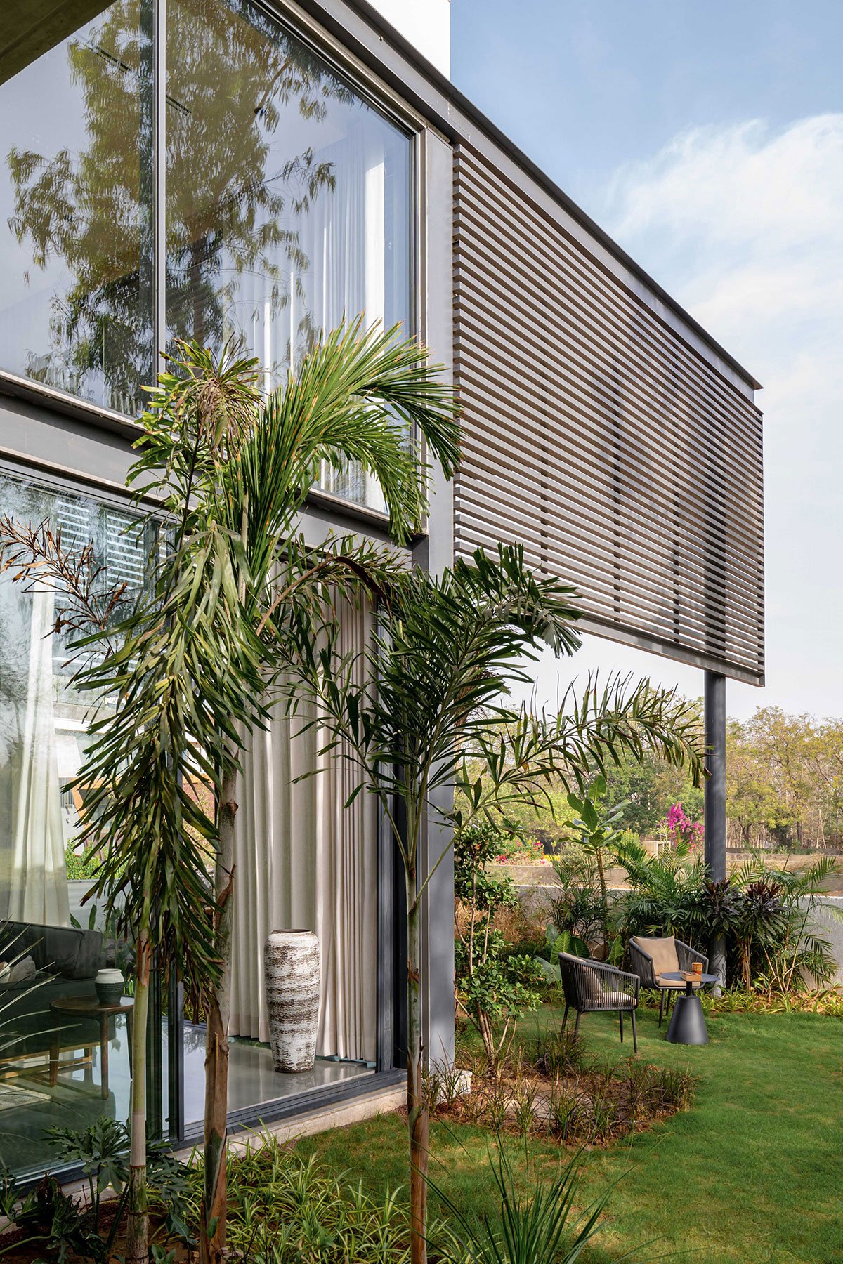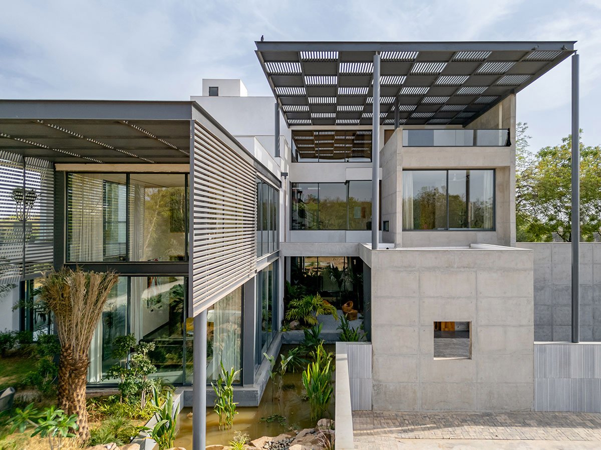 Additionally, vertical transition spaces within the home, such as staircases and elevators, maintain a seamless connection to the environment throughout the villa. A skylight enhances the staircase area. The orchestration of large, glazed expanses, protected from the heat via the elevation boxes, instead of obtrusive walls is a conscious calibration to lend a sense of transparency, connectivity and inclusion. This architectural design thoughtfully balances solids and voids through courtyards and balconies. The facade prioritizes natural light and ventilation with recessed windows and terraces, employing climate-responsive strategies to combat the area’s intense heat.