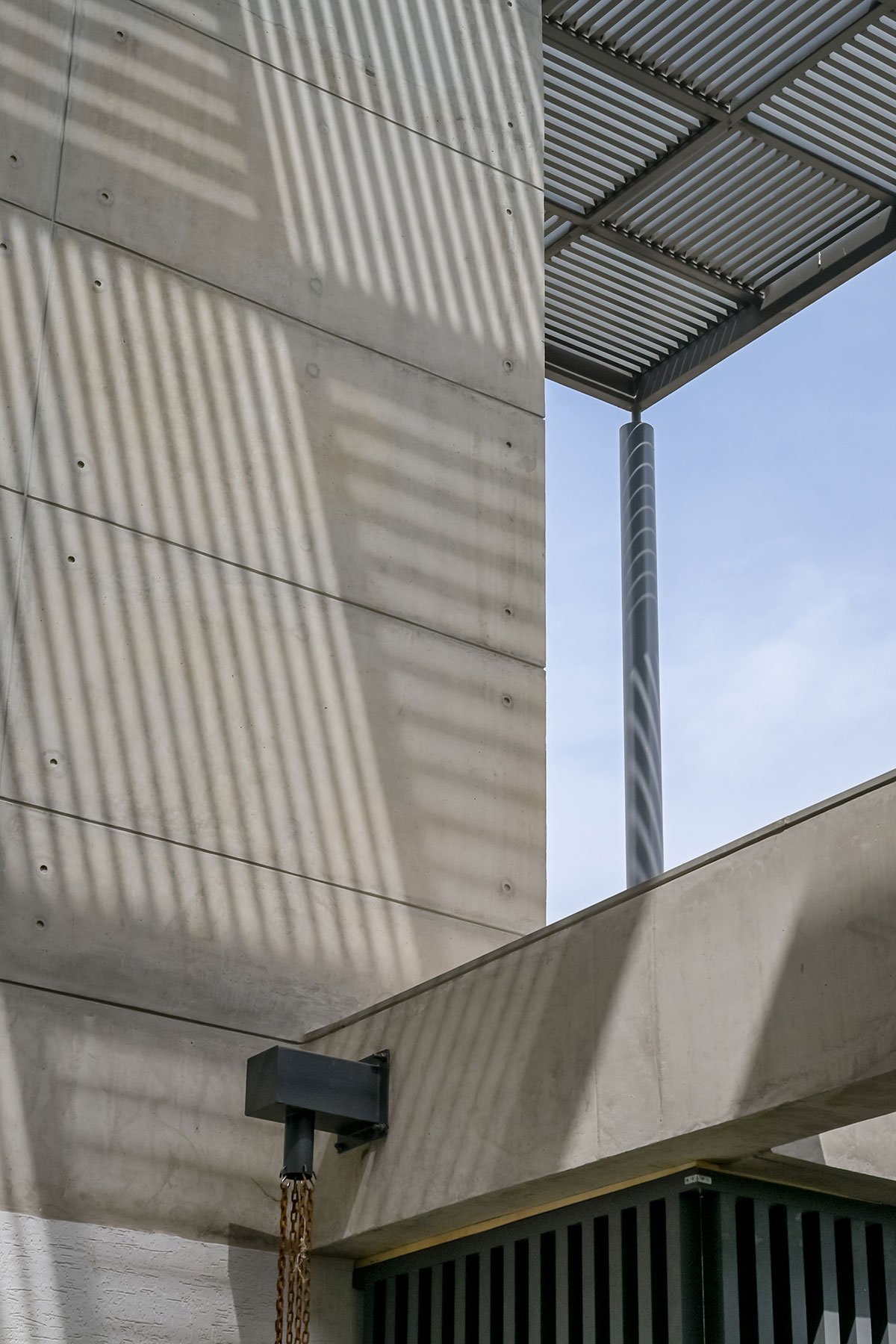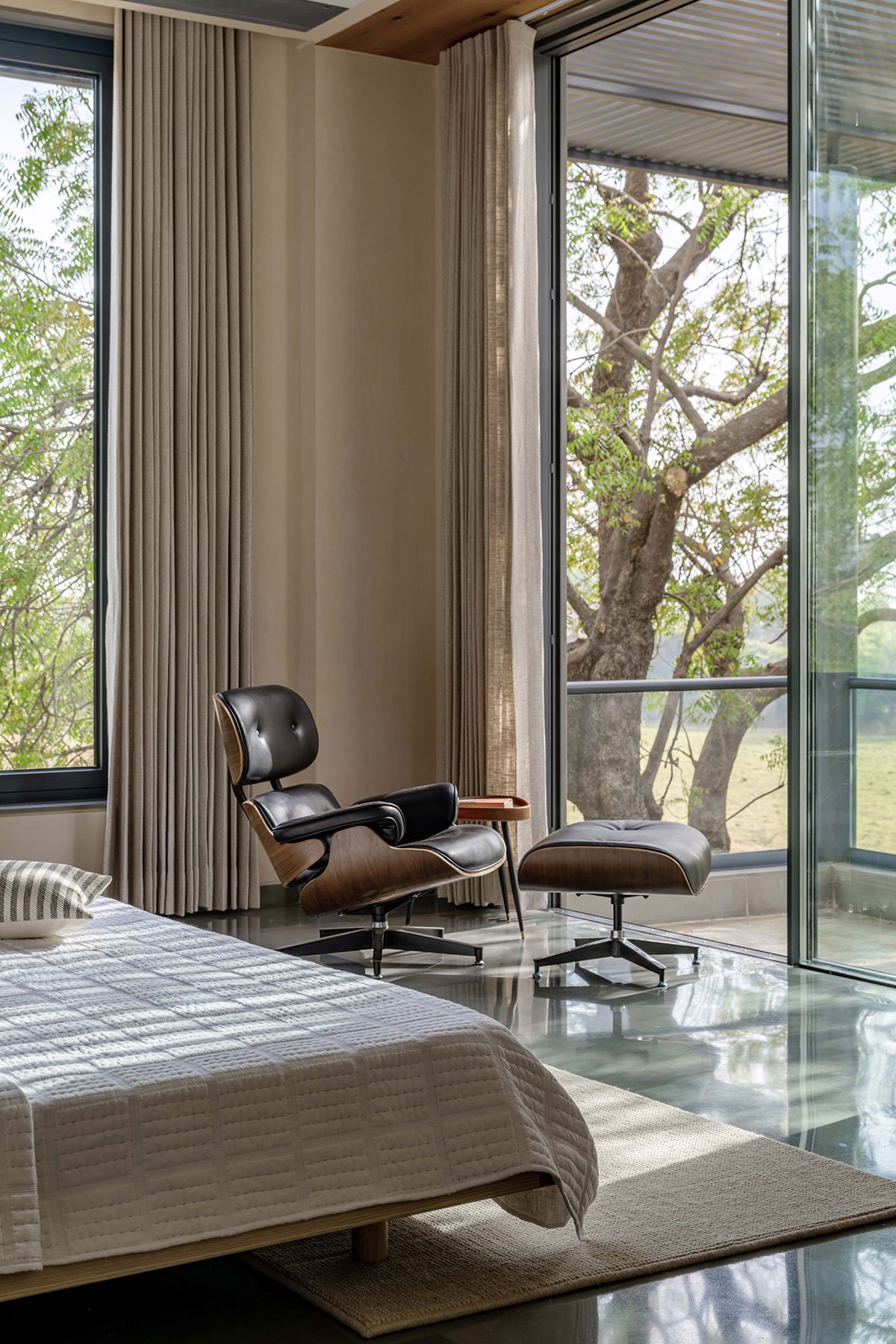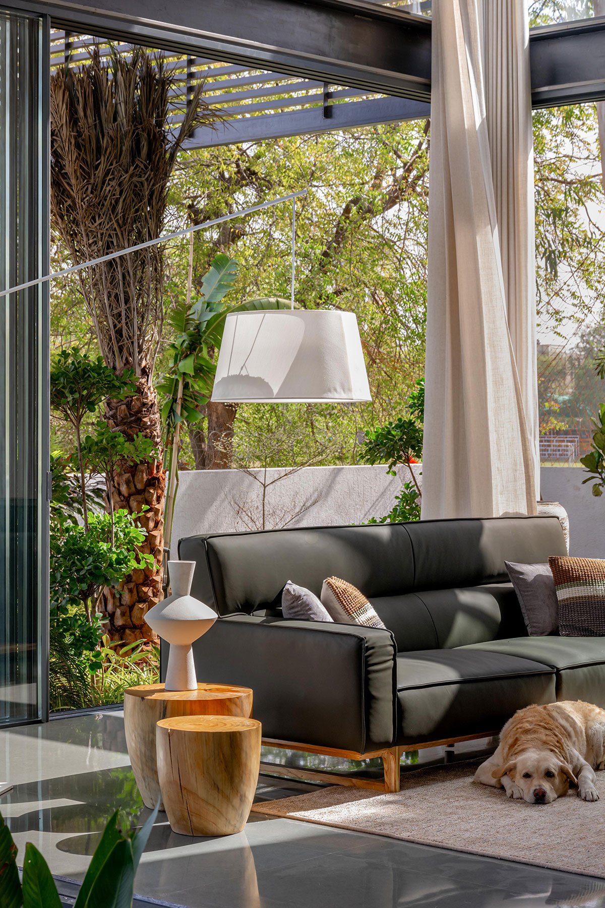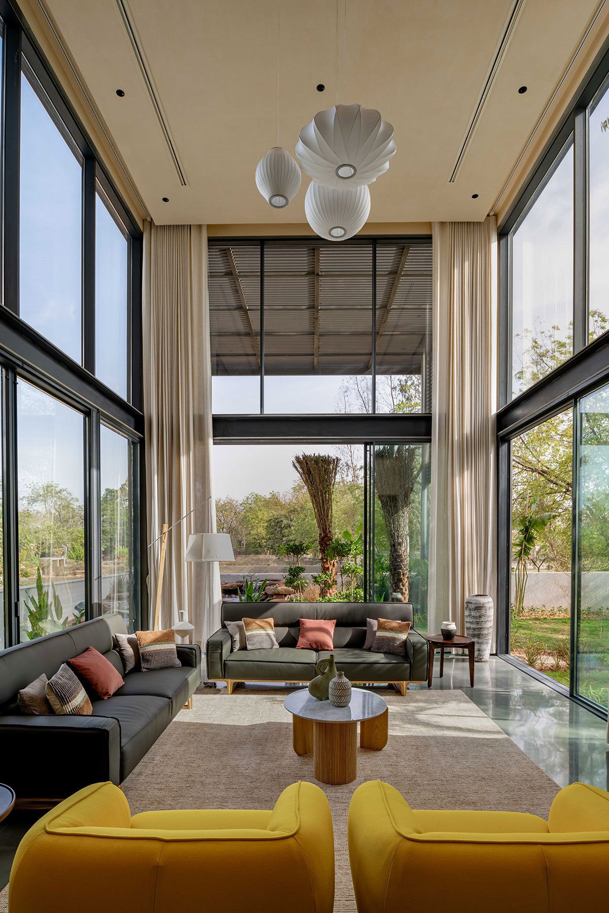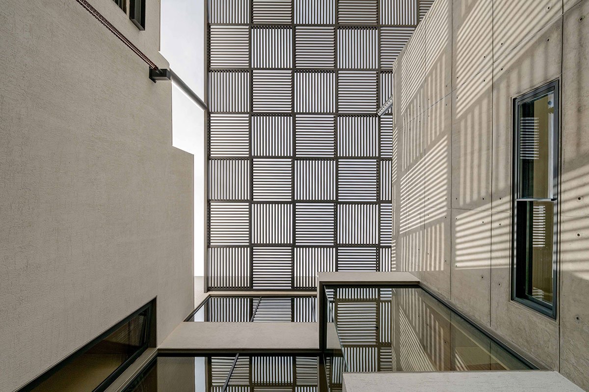 Additionally, vertical transition spaces within the home, such as staircases and elevators, maintain a seamless connection to the environment throughout the villa. A skylight enhances the staircase area. The orchestration of large, glazed expanses, protected from the heat via the elevation boxes, instead of obtrusive walls is a conscious calibration to lend a sense of transparency, connectivity and inclusion. This architectural design thoughtfully balances solids and voids through courtyards and balconies. The facade prioritizes natural light and ventilation with recessed windows and terraces, employing climate-responsive strategies to combat the area’s intense heat.
