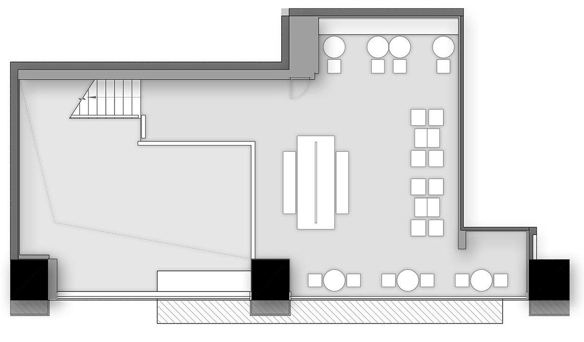 The façade is divided vertically in a 1:1 ratio, with the ground floor façade being clean and simple, with the first floor sharpening its permeability through large areas of floor-to-ceiling glass, thus creating a contrast between material and reality while mapping the surroundings onto the glass. The design demonstrates an inclusive gesture independent of its surroundings and the building but simultaneously tries to embrace and integrate it.