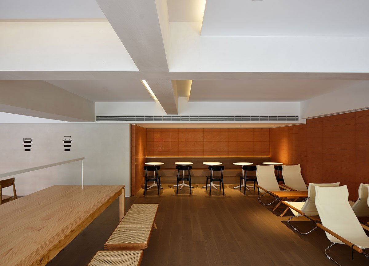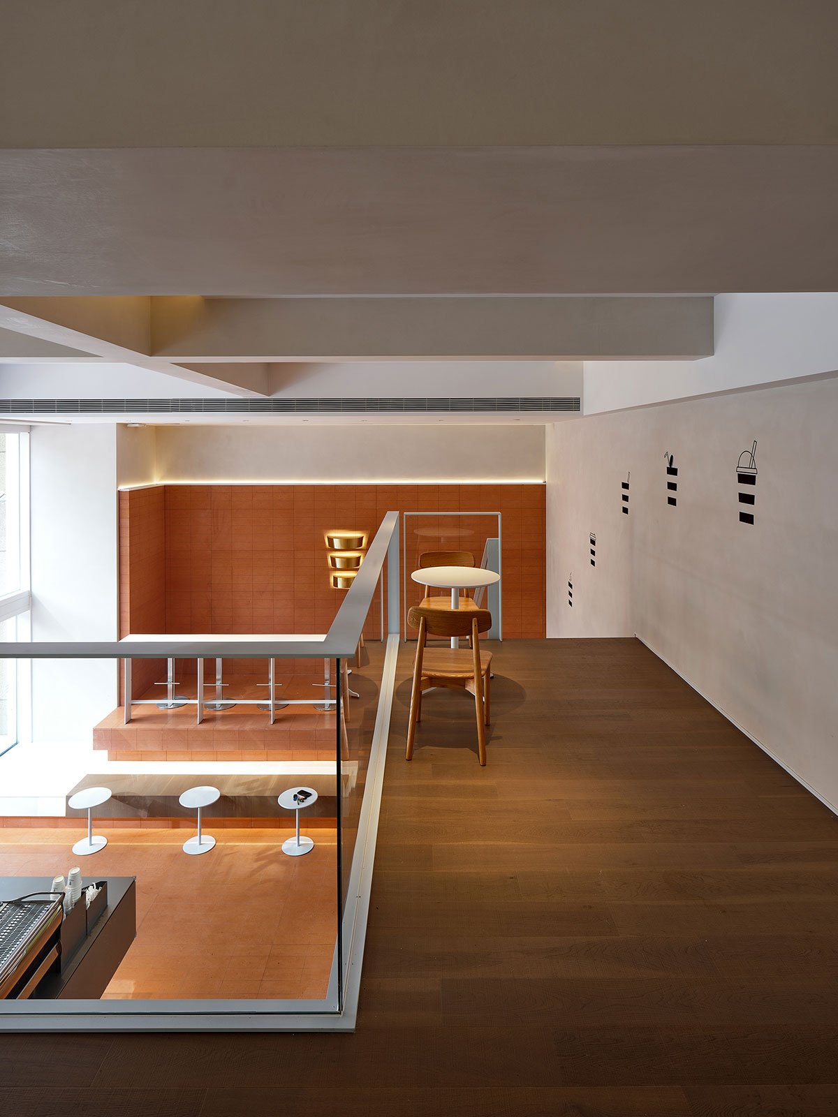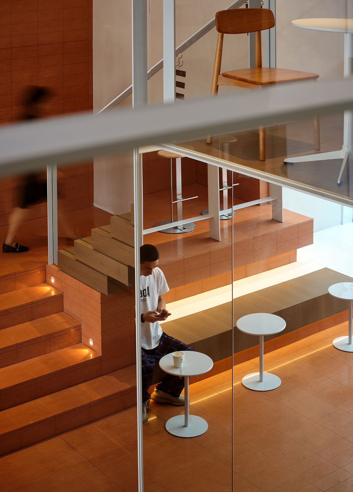 The overall design is dominated by red and white. The flooring and most interior walls are made of red brick, wood and stone, allowing the space to form a material sensory unity that extends from the inside to the outside.