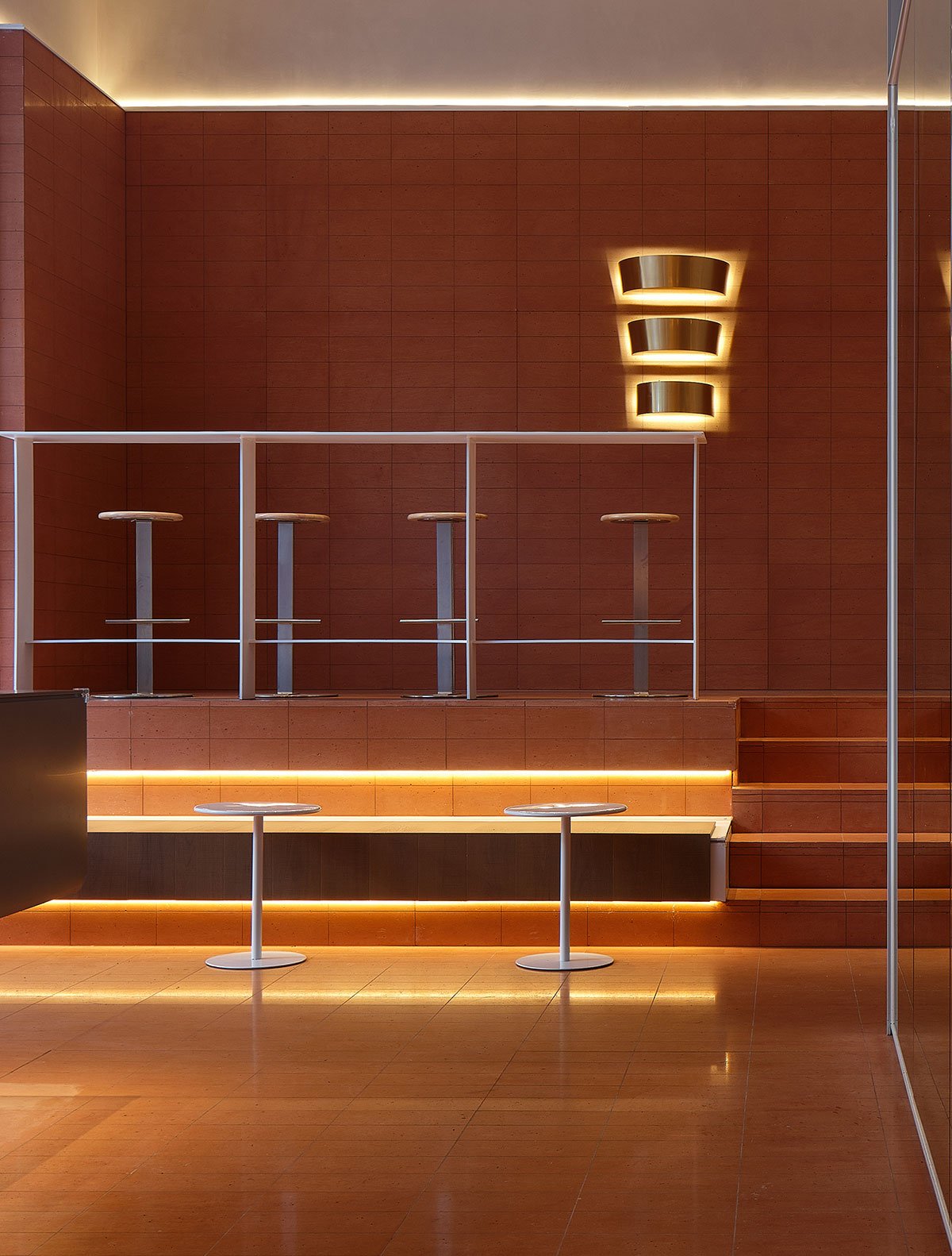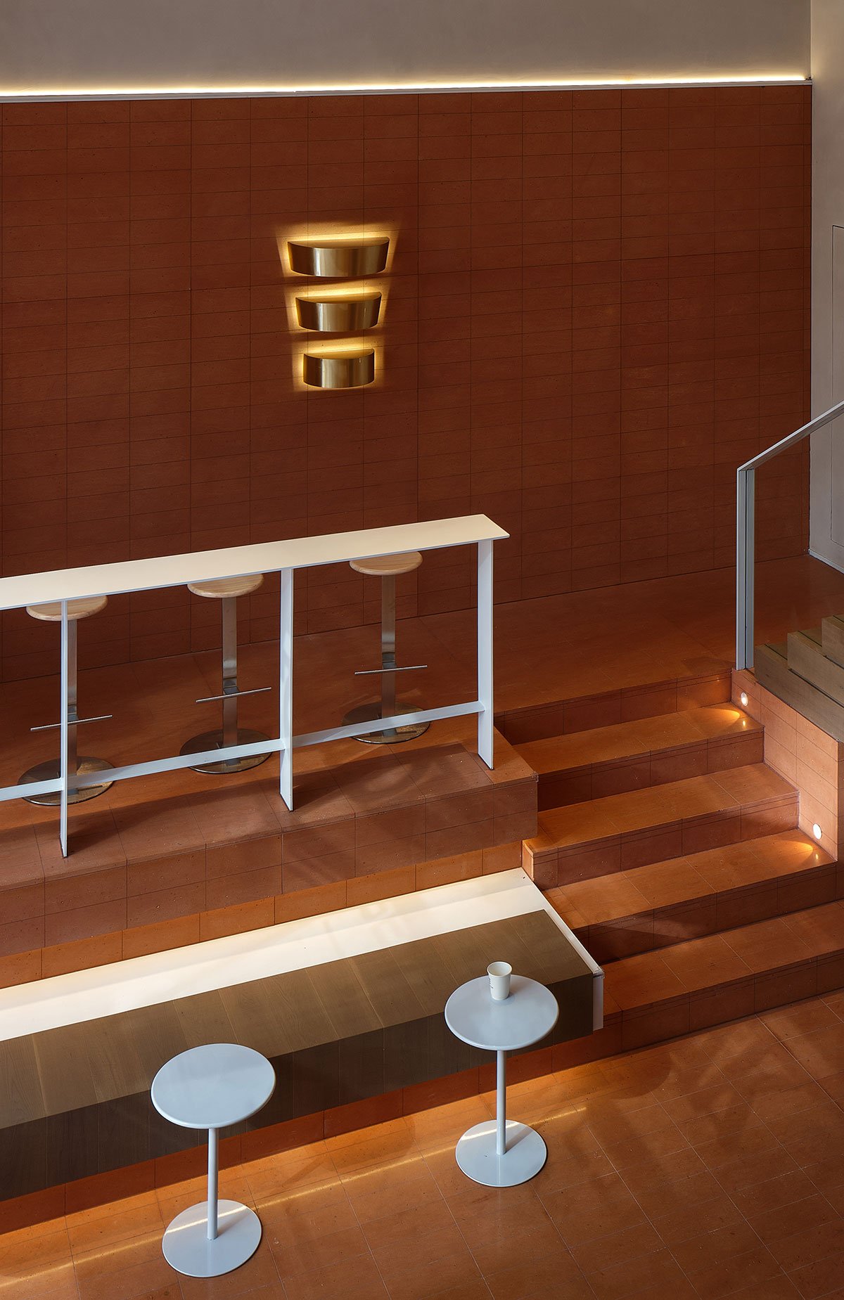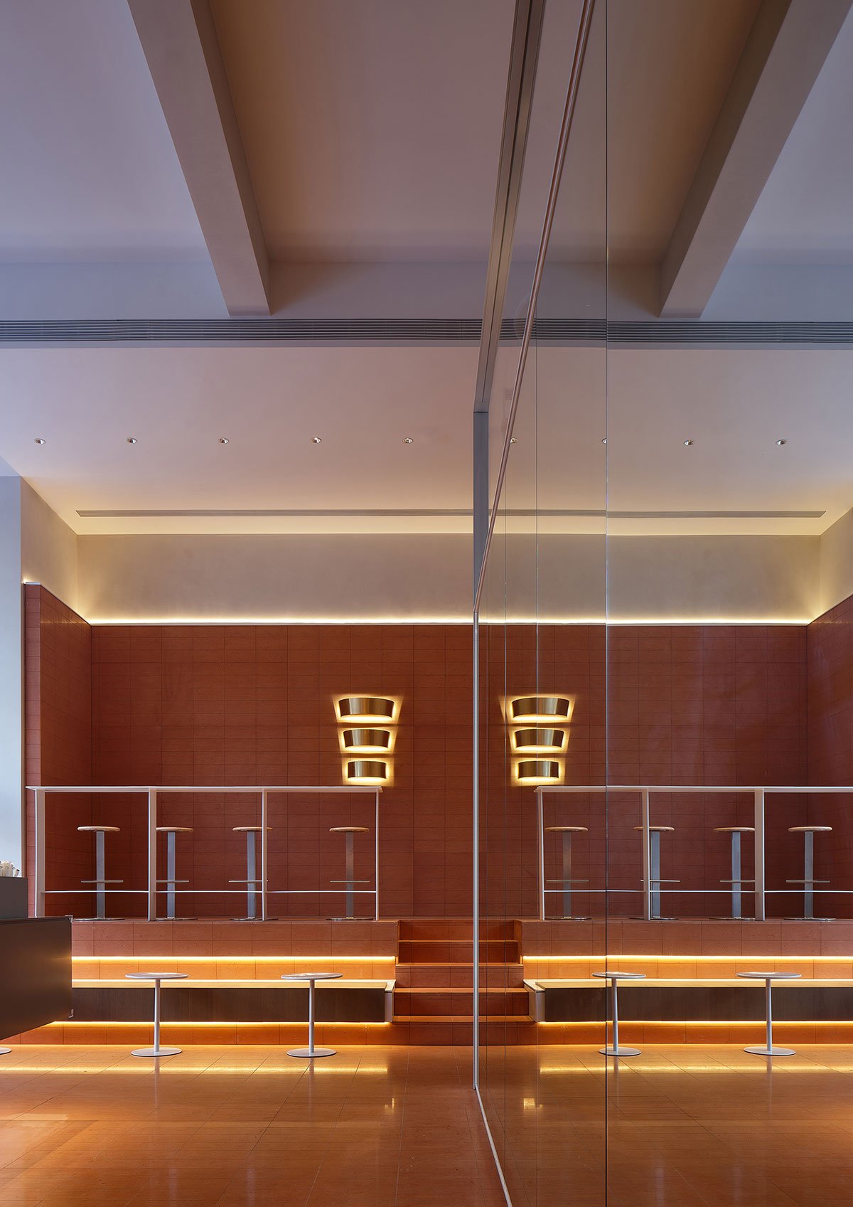 The overall design is dominated by red and white. The flooring and most interior walls are made of red brick, wood and stone, allowing the space to form a material sensory unity that extends from the inside to the outside.
