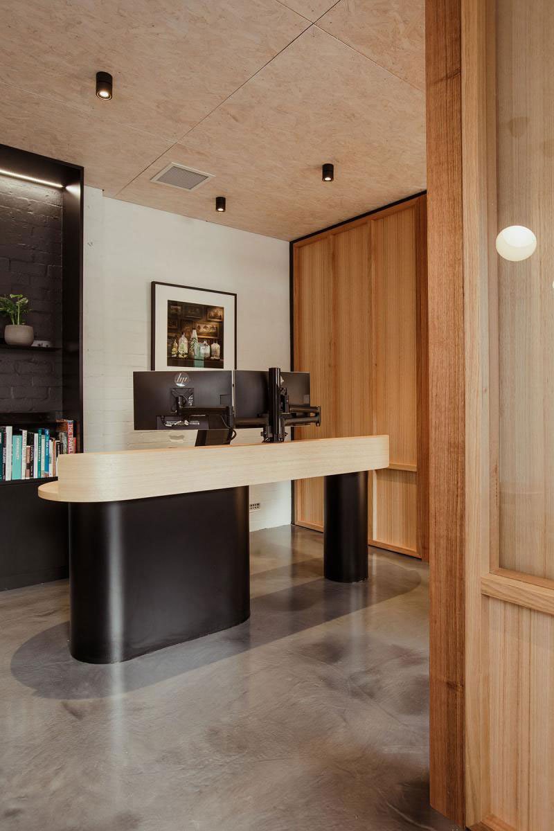 We were challenged by the compact 180sqm of floor space to fit all the client’s needs into the space, along with minimal windows throughout the existing building. It was important to use materials that illuminated and warmed the space. We selected Tasmanian Oak to be one of the main timbers used throughout the office space for warmth, light, a soft touch in a narrow space.