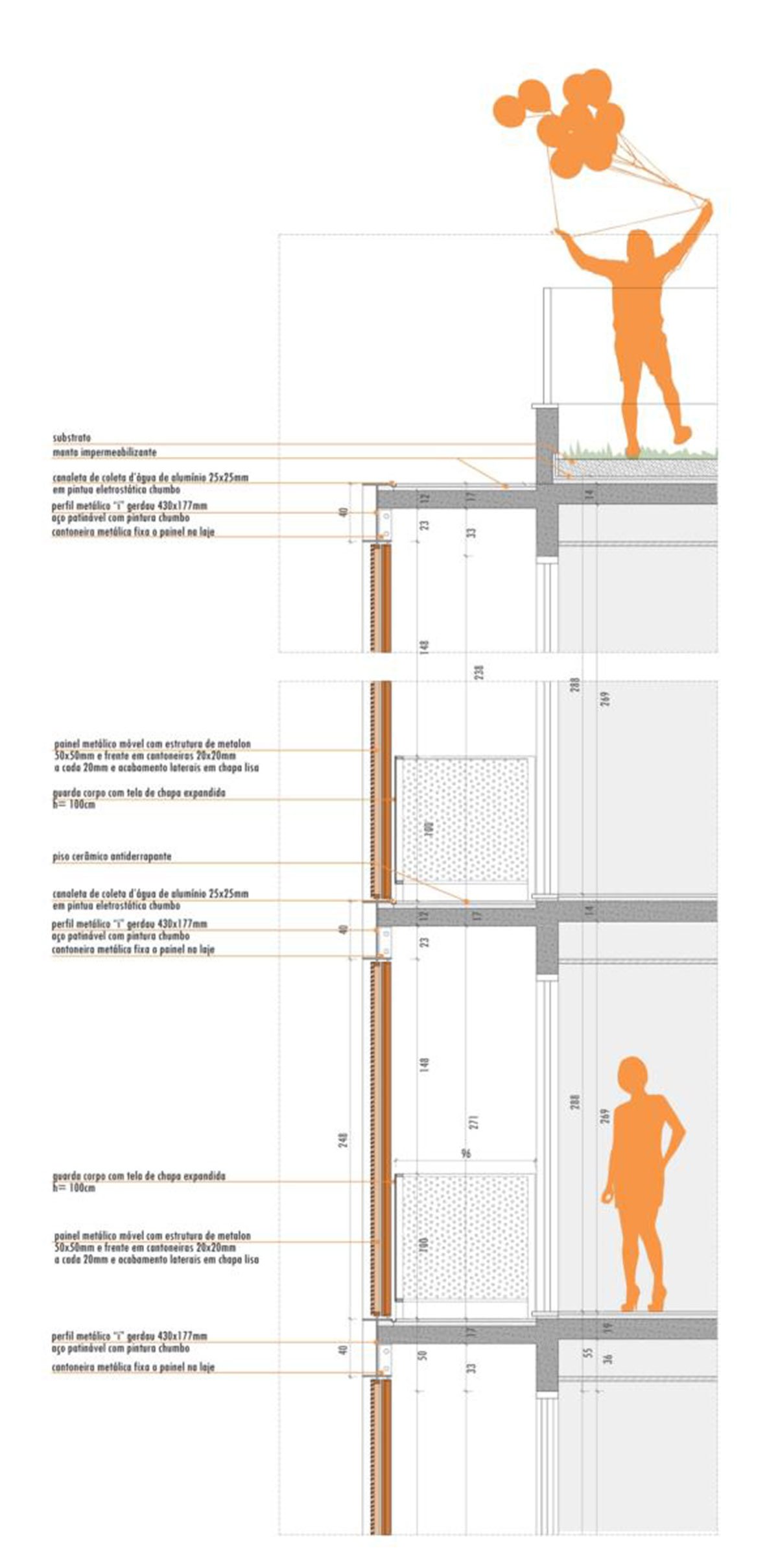 The apartments have a rationalized layout: clean, rectangular spaces were designed. The rooms have a good cupboard area and all the plants are flexible, allowing changes during use. The types vary from 01 bedroom (65m²) to 4 bedrooms (143m²). All units receive the morning sun and have balconies, increasing the entry of light, which provides a better quality of life for residents. On the 7th and 8th floors are the development’s duplex apartments. There are also 3 units here, but with double height, and a fantastic spatial range. In the smaller units, a pleated concrete staircase takes us to the upper level, where a walkway connects the environments of the intimate area.