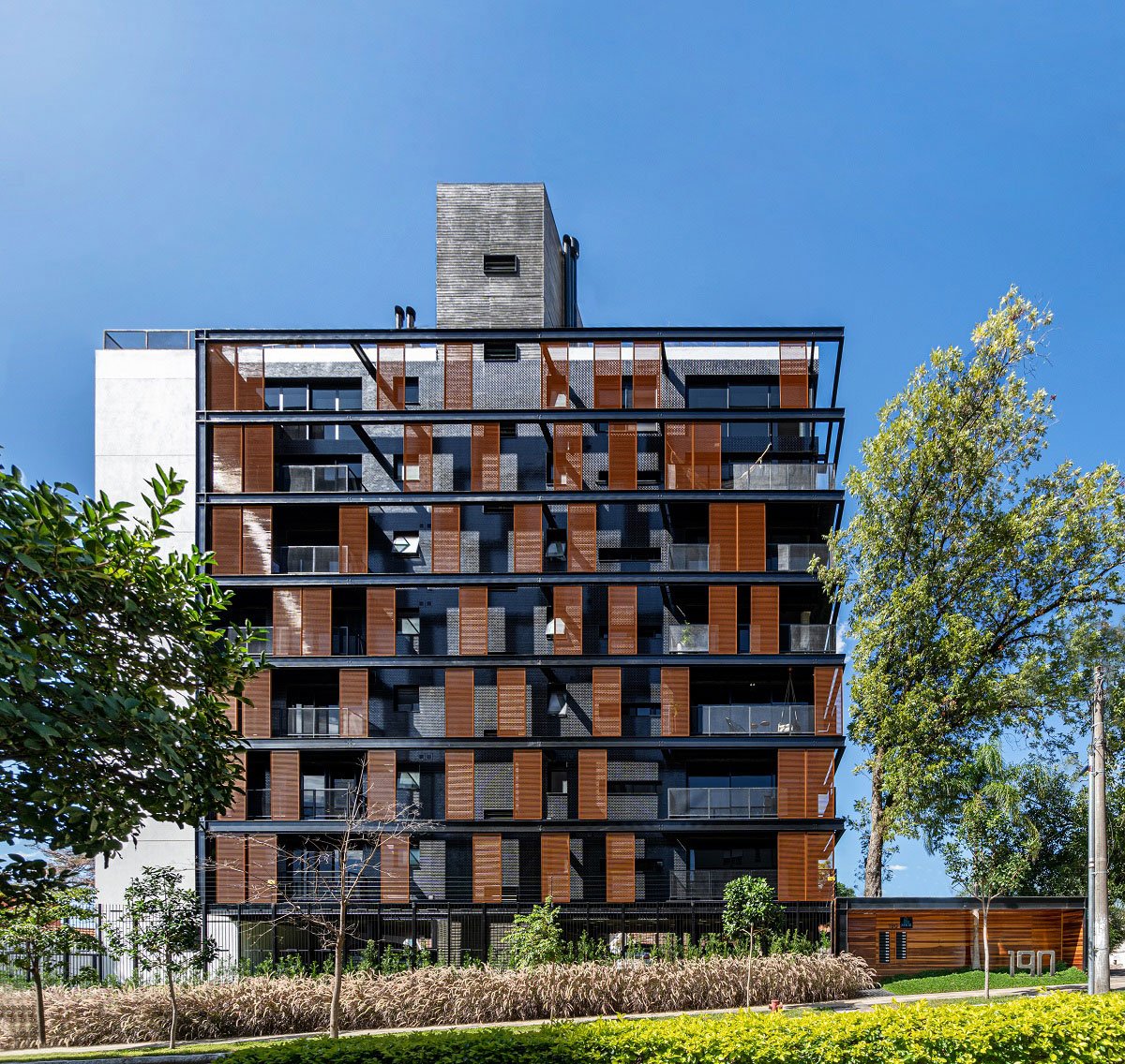 The building’s body rises in a volume suspended by pilotis, generating visual permeability between the streets. Organized in such a way as to take advantage of the exotic shape of the land, the three apartments per floor were distributed in such a way that they were all considered ” front apartment “, the corner one being the most generous in area and visuals. Its position in the lot still respects the large existing walnut tree, which now has a direct relationship with the lower-floor apartments. In the building’s volume, each apartment is a white box, and all of them are articulated by the volume of the vertical circulation, entirely in slatted concrete. The openings were inserted in these white boxes as if they were a black board, generating unity in the different forms. In the west façade, the metal beams were anchored in the existing concrete structure to overcome the great distance between the balconies of the apartments and serve as a rail for the sun protection brises. There are 36 panels formed by a metal frame where aluminum corner pieces are ideally spaced to make the necessary sunscreen. A striking facade with movement that attracts the eyes of those who pass by.